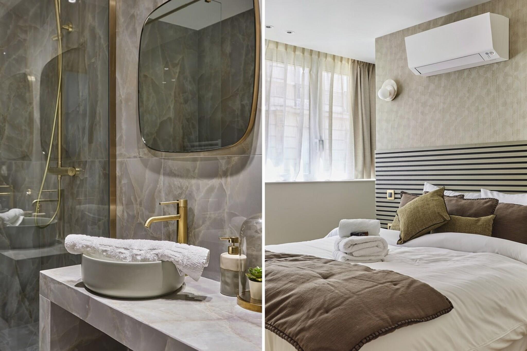 På 1. etage: (Køkken(kogeplade, elkedel, brødrister, komfur, kaffemaskine, ovn, mikrobølgeovn, opvaskemaskine , køleskab, fryser, , , Baking sheet, Coffee, Wine glasses), stue / spisestue(Internetadgang, dobbeltsovesofa, Fjernsyn, spisebord), soveværelse(Queen Bed), Soveværelse med badeværelse(bruser, håndvask, toilet, Håndklæder inkl., , Queen Bed), badeværelse(bruser, håndvask, Håndklæder inkl., )) , , , Førstehjælp, tørretumbler, vaskemaskine, varme, klimaanlæg, strygejern, føntørrer, , , , Carbon monoxide detector, Coffee, Downtown, Shower gel