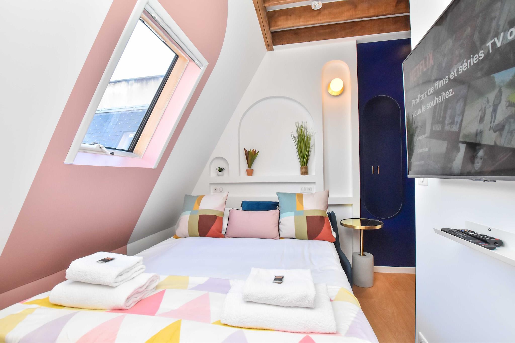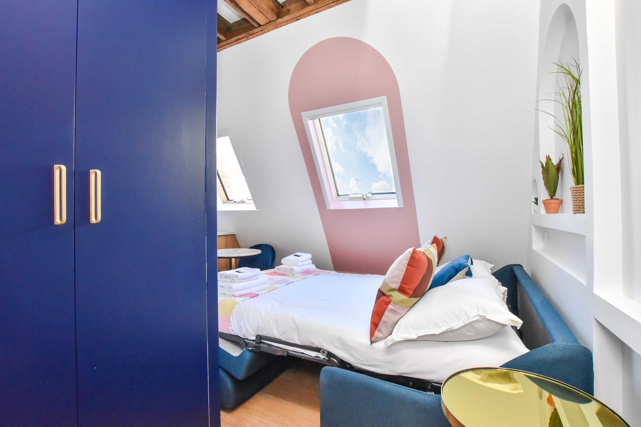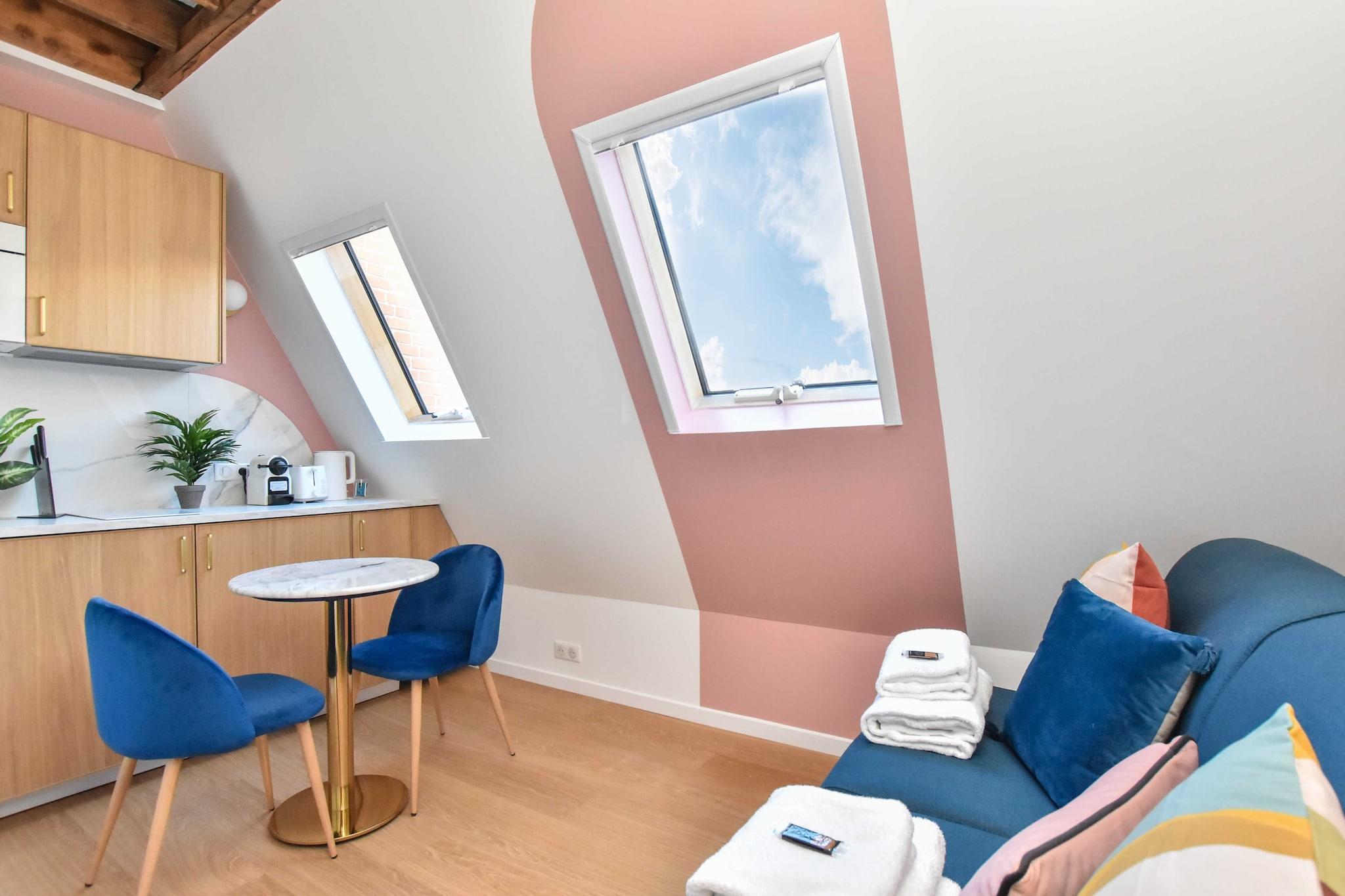 På 7. etage: (Køkken(kakkelovn, kogeplade, elkedel, brødrister, kaffemaskine, combi-mikroovn, køleskab, , ), Stue/soveværelse(dobbeltsovesofa), badeværelse(, bruser, håndvask, toilet, føntørrer, )) , , , , Førstehjælp, Legeområde, Fjernsyn, tørretumbler, vaskemaskine, varme, klimaanlæg, strygejern, Håndklæder/sengelinned (inkl.), , , Carbon monoxide detector, Cleaning Disinfection, Downtown, Enhanced cleaning practices, High touch surfaces disinfected, Long term stays allowed, Town