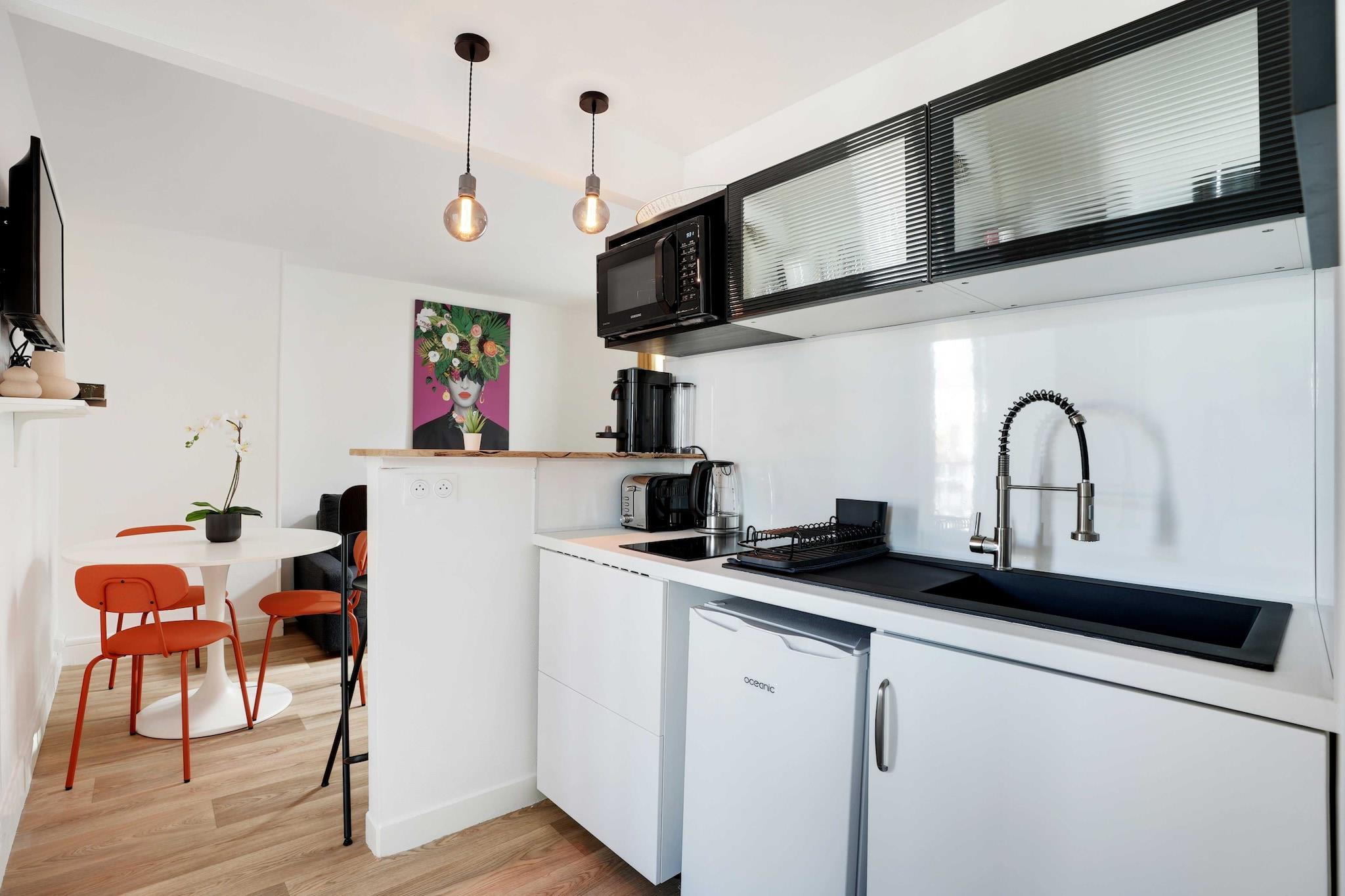 På 6. etage: (Køkken(spisebord, kakkelovn, elkedel, brødrister, kaffemaskine(espresso), mikrobølgeovn, køleskab, elektriske kogeplader, , , Wine glasses), stue / spisestue(enkeltsovesofa), soveværelse(dobbeltseng), soveværelse(dobbeltseng), badeværelse(bruser, håndvask, toilet)) , , , , pulterkammer, Fjernsyn, varme, strygejern, føntørrer, Håndklæder/sengelinned (inkl.), , , Carbon monoxide detector, Enhanced cleaning practices, Long term stays allowed, Room-darkening shades