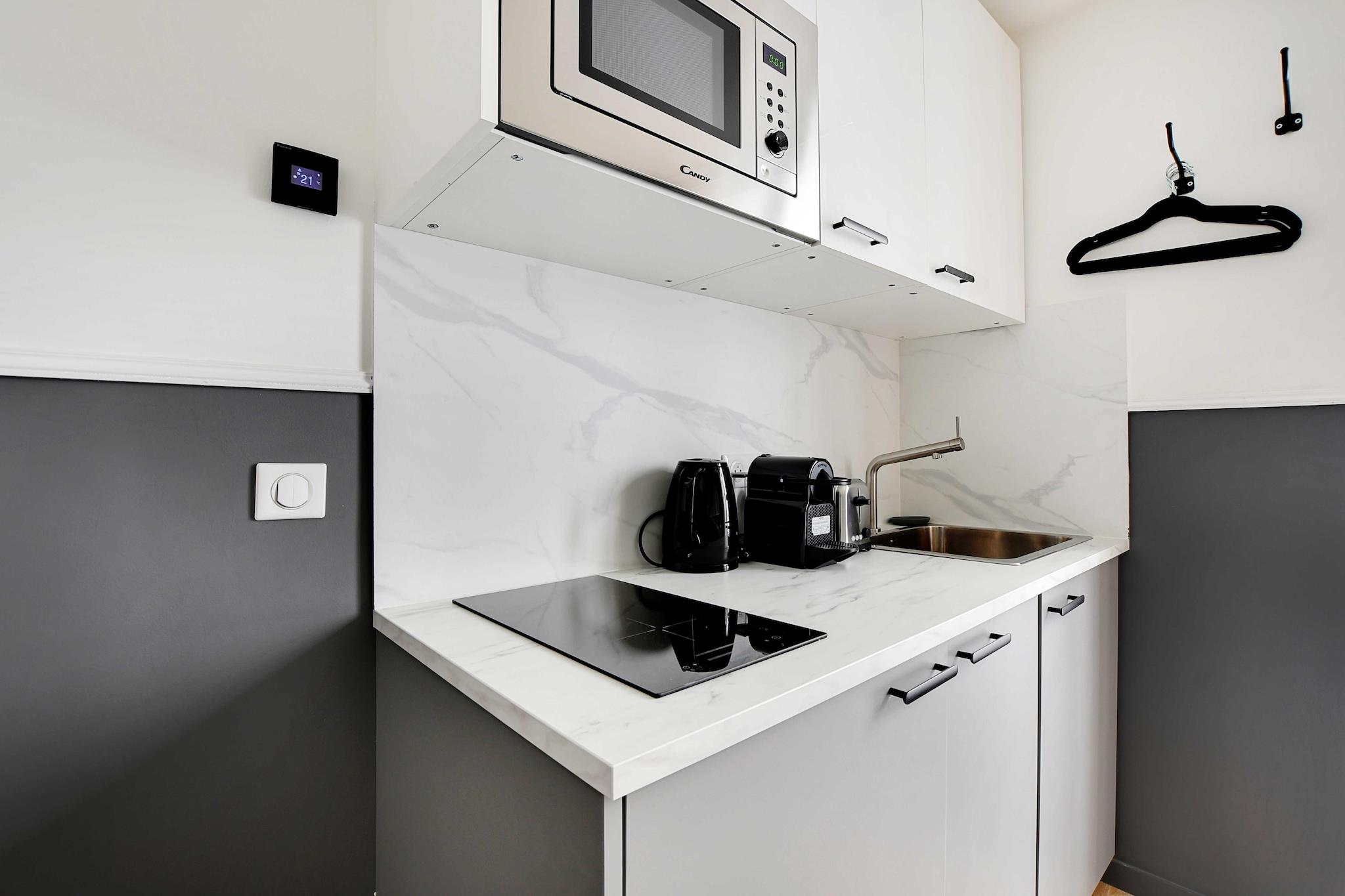 På 1. etage: (Køkken(kakkelovn, elkedel, brødrister, kaffemaskine, mikrobølgeovn, køleskab, ), Stue/soveværelse(, dobbeltseng, Fjernsyn, klimaanlæg), badeværelse(Håndklæder/sengelinned (inkl.), )) , , , Førstehjælp, Legeområde, varme, strygejern, føntørrer, , , , Carbon monoxide detector, Cleaning Disinfection, Downtown, Enhanced cleaning practices, High touch surfaces disinfected, Long term stays allowed, Room-darkening shades, Town