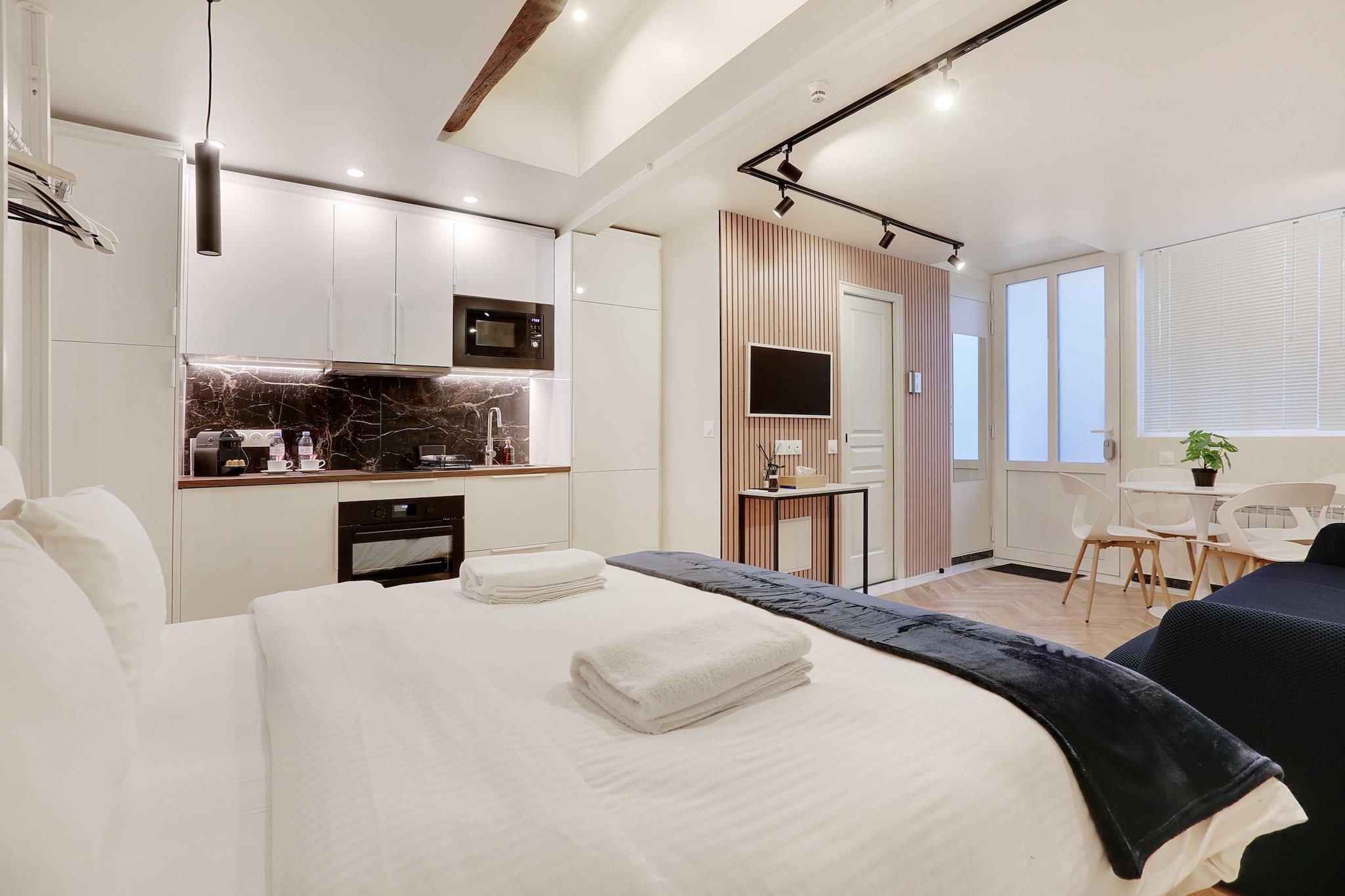 Checkmyguest tilbyder dig denne hyggelige og elegante studiolejlighed, beliggende i hjertet af Montmartre. Ideelt beliggende nær ikoniske seværdigheder, caféer og livlige gader, er det det perfekte udgangspunkt for dit parisiske eventyr. Oplev Paris' charme! Det er nemt at komme rundt i Rue des Abbesses takket være et godt forbundet offentligt transportnetværk. Den nærmeste metrostation, Abbesses (linje 12), ligger kun få minutters gang væk og giver direkte adgang til det centrale Paris. Pigalle station (linje 2 og 12) ligger også cirka 5 minutter væk og tilbyder endnu mere bekvemme forbindelser på tværs af byen. Her er nogle anslåede metrorejsetider fra Rue des Abbesses til de vigtigste vartegn i Paris: Eiffeltårnet: Cirka 25 minutter – tag linje 12 til Concorde, derefter linje 8 til École Militaire. Louvre: Cirka 15 minutter – tag linje 12 til Concorde, derefter linje 1 til Palais Royal – Musée du Louvre. Notre-Dame-katedralen: Omkring 20 minutter – linje 12 til Concorde, derefter linje 1 til Châtelet, efterfulgt af en kort gåtur. Champs-Élysées: Omkring 15 minutter – linje 12 til Concorde, derefter linje 1 til Franklin D. Roosevelt. Montmartre-området er også godt betjent af busser, cykeldelingsstationer og lettilgængelige taxaer eller samkørselstjenester (såsom G7-taxaer på 36 07), så du kan udforske Paris i dit eget tempo. ?? Busser (dag og nat) ?? Vélib" cykelstationer ?? Nem adgang til taxaer, især gennem G7