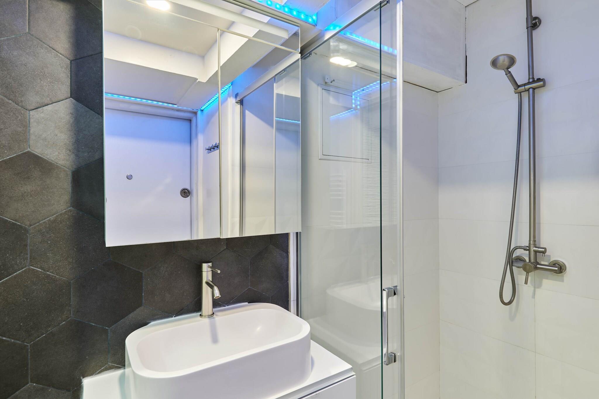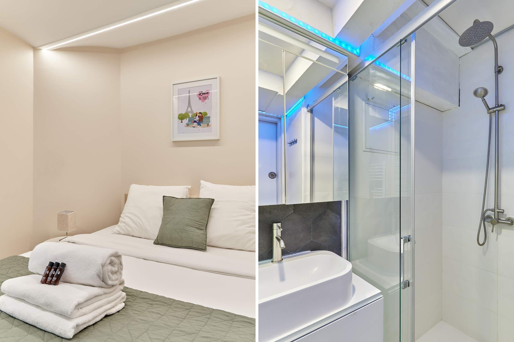 På 1. etage: (Køkken(spisebord, elkedel, brødrister, kaffemaskine, mikrobølgeovn, køleskab, fryser, varme, , , Baking sheet, Wine glasses), soveværelse(Queen Bed), soveværelse(Queen Bed), badeværelse(bruser, toilet), badeværelse(bruser, toilet)) , , , Førstehjælp, Fjernsyn, klimaanlæg, strygejern, føntørrer, , , , Carbon monoxide detector, Cleaning products, Coffee, Downtown, Extra pillows and blankets, Room-darkening shades, Shower gel