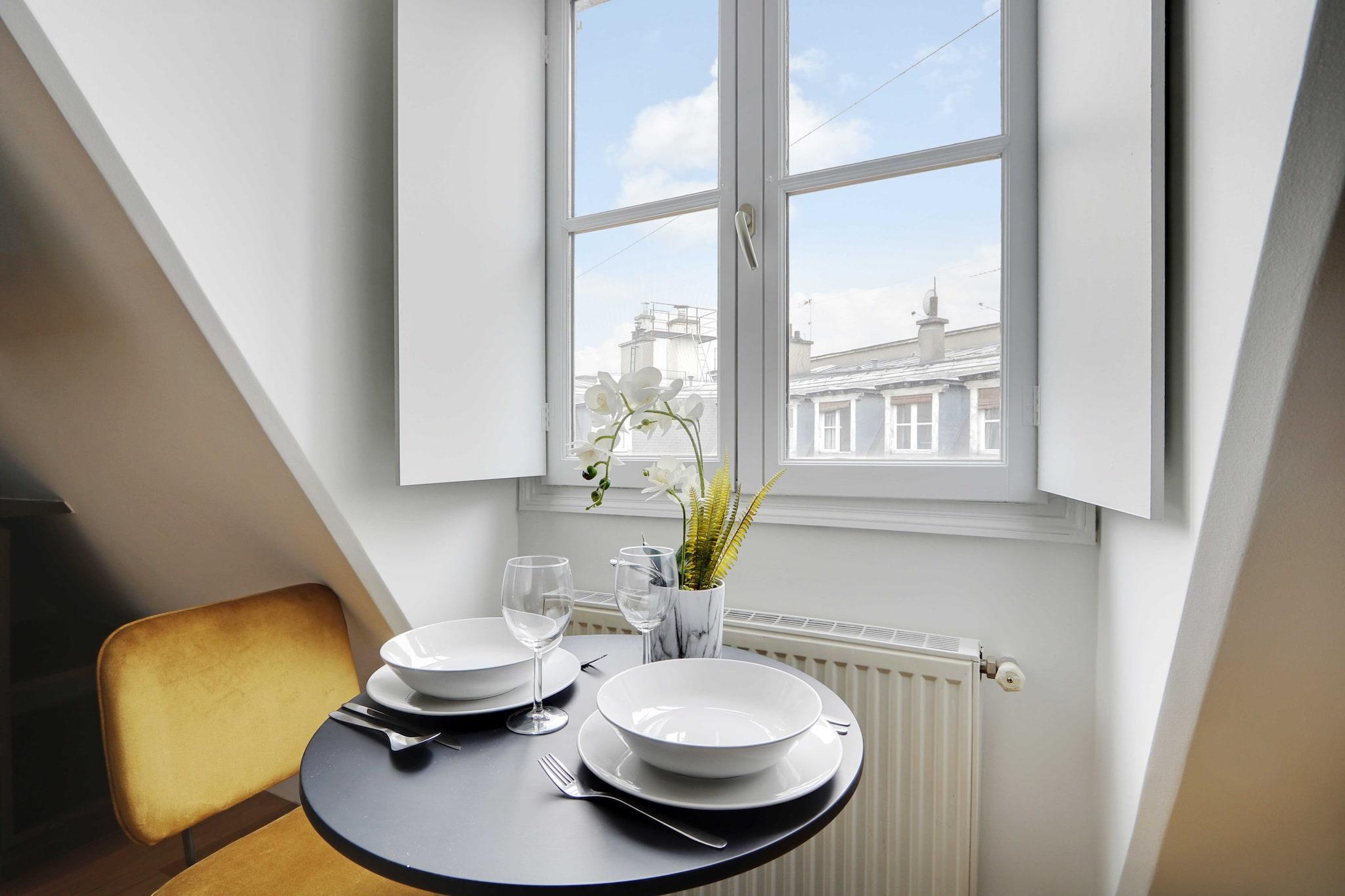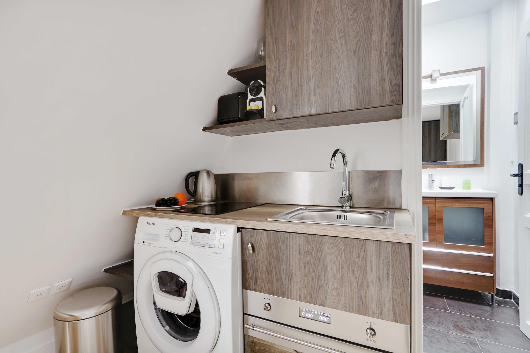 På 6. etage: (Køkken(kakkelovn, elkedel, brødrister, kaffemaskine, ovn, mikrobølgeovn, køleskab, vaskemaskine, ), Stue/soveværelse(, , enkeltsovesofa, Fjernsyn), badeværelse(bruser, toilet, føntørrer, Håndklæder/sengelinned (inkl.), )) , , , Førstehjælp, Legeområde, varme, strygejern, crib(free), , , , Carbon monoxide detector, Cleaning Disinfection, Downtown, Enhanced cleaning practices, High touch surfaces disinfected, Long term stays allowed, Room-darkening shades, Town