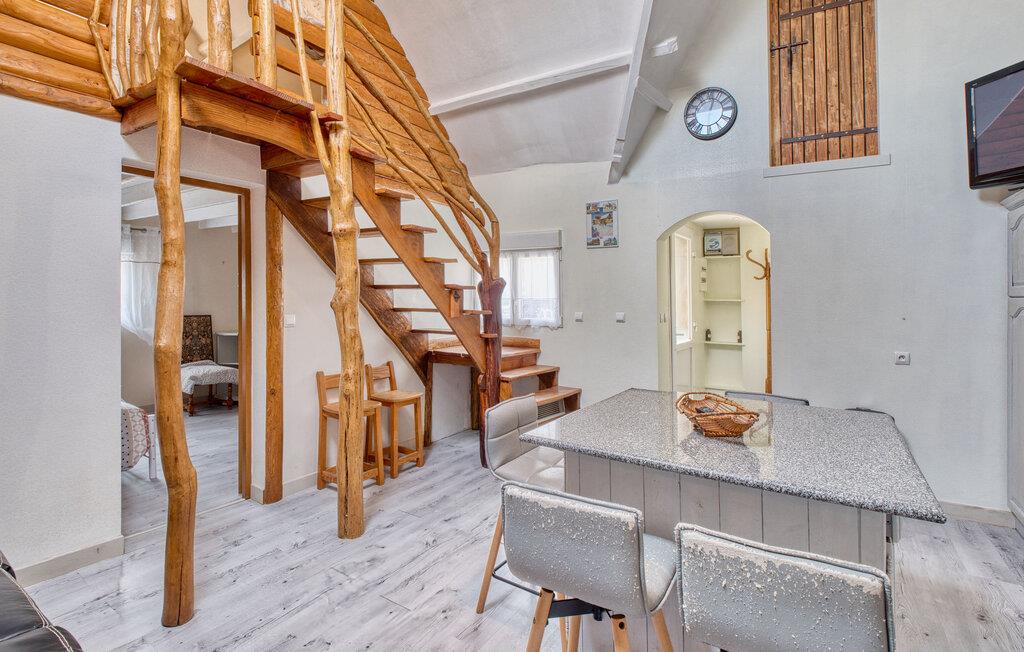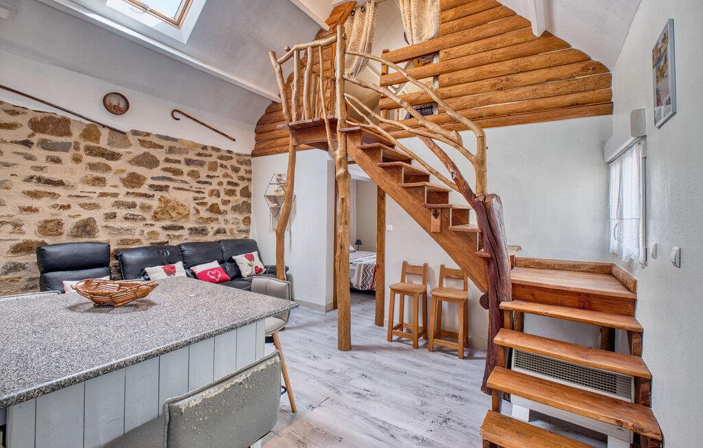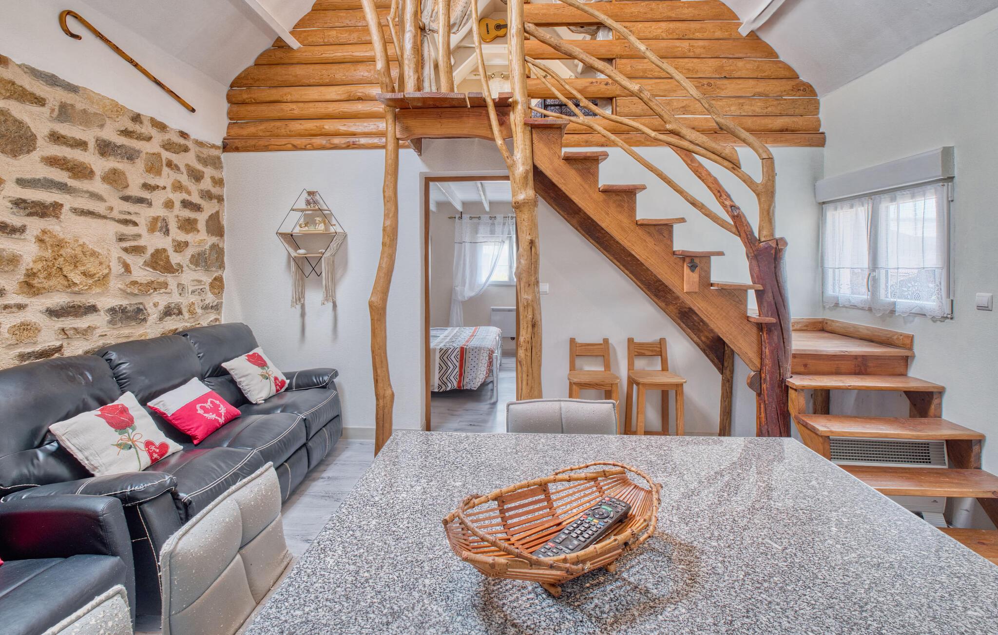 Jeres kærligt designede feriehus byder jer velkommen med en vellykket blanding af rustik charme, moderne faciliteter og et rummeligt udendørsområde. Nyd freden og roen, og tilbring afslappende dage med familie eller venner omgivet af naturen. Find jer til rette i det åbne opholdsområde. Den hyggelige stue med naturstensvæg, sofahjørne og pejs tilbyder en behagelig atmosfære til afslapning.