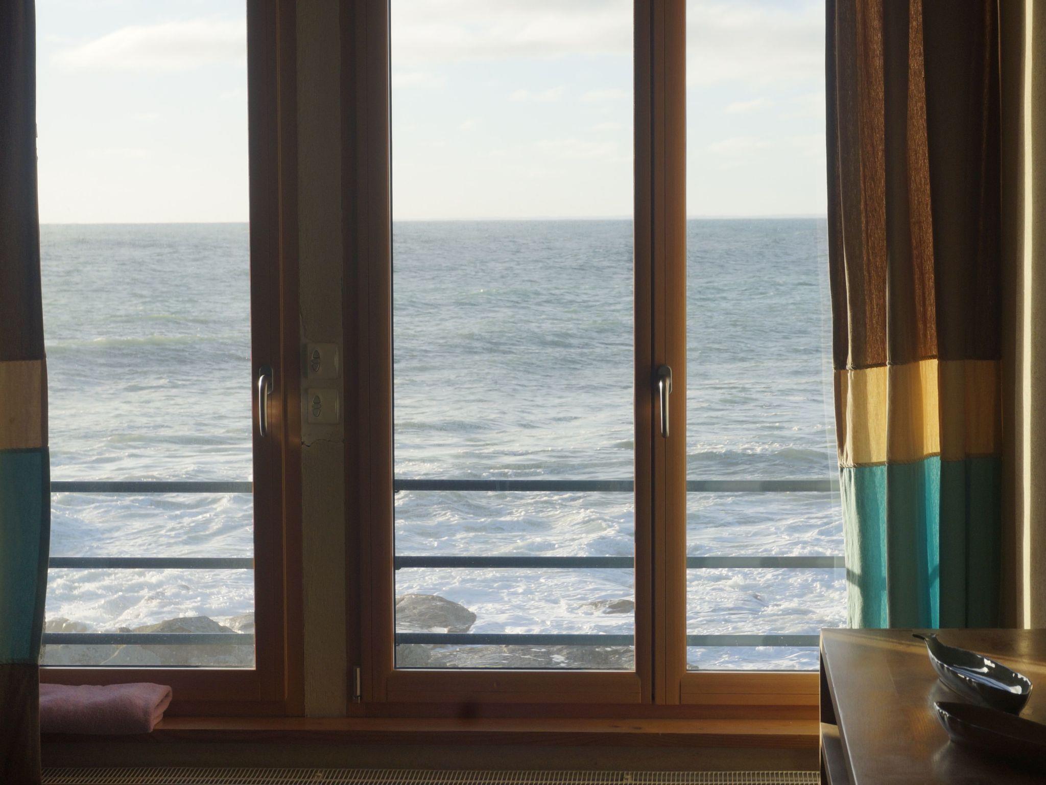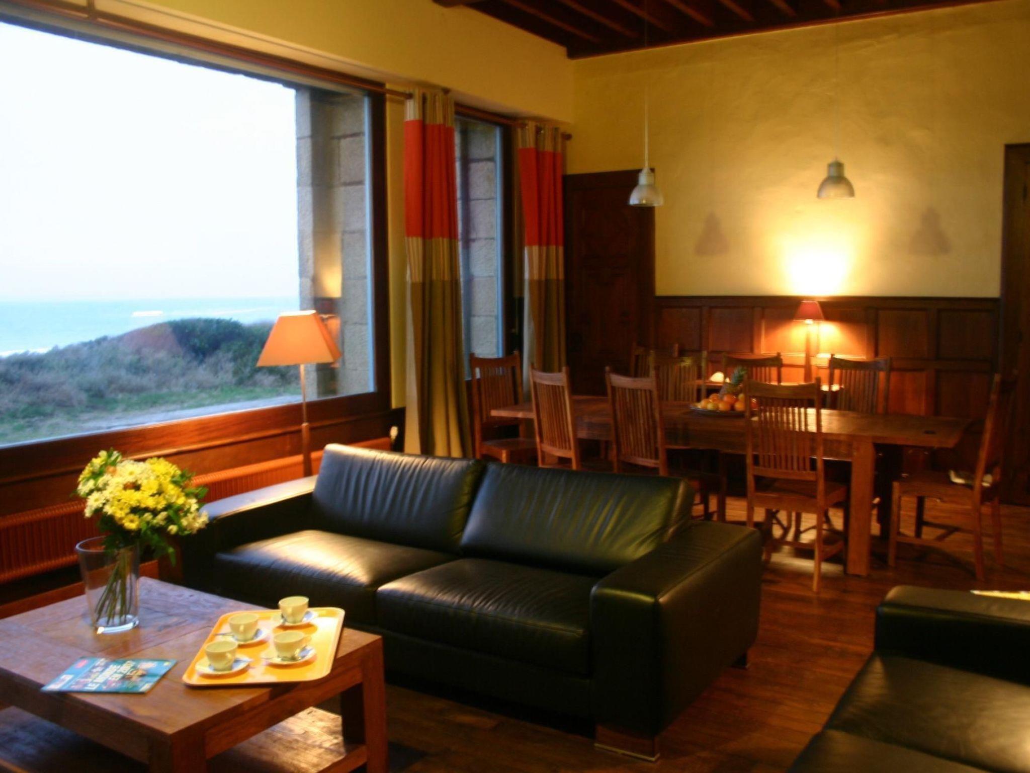 When you enter the house, you arrive in a large hall with wood panelling and a staircase leading to the upper floor. The separate 16 m2 kitchen is fully equipped with a traditional gas cooker, dishwasher, microwave, fridge-freezer, coffee machine, toaster and other cooking utensils. The 40 m² living room with exposed beams doubles as a lounge and dining area. Here you can relax on leather sofas in front of the fireplace, look out over Audierne Bay through the large picture windows or watch TV together. A stereo system is also available. Also on the ground floor of the building is a 14 m² bedroom with a 1.60 m wide double bed. This room has its own bathroom. Both the bedroom and bathroom are suitable for people with reduced mobility. A guest toilet and laundry room with washing machine and tumble dryer complete the facilities on the ground floor. Upstairs, there are three further bedrooms for a good night's sleep: a large 23 m² bedroom with a sea view and a double bed (1.60 m wide). The second bedroom, measuring 20 m², has two single beds (90 cm wide) and a sea view. The third bedroom also has a sea view and a view of the garden. It measures 26 m2 and is furnished with three single beds (90 cm wide). In the bathroom, treat yourself to a wellness bath in a beautiful bathtub resting on lion paws. There is also a large shower and two washbasins. The toilet is separate.