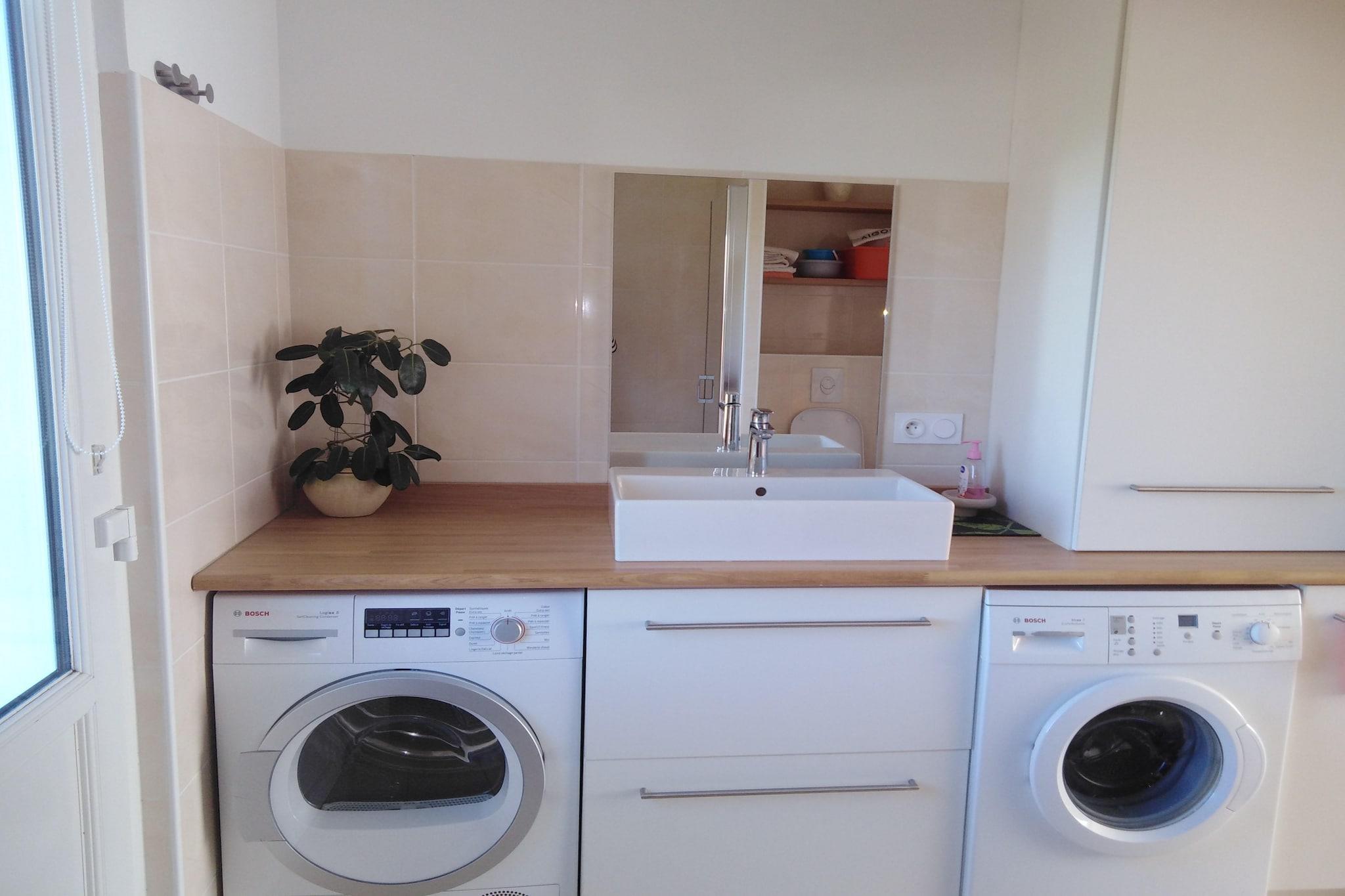 Stueetage: (Køkken(elkedel, brødrister, komfur(gas), kaffemaskine, ovn, mikrobølgeovn, køleskab, fryser), stue / spisestue(Fjernsyn), soveværelse(dobbeltseng(160 x 200 cm), Fjernsyn), badeværelse(bruser, toilet), toilet) På 1. etage: (soveværelse(king size-seng(180 x 200 cm)), soveværelse(enkeltseng(140 x 190 cm)), soveværelse(enkeltseng(160 x 200 cm)), badeværelse(badekar), toilet) tørretumbler, vaskemaskine, varme(elektrisk), have(1000 m2), havemøbler, parkering, parkering, liggestole