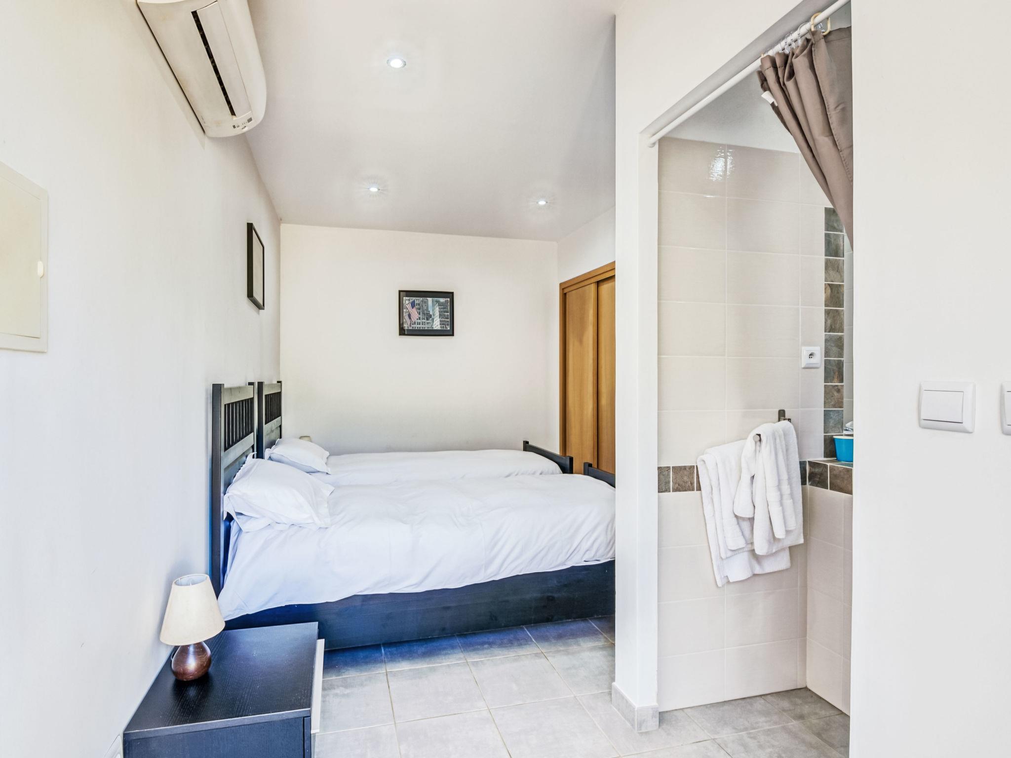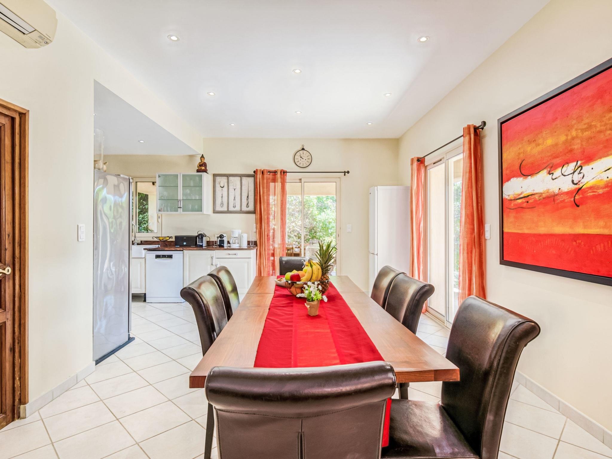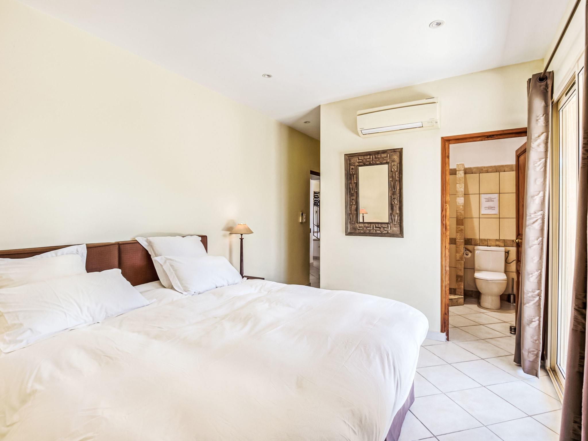 6-room villa 250 m2 on 2 levels. Beautiful and cosy furnishings: large living/dining room with TV (flat screen). Exit to the terrace. 2 rooms, each room with 1 french bed (180 cm, length 200 cm), shower/WC. Exit to the terrace. 1 room with 2 beds (90 cm, length 190 cm), shower/WC. Exit to the terrace. 1 room with 2 beds (90 cm, length 190 cm), shower/WC. Large, open kitchen (4 hot plates, oven, dishwasher, microwave, freezer, electric coffee machine). Upper floor: 1 room with 1 french bed (160 cm, length 200 cm). Exit to the balcony. Bathroom, sep. WC. Air-conditioning, forced-air heating. Large terrace 50 m2. Terrace furniture, deck chairs (10). View of the garden. Facilities: washing machine, iron, children's high chair, baby cot for up to 3 year olds, hair dryer. Internet (WiFi, free). Please note: two of the bedrooms on the ground-floor, are located in the adjoining house, with separate entrance.