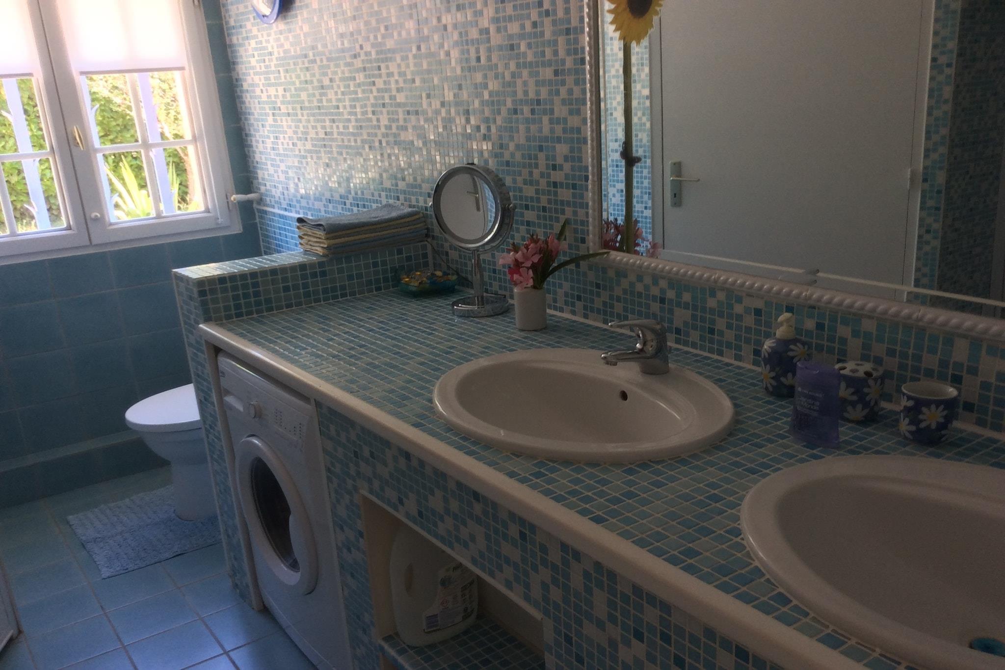 Stueetage: (Stue(dobbeltsovesofa, Fjernsyn(fladskærm), DVD-afspiller, klimaanlæg), åbent køkken(kaffemaskine, ovn, mikrobølgeovn, opvaskemaskine , køle-fryseskab), soveværelse(dobbeltseng), soveværelse(enkeltseng, køjeseng, klimaanlæg), badeværelse(bruser, toilet)) carport, bruser, vaskemaskine, patio, varme, terrasse(privat), have(indhegnet), havemøbler, grill, swimmingpool(deles med ejer, indhegnet, 10 x 5 m., opened from 1/2 Apr upto and including Oct), petanquebane, legeredskaber, bordtennisbord, barneseng, barnestol, Pladegrill