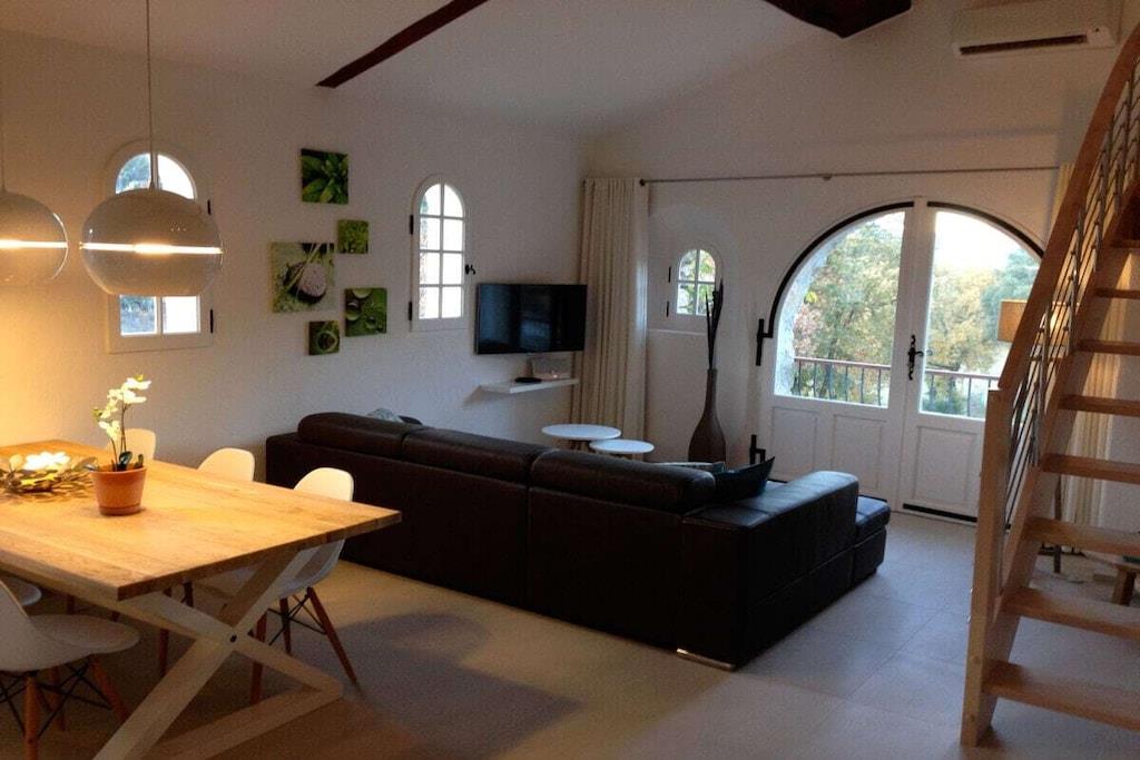 Diese schöne Ferienwohnung befindet sich in einer schönen Anlage aus dem 16. Jahrhundert in der Nähe von Plan de la Tour entfernt. Diese schöne Ferienwohnung ist geräumig und mit modernem Design für 4 Personen eingerichtet. Voll ausgestattet mit einer Klimaanlage. Das gemütliche Wohnzimmer öffnet sich zu einem Französisch Balkon mit herrlichem Ausblick. Die Küche ist komplett ausgestattet. Das Bad strahlt Komfort und ist mit einer Dusche, schöne Waschbecken und Toilette ausgestattet. Die private Terrasse ist am Pool gelegen, gibt es einen Esstisch für 6 Personen und ein großer Sonnenschirm für Sie. Ein elektrischer Grill kann an der Rezeption gemietet werden.
