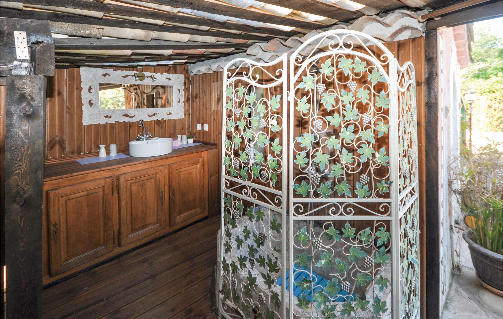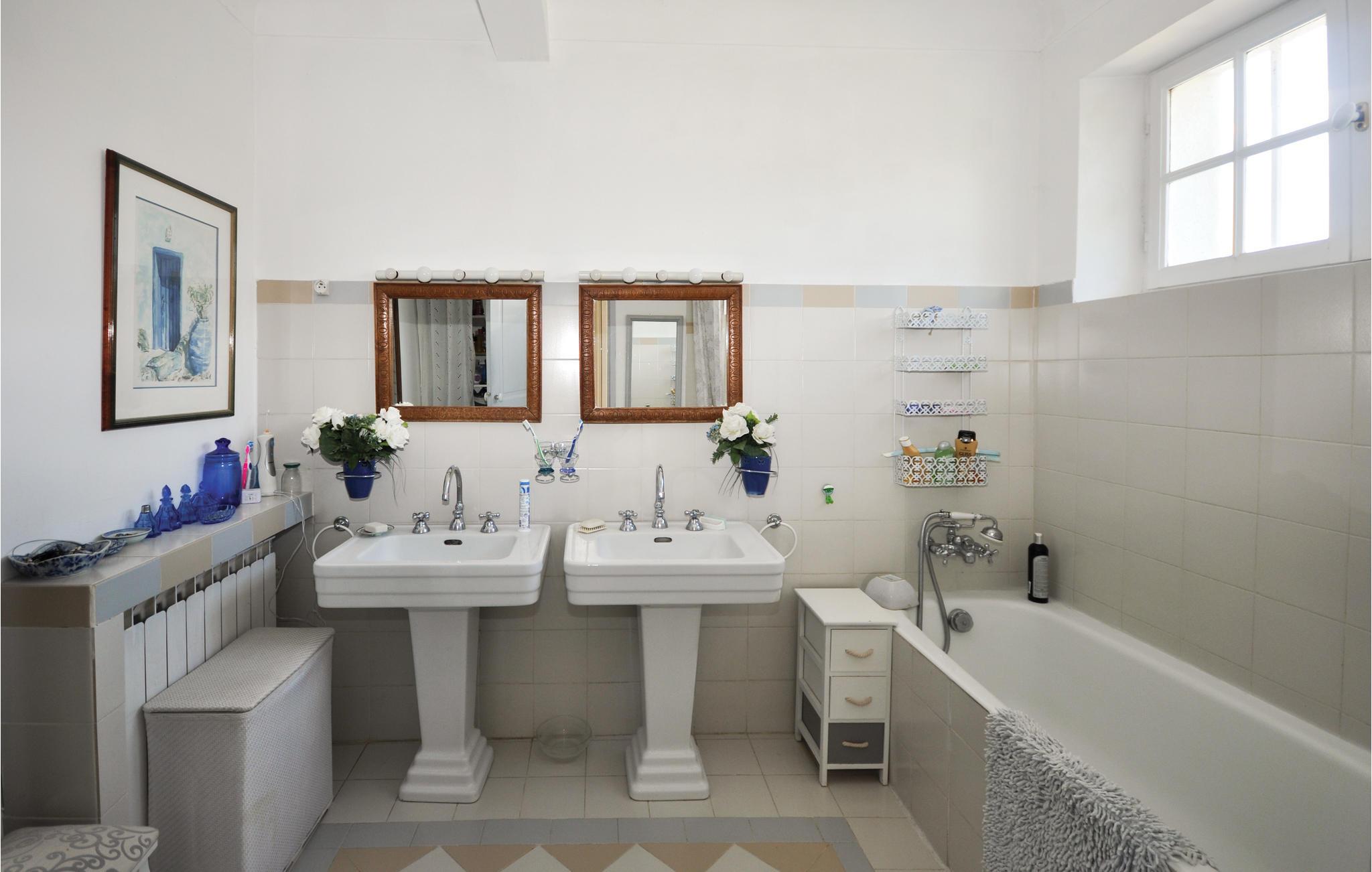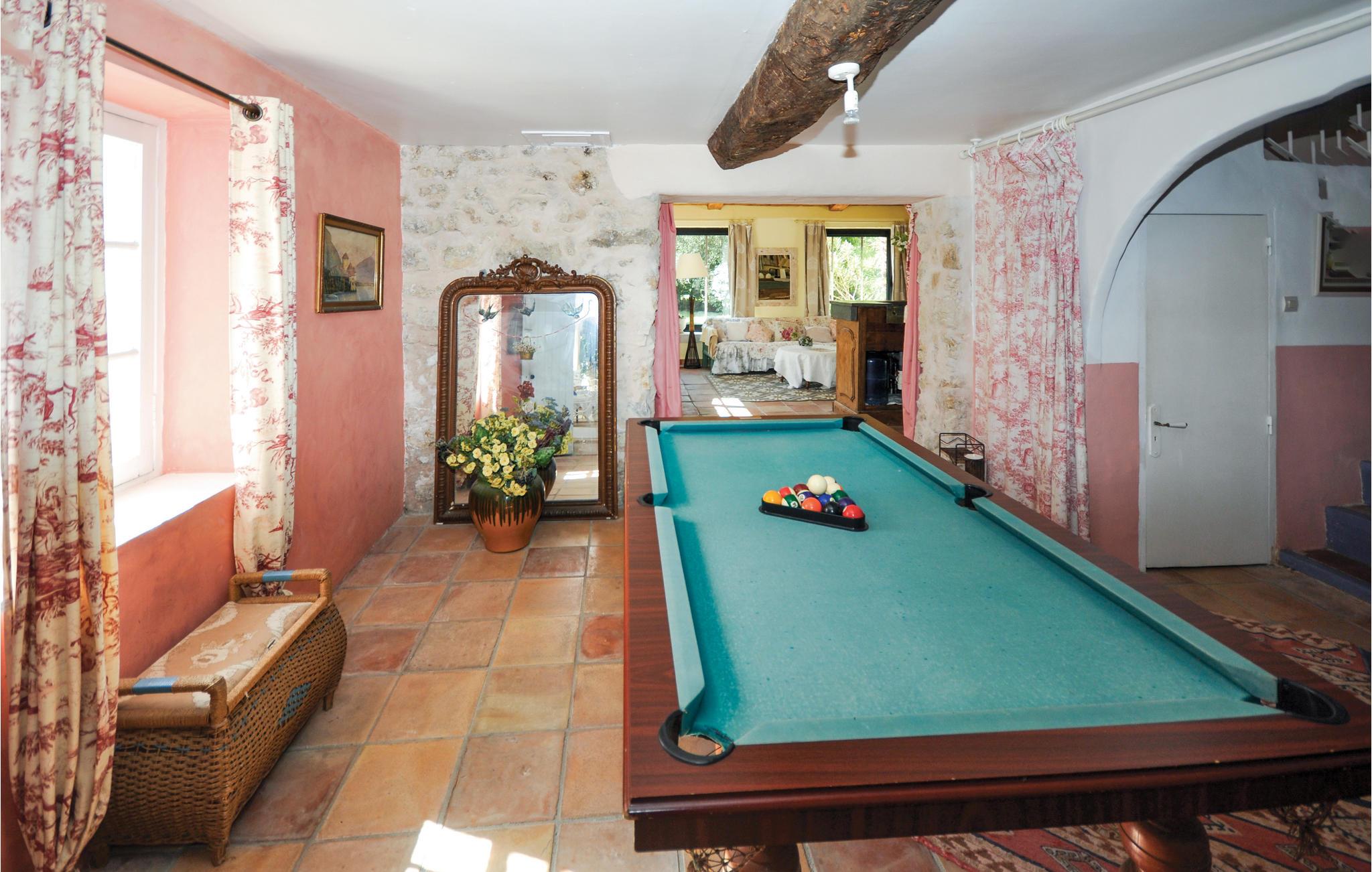 Denne meget dejlige feriebolig med pool lover en uforglemmelig ferie ved Côte d’Azur. Det fjerde badeværelse ligger i stuen ved siden af billardbordet og er adskilt af et forhæng.