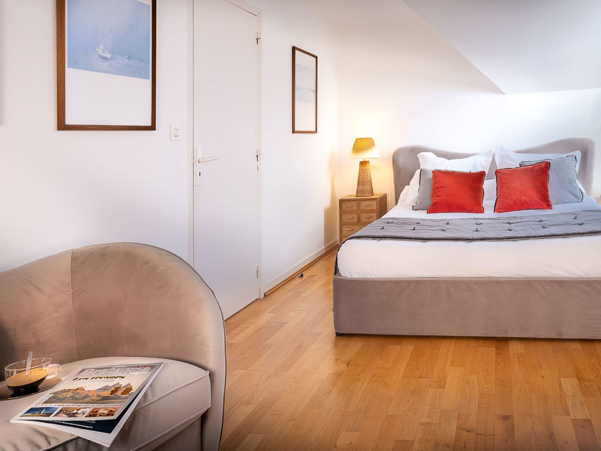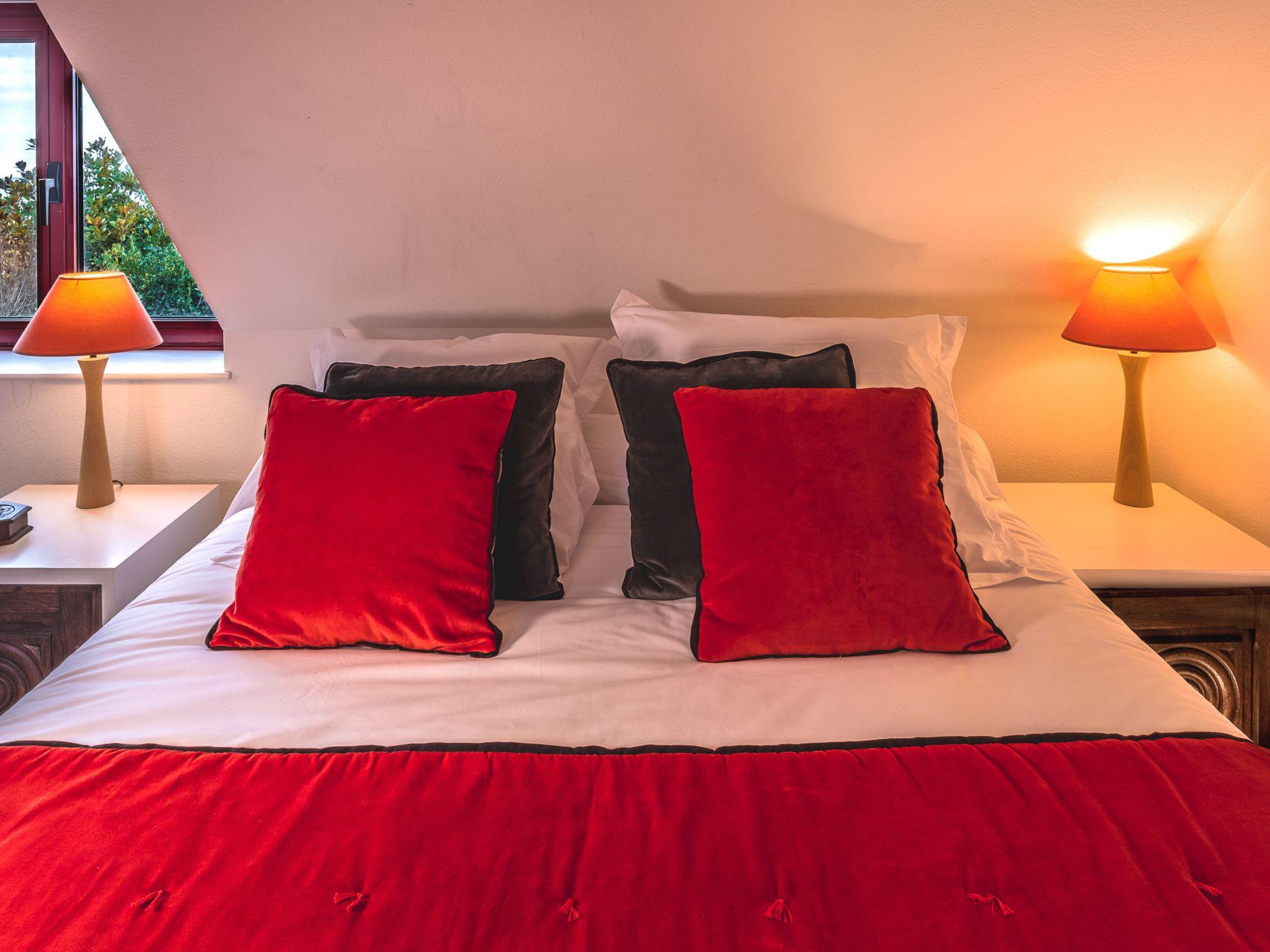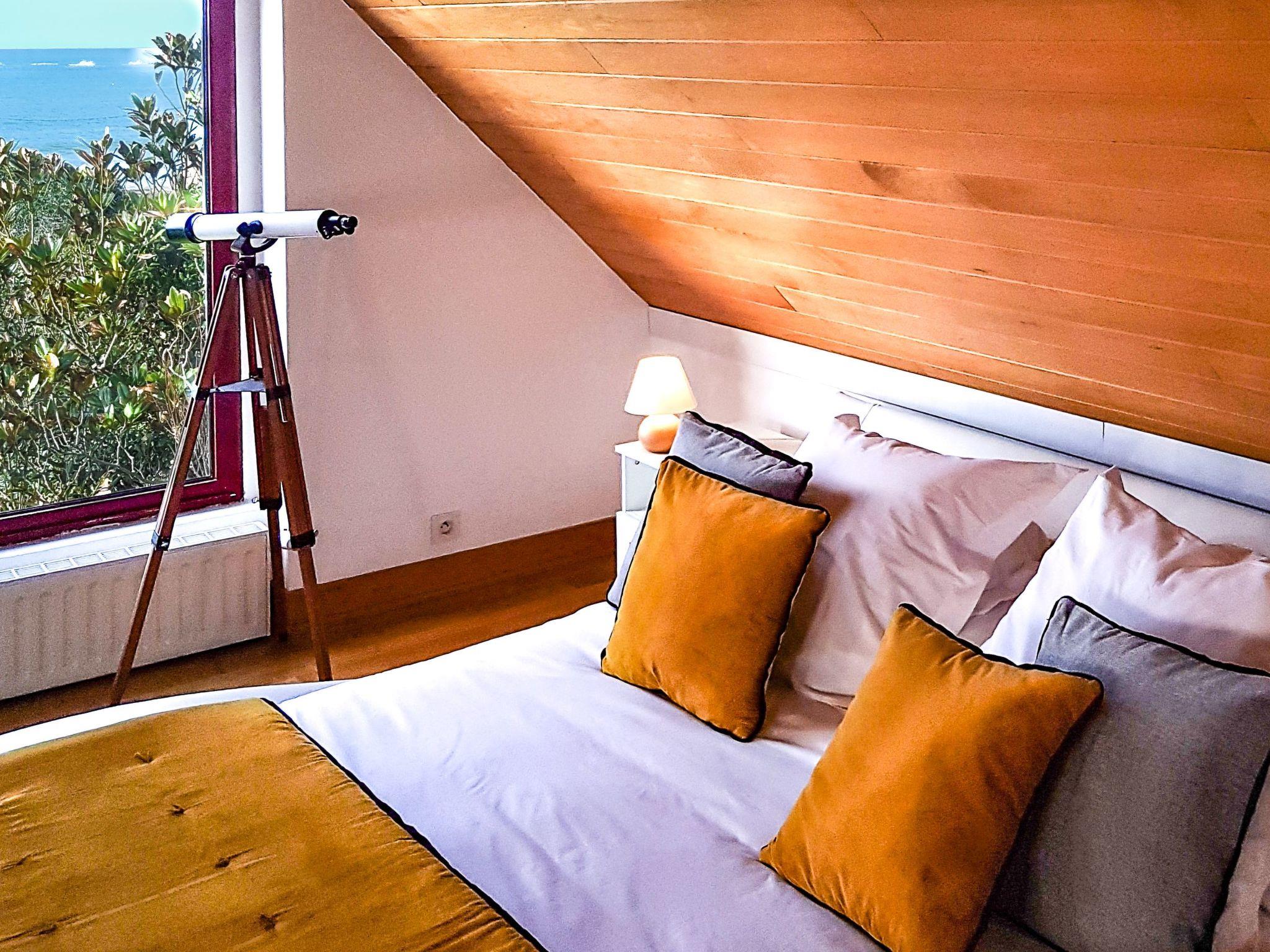 Also on the upper floor, the "parental suite" with sea view occupies more than 30m2, it is furnished in typical Breton style, this one has a queen-size double bed (160x200). A second large bedroom, similar to a suite, is accessible from the ground floor and has a double bed. It is furnished in an understated style and offers a view of the garden and the sea. The bathroom, laundry room and WC are located next to this room.