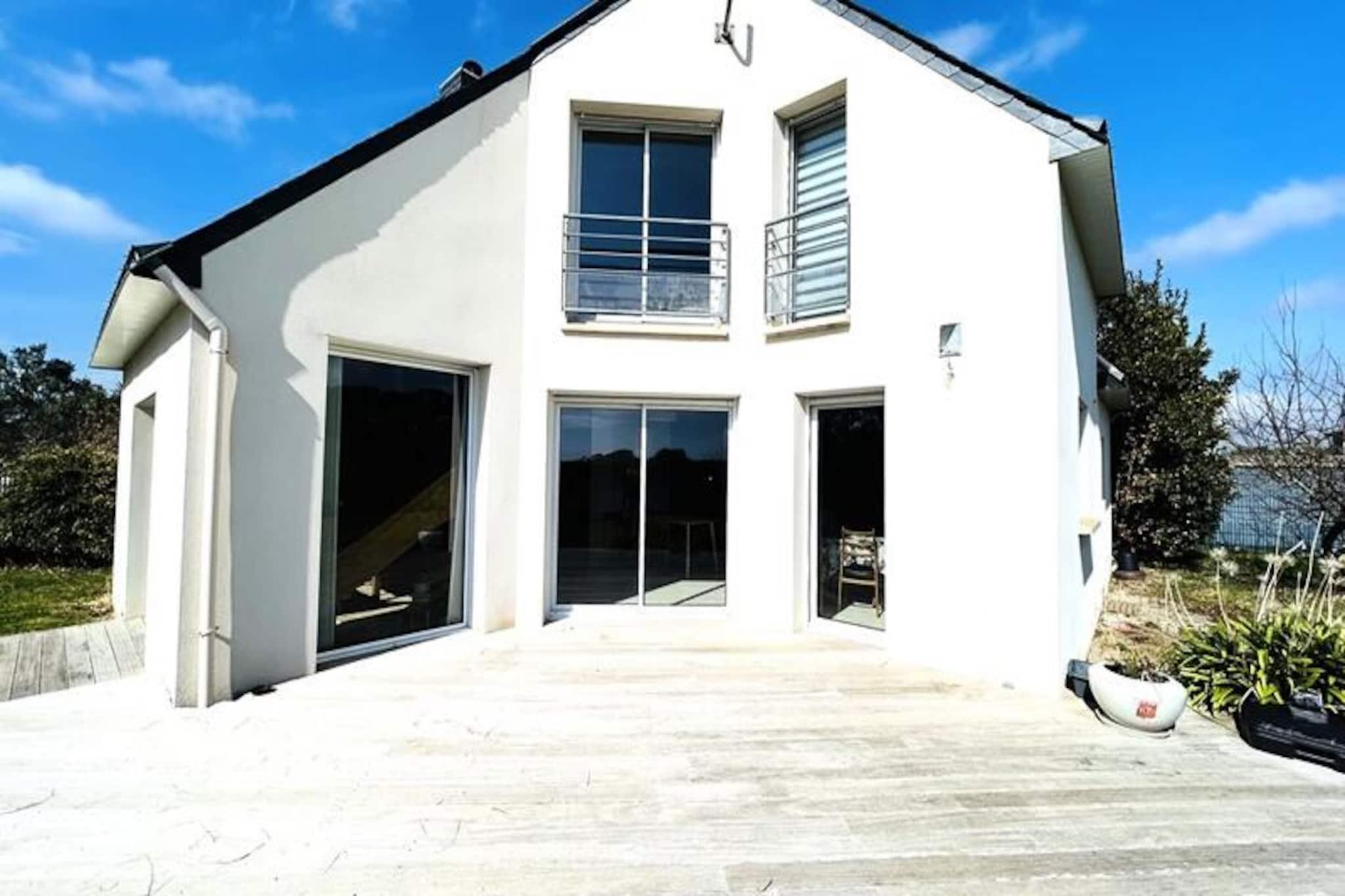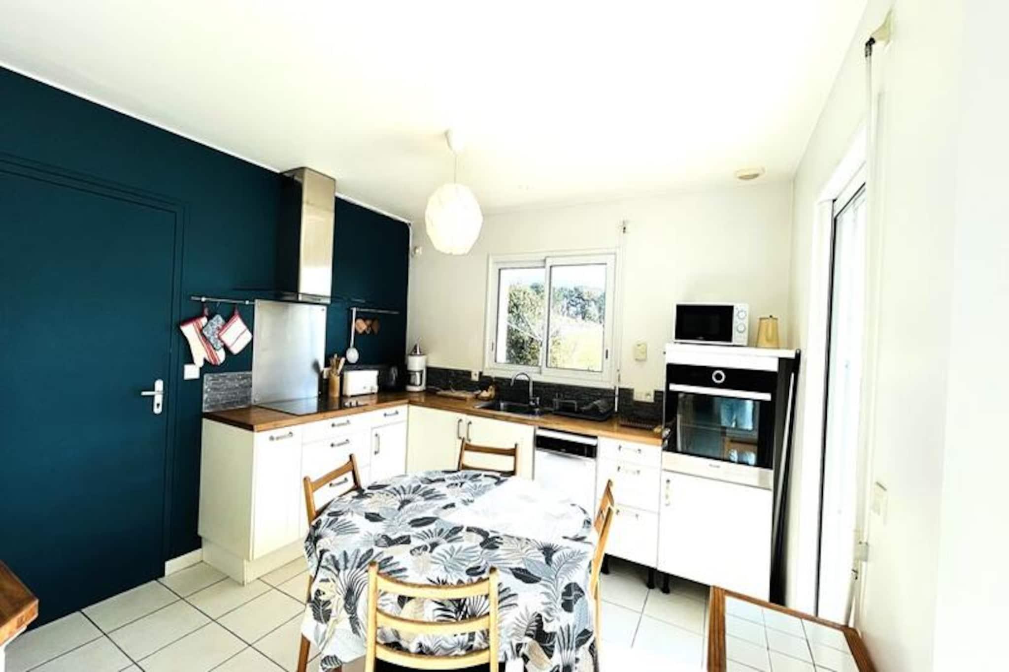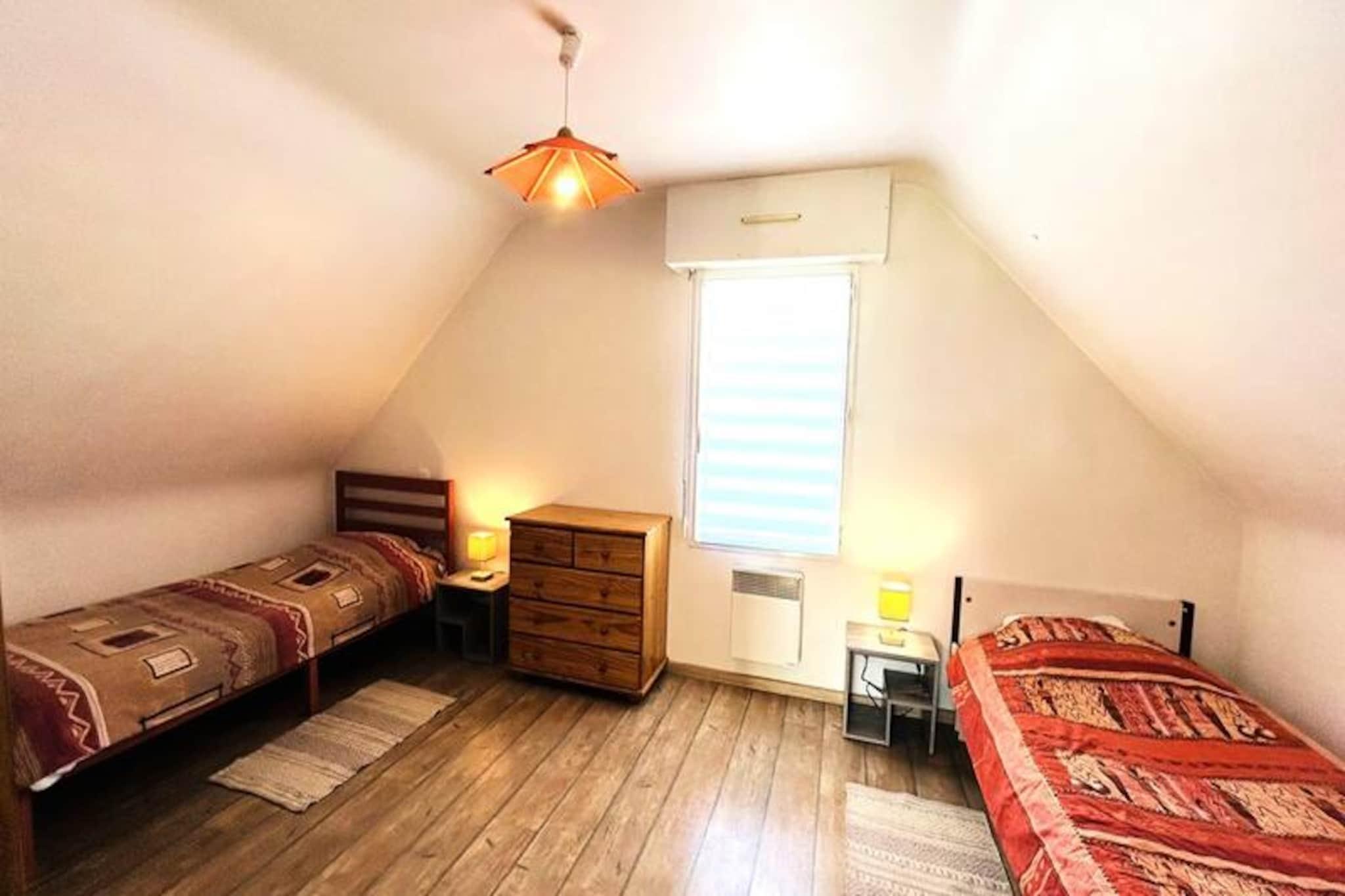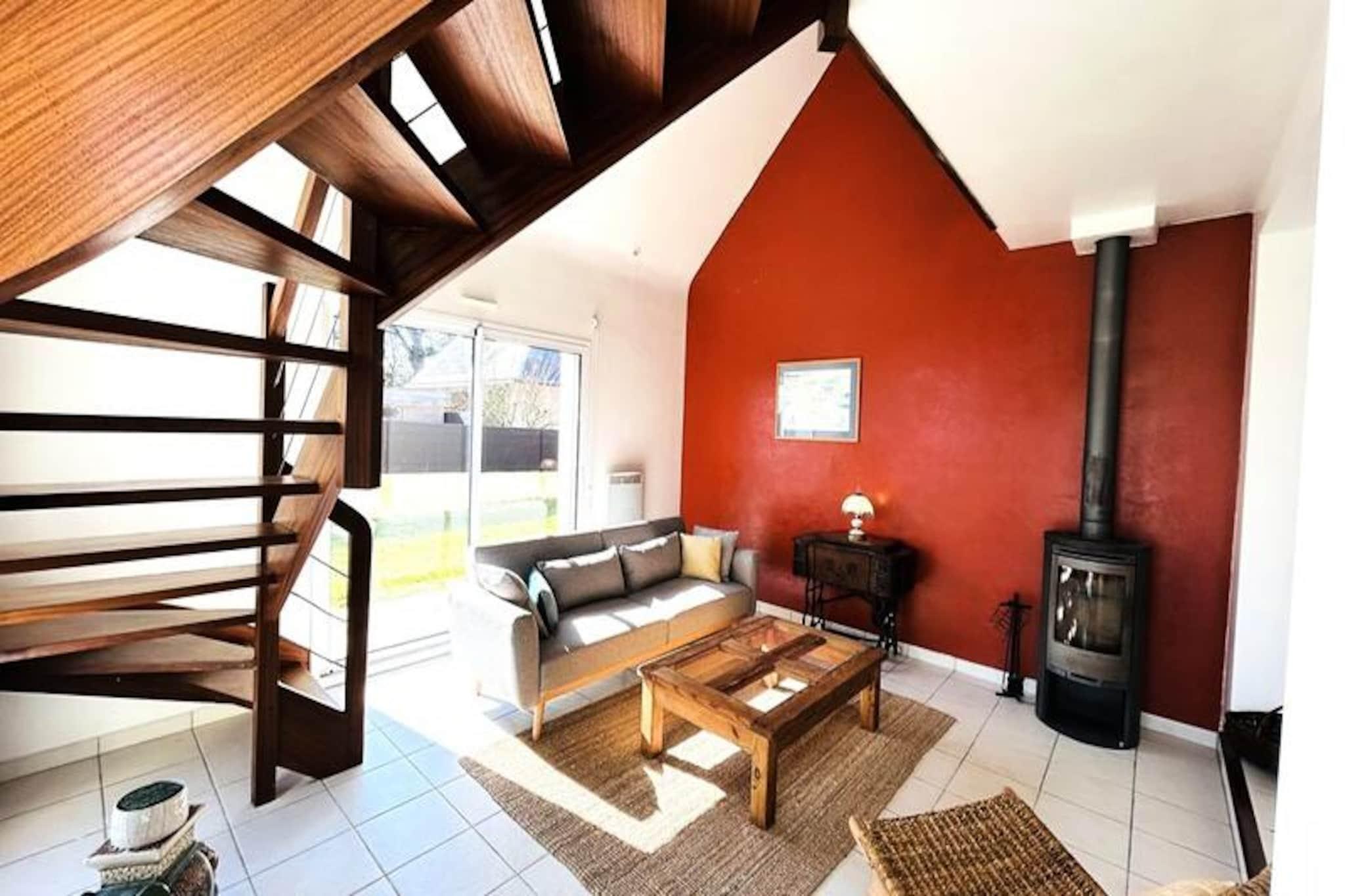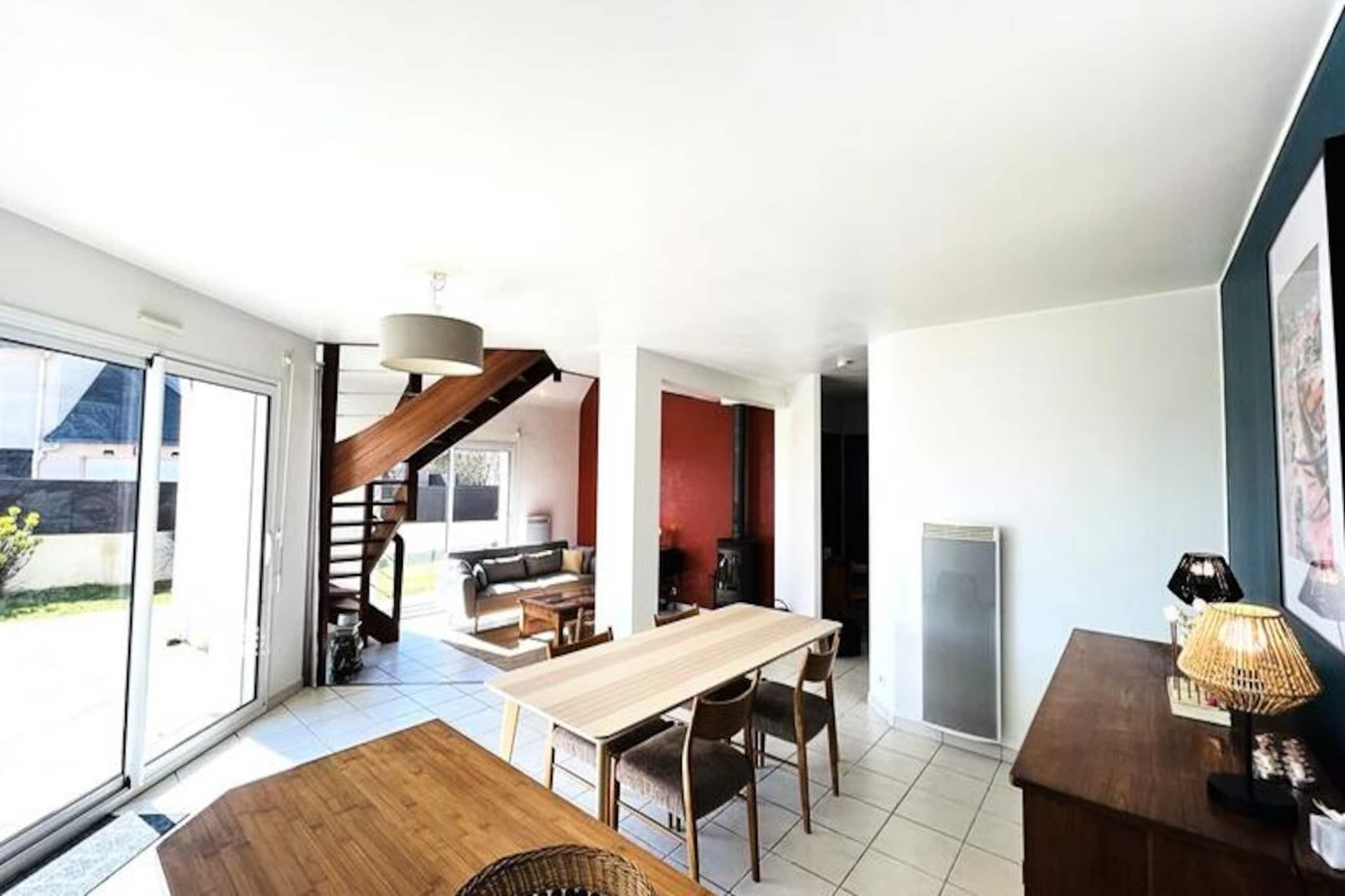 Hvor den blide havbrise møder Bretagnes charme, tilbyder dette dejlige hus på 106 m² i Fort-Bloqué en rolig oase kun 500 meter fra stranden. Forestil dig morgener med at nippe til kaffe på den store træterrasse, omgivet af den frodige grønne have, og eftermiddage med at udforske den 4 km lange strækning af fin sandstrand, der forbinder Fort-Bloqué med Guidel-Plages. Uanset om du søger ro eller eventyr, er dette hjem din port til kystnære lyksalighed. \n\nTræd indenfor og oplev et gennemtænkt designet rum, der kombinerer komfort og praktisk anvendelighed. Stueetagen har et fuldt udstyret åbent køkken, en hyggelig stue med opholdsstue og spiseplads, der åbner ud til haven, et moderne badeværelse med bruser og toilet samt et indbydende soveværelse med dobbeltseng. Ovenpå finder du yderligere to indbydende soveværelser, et med dobbeltseng og det andet med to enkeltsenge, et badeværelse med badekar og toilet samt en mezzanin med sovesofa og tv-område. Der er tænkt på alle detaljer, fra Wi-Fi og fjernsyn til opvaskemaskine, vaskemaskine og grill, hvilket sikrer et problemfrit ophold.\n\nBeliggenheden er ideel til at udforske regionens naturlige skønhed og livlige aktiviteter. Med et gratis Pass' Air&Mer-kort kan du nyde reducerede priser på vandsport og fritidsaktiviteter i nærheden. Cykelstien langs havet inviterer dig til at opleve en betagende udsigt over kysten, mens de nærliggende byer Guidel-Plages og Lorient tilbyder kulturelle og kulinariske lækkerier.\n\nDette charmerende hus er perfekt til familier, venner eller par og lover uforglemmelige øjeblikke i Bretagne. Uanset om du slapper af i haven, slentrer langs stranden eller begiver dig ud på eventyr, er dette dit hjem væk fra hjemmet ved havet.