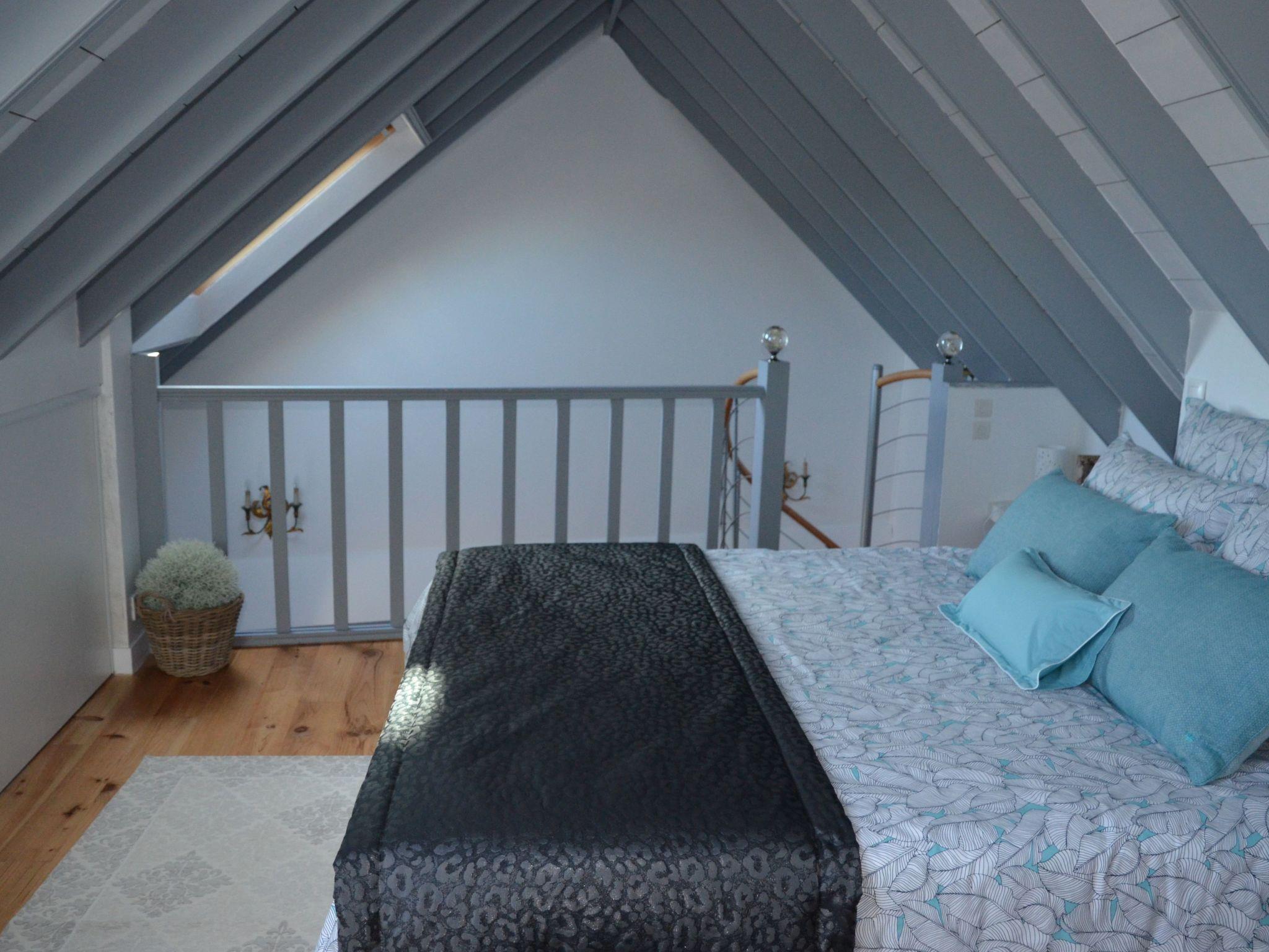 The ground floor comprises a living room with a wood-burning stove, a flat-screen TV and a two-seater leather sofa and lounger. Next to the living room is a new, fully-equipped built-in kitchen with induction hob, oven, microwave, coffee maker, kettle, teapot, toaster, dishwasher and dining area. Next to the kitchen is a bathroom with shower and washbasin, hairdryer, washing machine and WC. A spiral staircase leads to the first floor, where there is a mezzanine bedroom with a 160*200 bed, cupboard and wardrobe.