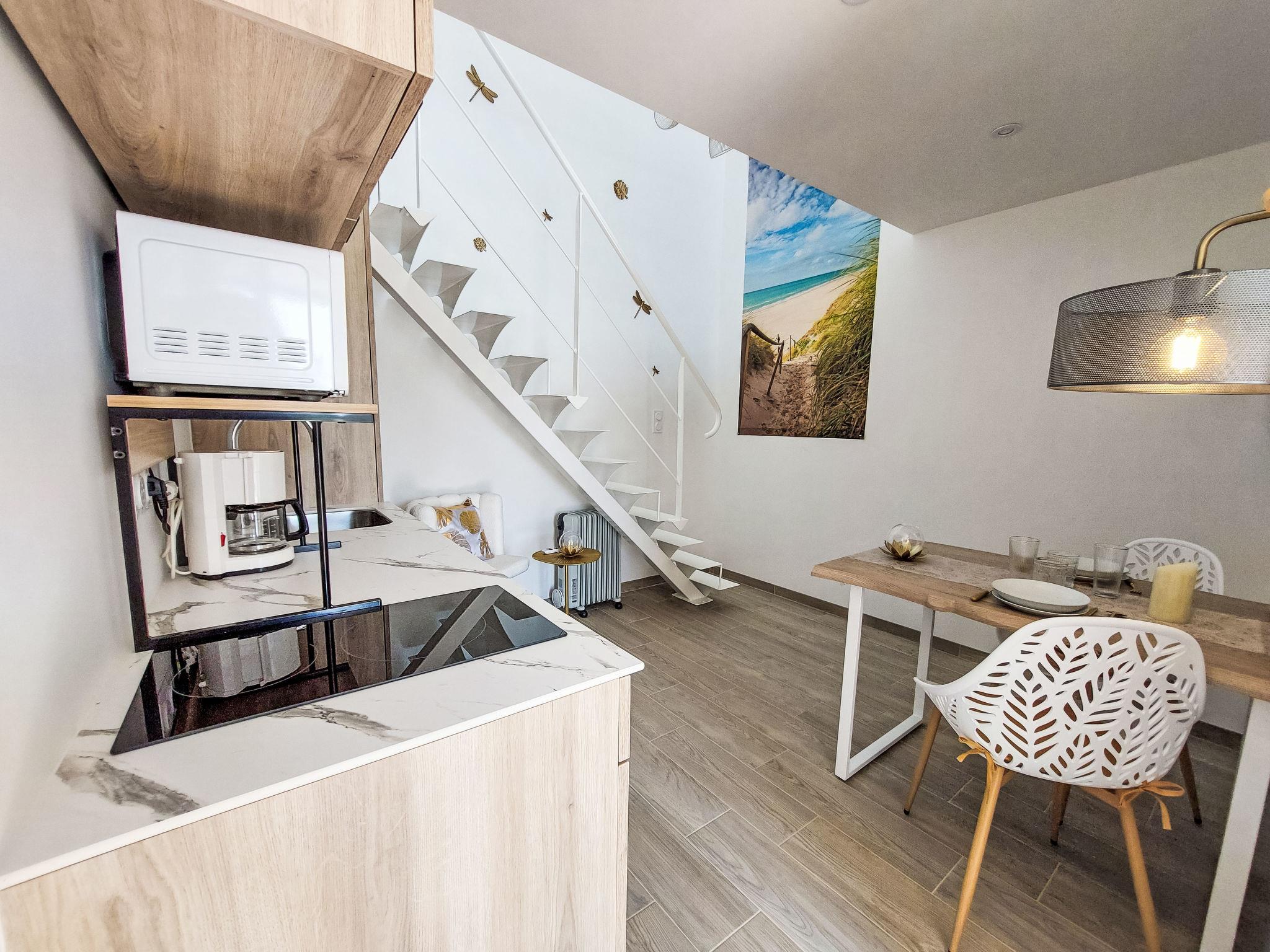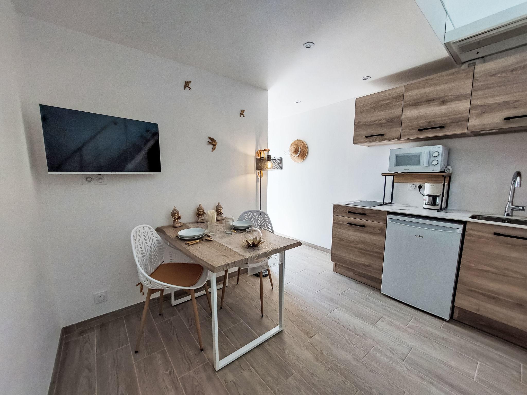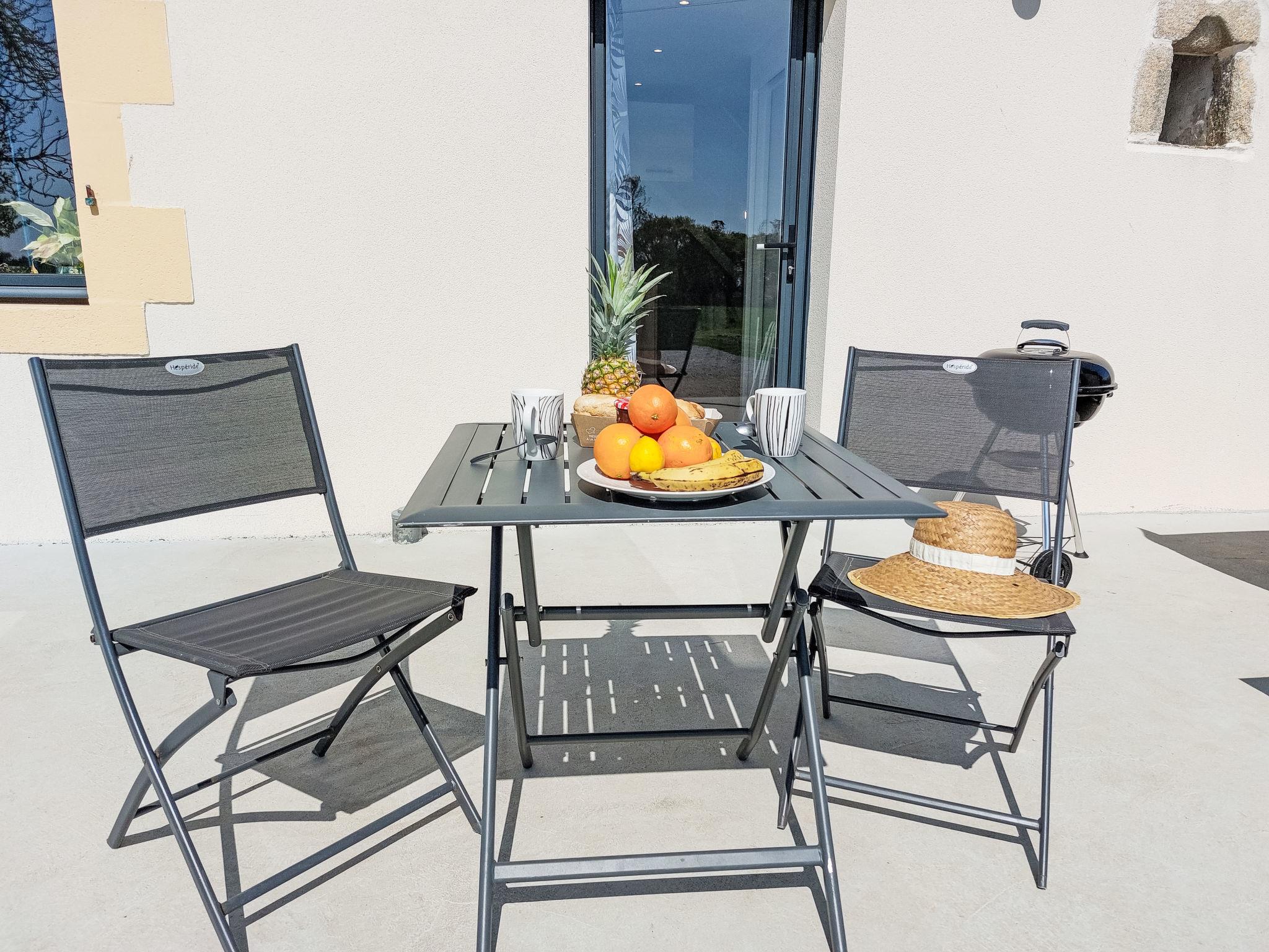 "La Trélennette", 2-room house 45 m2 on 2 levels, south facing position. Object suitable for 2 adults. Beautiful furnishings: living/dining room with dining nook and TV (flat screen), electric heater. Exit to the terrace. Kitchenette (2 induction hot plates, toaster, kettle, microwave, electric coffee machine). Shower/WC. Upper floor: gallery with sloping ceilings with 1 french bed (160 cm, length 200 cm). Terrace 20 m2, south facing position. Terrace furniture, barbecue, deck chairs (2). Facilities: hair dryer. Please note: non-smoking house. Maximum 1 pet/ dog allowed. Smoke alarm. Offer by a private individual according to Art. 155, IV of CGI.