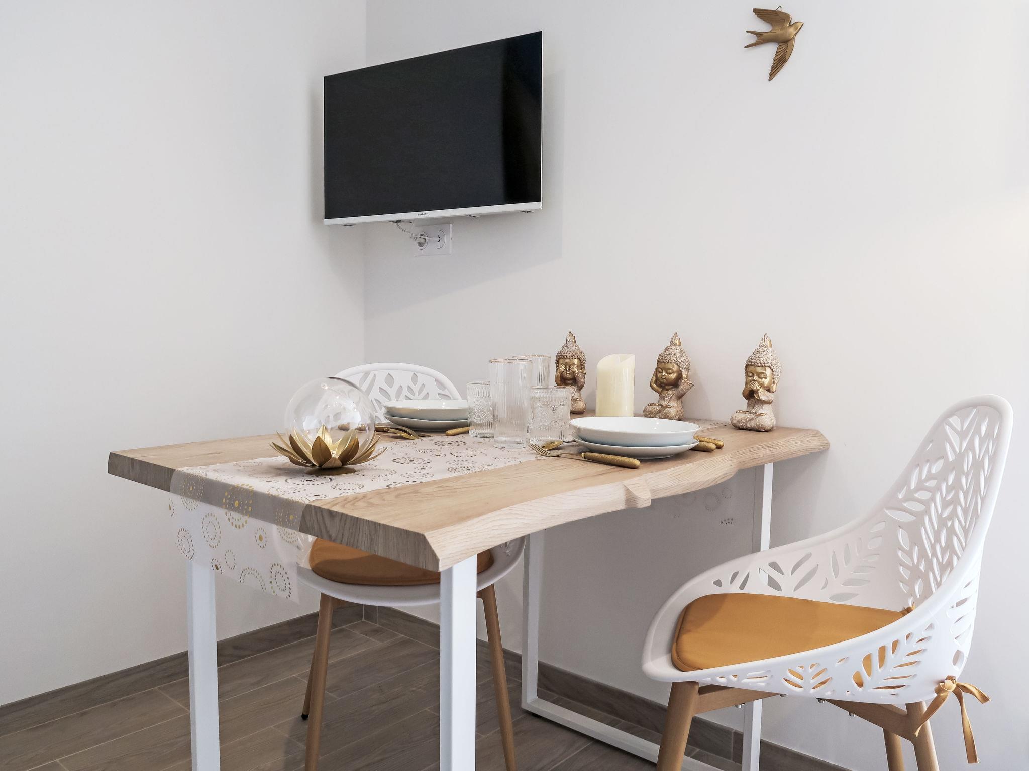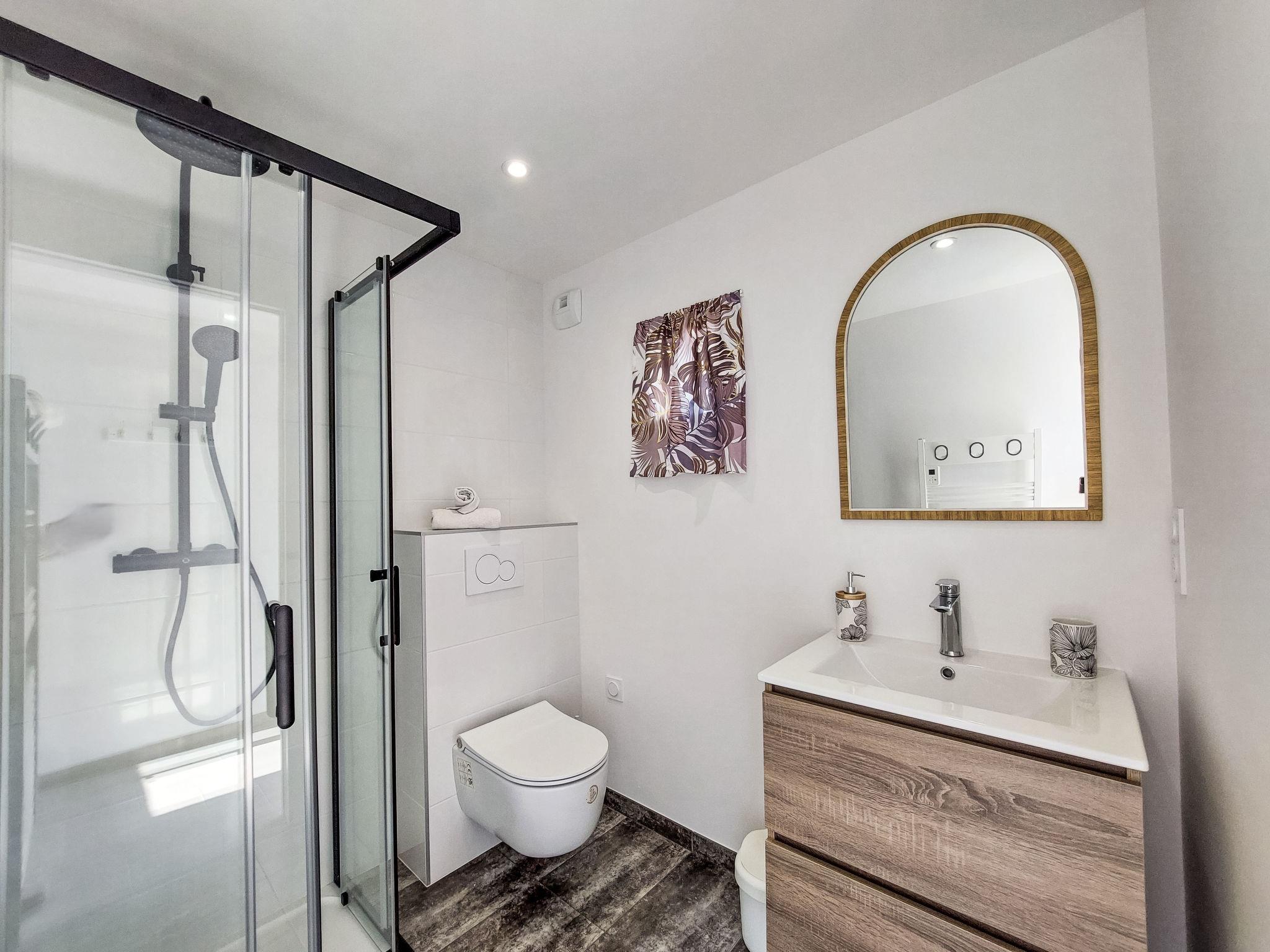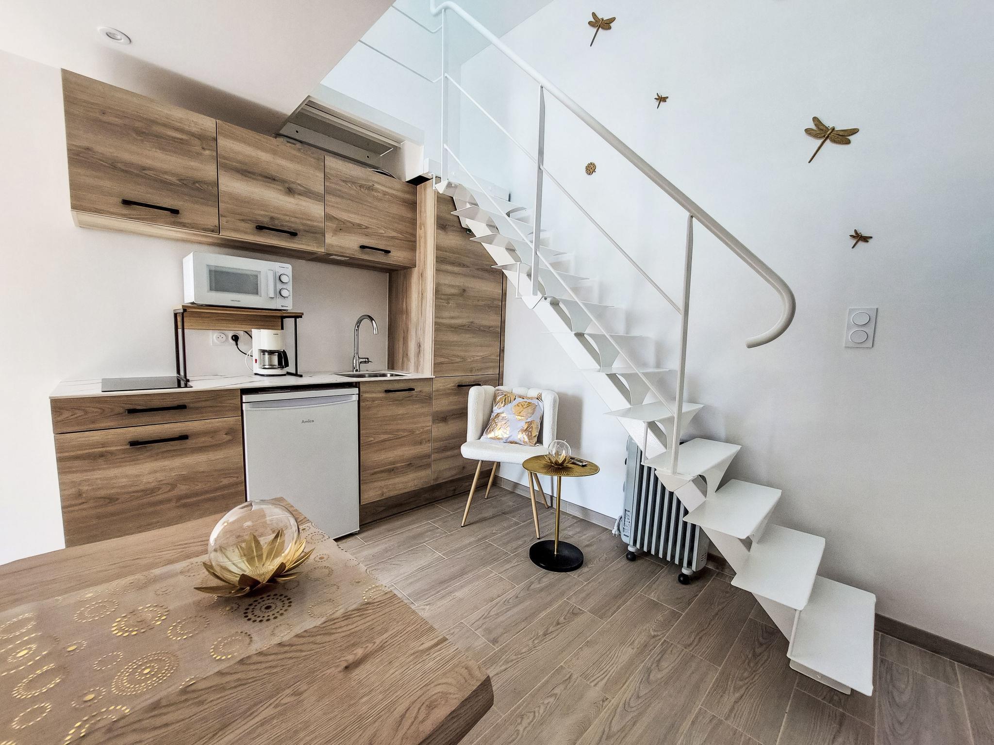 "La Trélennette", 2-room house 45 m2 on 2 levels, south facing position. Object suitable for 2 adults. Beautiful furnishings: living/dining room with dining nook and TV (flat screen), electric heater. Exit to the terrace. Kitchenette (2 induction hot plates, toaster, kettle, microwave, electric coffee machine). Shower/WC. Upper floor: gallery with sloping ceilings with 1 french bed (160 cm, length 200 cm). Terrace 20 m2, south facing position. Terrace furniture, barbecue, deck chairs (2). Facilities: hair dryer. Please note: non-smoking house. Maximum 1 pet/ dog allowed. Smoke alarm. Offer by a private individual according to Art. 155, IV of CGI.