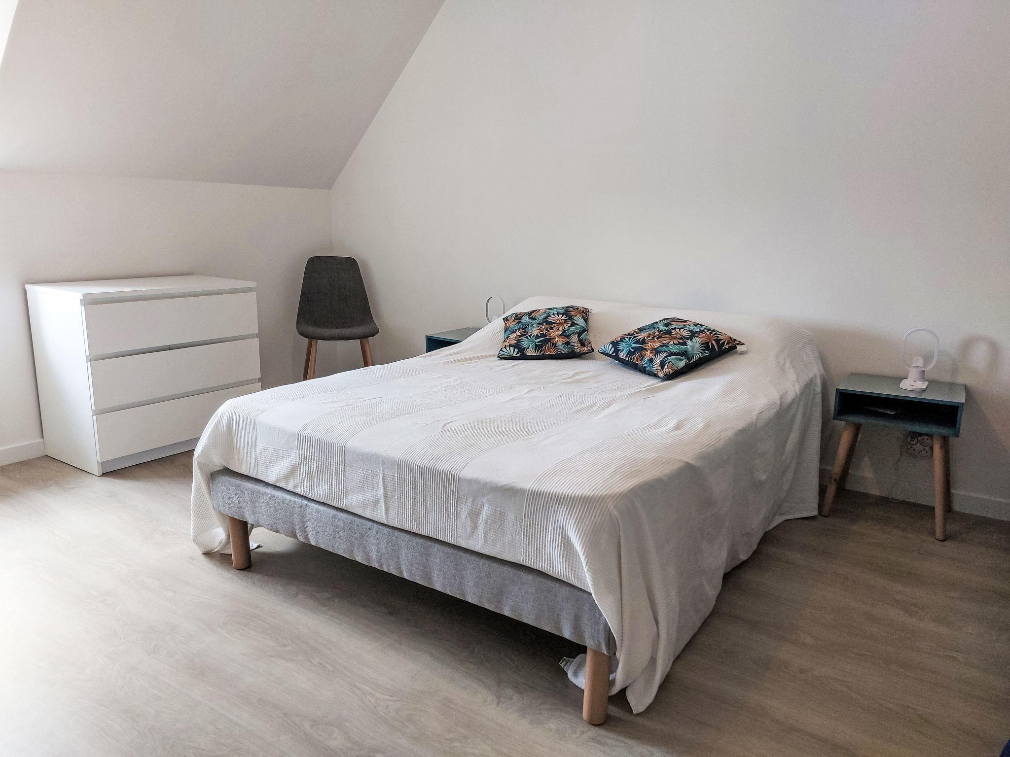"La Trélennoise", 3-room house 80 m2 on 2 levels, south facing position. Beautiful and cosy furnishings: large living/dining room with Scandinavian wood stove, dining nook and TV (flat screen). Exit to the terrace. Kitchenette (oven, 2 induction hot plates, toaster, kettle, microwave, electric coffee machine). Upper floor: 1 room with 1 french bed (140 cm, length 200 cm). 1 room with 1 bed (90 cm, length 190 cm), 1 french bed (140 cm, length 200 cm). Shower/WC. Heating not available in all rooms. Terrace 30 m2, south facing position. Terrace furniture, barbecue, deck chairs (2). Facilities: washing machine, hair dryer. Please note: non-smoking house. Maximum 1 pet/ dog allowed. Smoke alarm. Offer by a private individual according to Art. 155, IV of CGI.