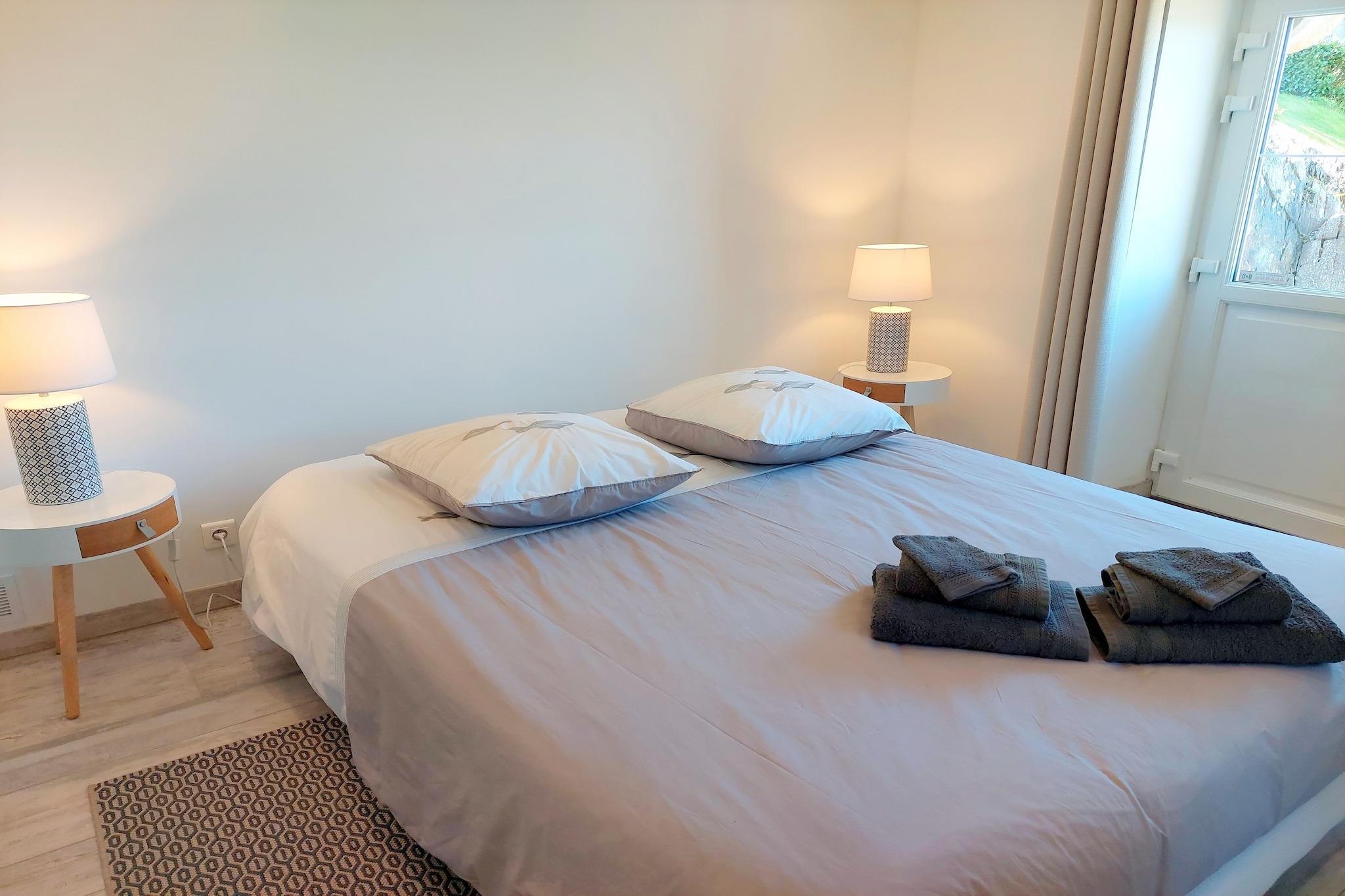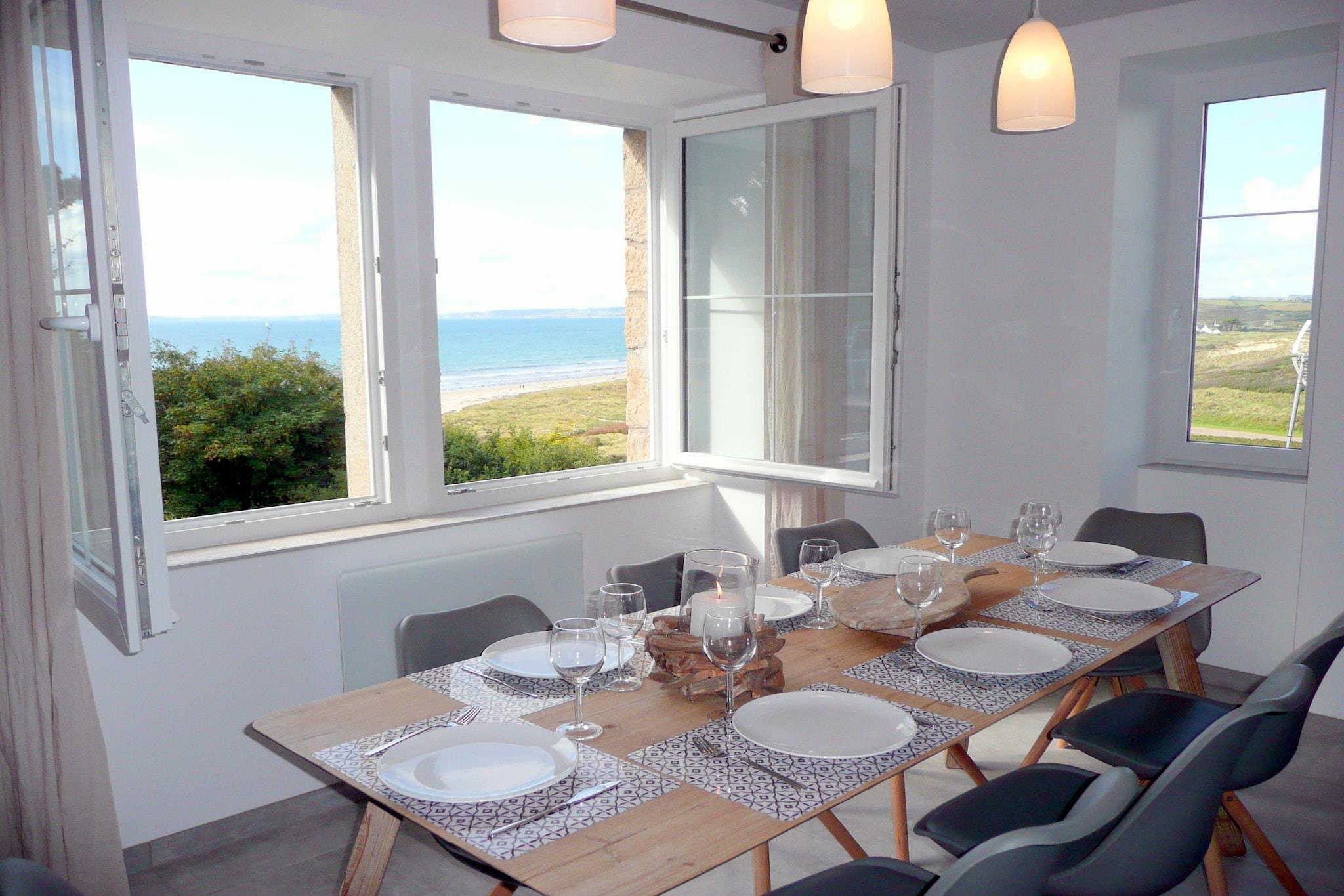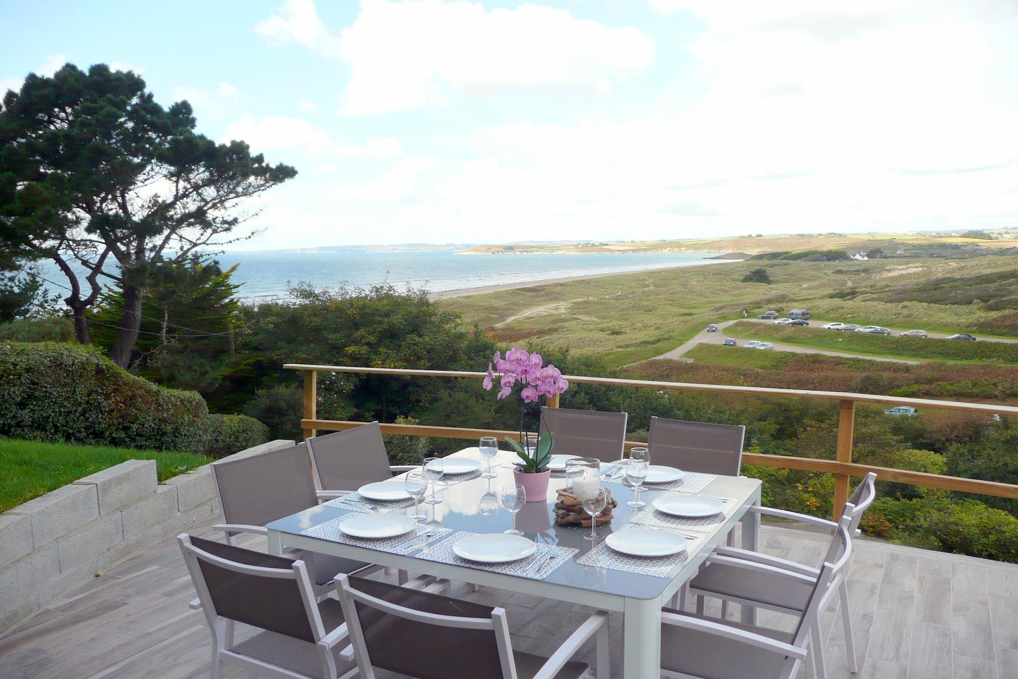 Fantastisk panoramaudsigt over havet, stranden og bugten. Kun 100 m fra stranden, direkte adgang fra terrassehaveejendommen. Stenhus med en usædvanlig, meget original moderne arkitektonisk stil, komfortable møbler, nyrestaureret i 2017. Om morgenen spiser du morgenmad på terrassen med croissanter og baguettes og en fantastisk havudsigt. Soveværelset på nederste etage med havudsigt har direkte udgang til en lille privat terrasse og haven. Vandsportsentusiaster, soldyrkere og naturelskere vil få noget for pengene her. På den kilometerlange sandstrand er der en strandsejlklub, som er en sand begivenhed ved lavvande. Hver sidste weekend i august er der optog i kapellet St. Anne la Palud.Den smukke placering af den brede, let skrånende sandstrand ved lavvande er et must for sandsejlere. Vi anbefaler et besøg i den tidligere sardinhavn Douarnenez med talrige pubber og specialrestauranter. På vejen bør du helt sikkert besøge middelalderlandsbyen Locronan, som er en af de smukkeste landsbyer i Frankrig og har været rammen om talrige film. Malerbyen Pont Aven med talrige kunstgallerier bør også besøges. Crozon har en labyrint, paintball, høj rebbane og drageflyvning fra Menez-Hom.