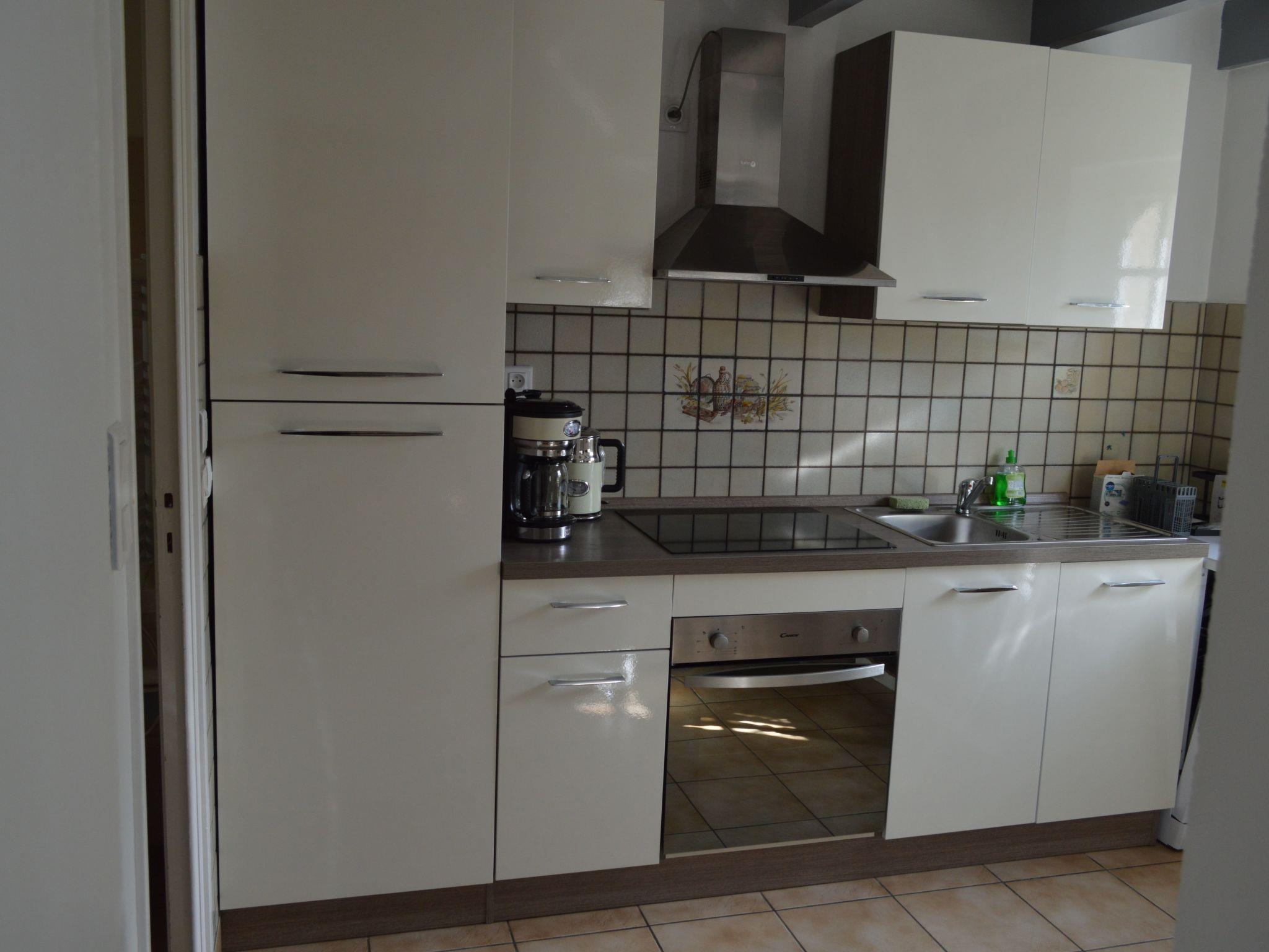 Next to the living room is a fully-equipped built-in kitchen with induction hob, oven, microwave, coffee maker, kettle, teapot, toaster, dishwasher and dining area.