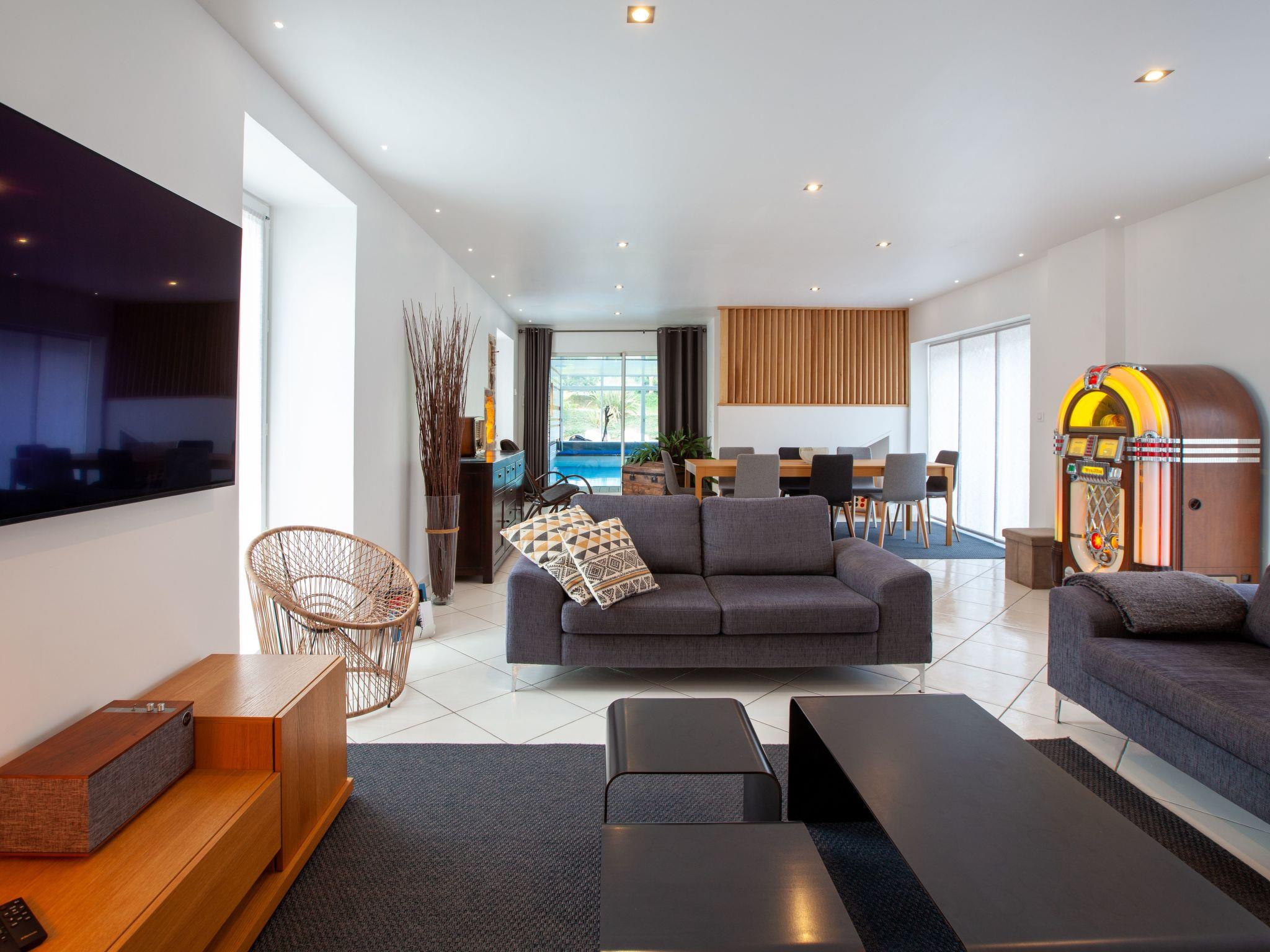 Outside, the villa opens onto a 4,500m2 garden planted with trees, with four terraces where you can relax over a barbecue or play outdoor games. The large swimming pool is a permanent invitation to take a dip, guaranteed to please everyone. The outdoor area is a haven of peace, where you can relax and enjoy the Breton sunshine.