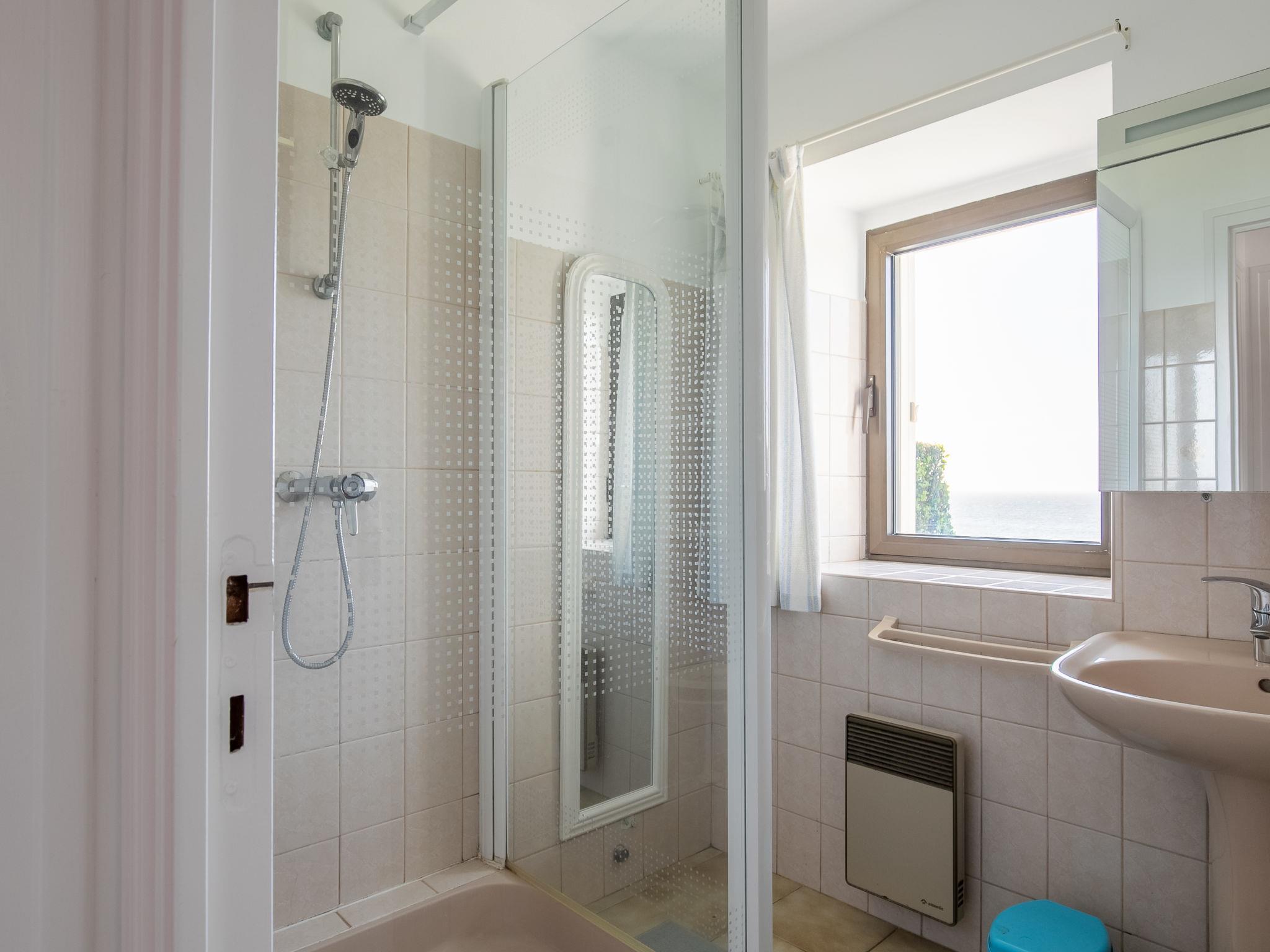 "Les Romarins", 5-room house 140 m2 on 2 levels. Comfortable and cosy furnishings: living/dining room with panoramic window with Scandinavian wood stove, dining table and satellite TV. Exit to the garden. 1 room with 1 double bed. Open kitchen (1 hot plate, oven, dishwasher, 3 gas rings, toaster, kettle, microwave, freezer, electric coffee machine). Shower, sep. WC. Upper floor: living room. 2 rooms with sloping ceilings, each room with 2 beds. Bathroom, sep. WC, double hand-basin. Electric heating. Terrace. Terrace furniture, barbecue (portable), deck chairs (2), box-room. Beautiful panoramic view of the sea. Facilities: washing machine, iron, children's high chair, baby cot. Internet (WiFi, extra). Please note: non-smoking house. Smoke alarm.