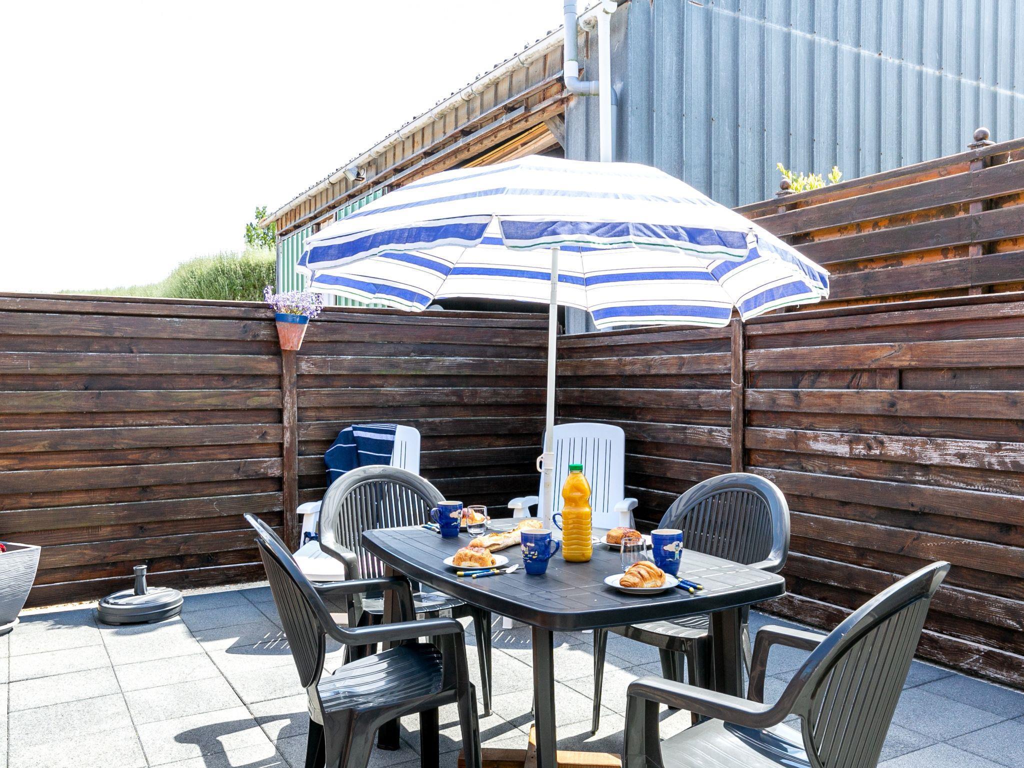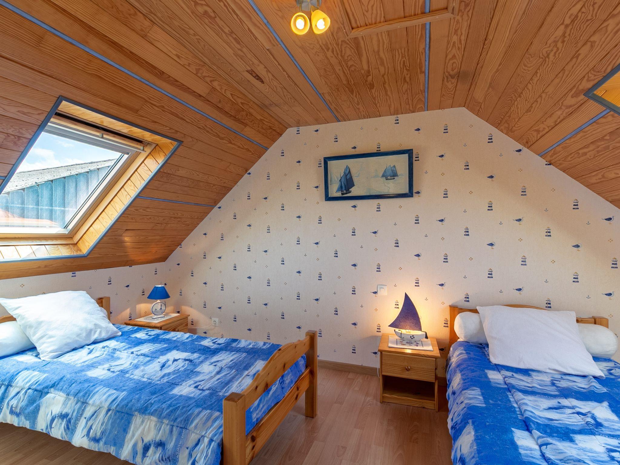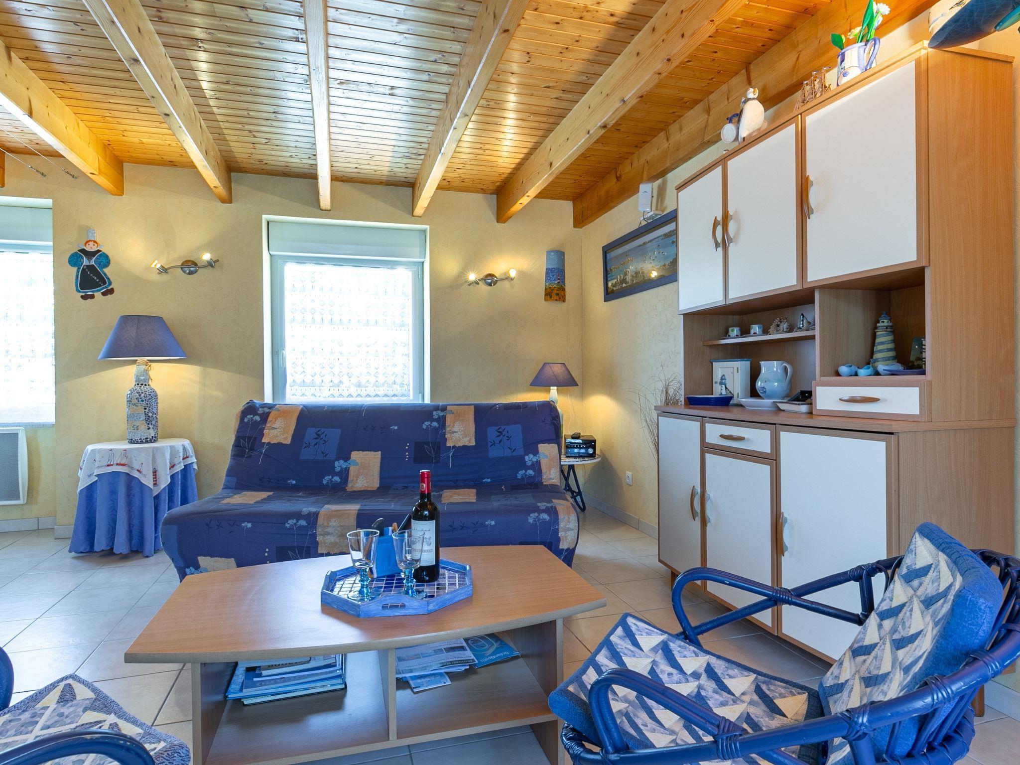 "Ty Channed", 3-room house 65 m2 on 2 levels. Bright, tasteful furnishings: living/dining room with dining table, satellite TV, radio and DVD. Exit to the terrace. Open kitchen (mini-oven, dishwasher, 4 gas rings, toaster, kettle, microwave, freezer, electric coffee machine) with bar. Shower, sep. WC. Upper floor: open gallery with sloping ceilings. 1 room with sloping ceilings with 2 beds (90 cm, length 190 cm). 1 room with sloping ceilings with 1 french bed (140 cm, length 190 cm). Sep. WC. Electric heating. Parquet floors. Terrace 24 m2, south facing position. Terrace furniture, barbecue (portable), box-room. Distant view of the sea. Facilities: washing machine, iron, children's high chair, baby cot. Internet (WiFi, free). Please note: non-smoking house. Smoke alarm. Instead of an enclosed bedroom, some sleeping areas are located in an open-plan area (gallery, alcove, etc.). 29206 000018 10