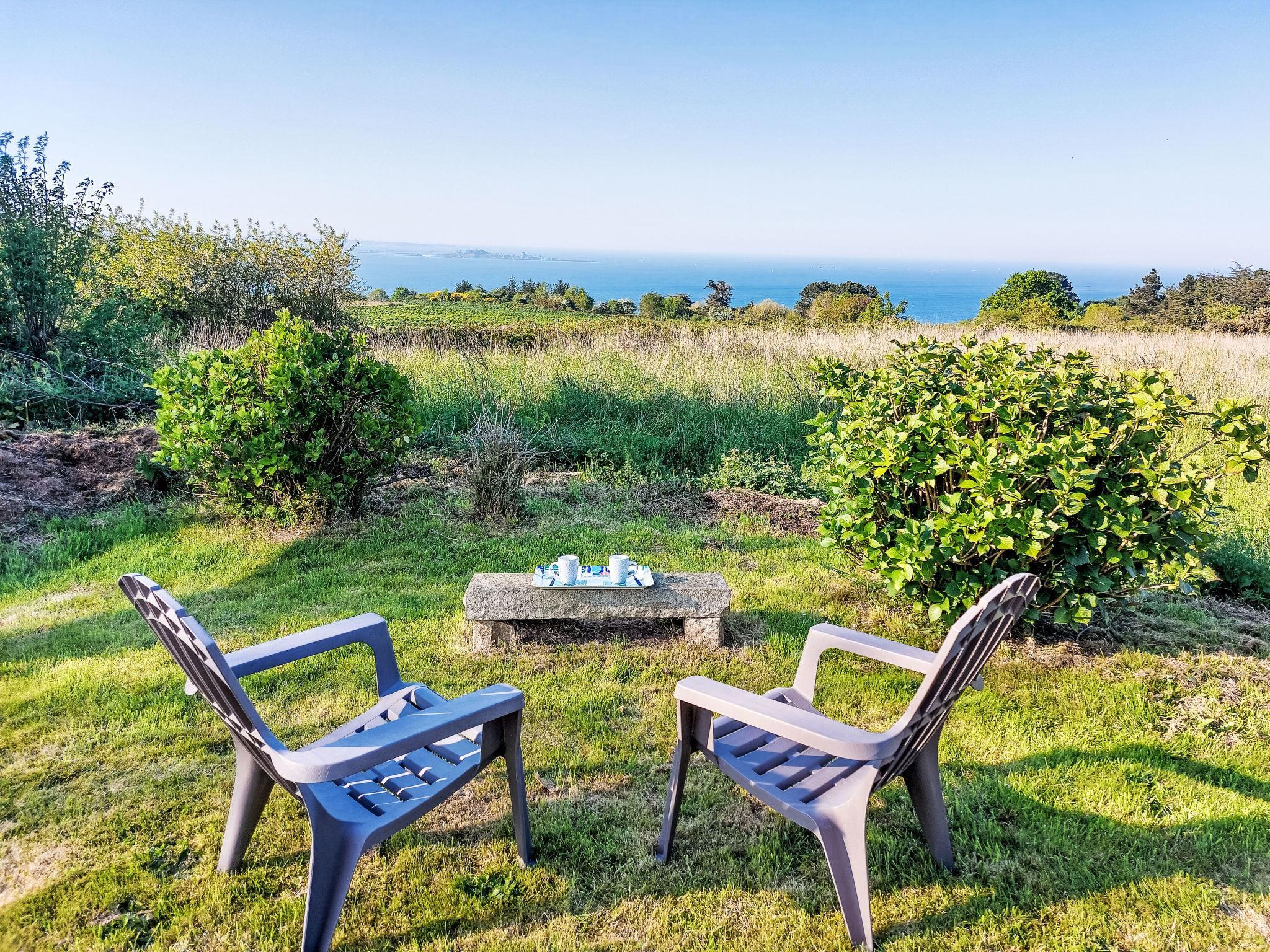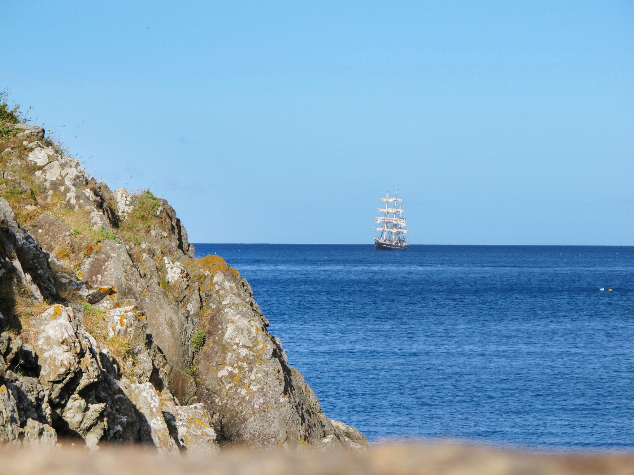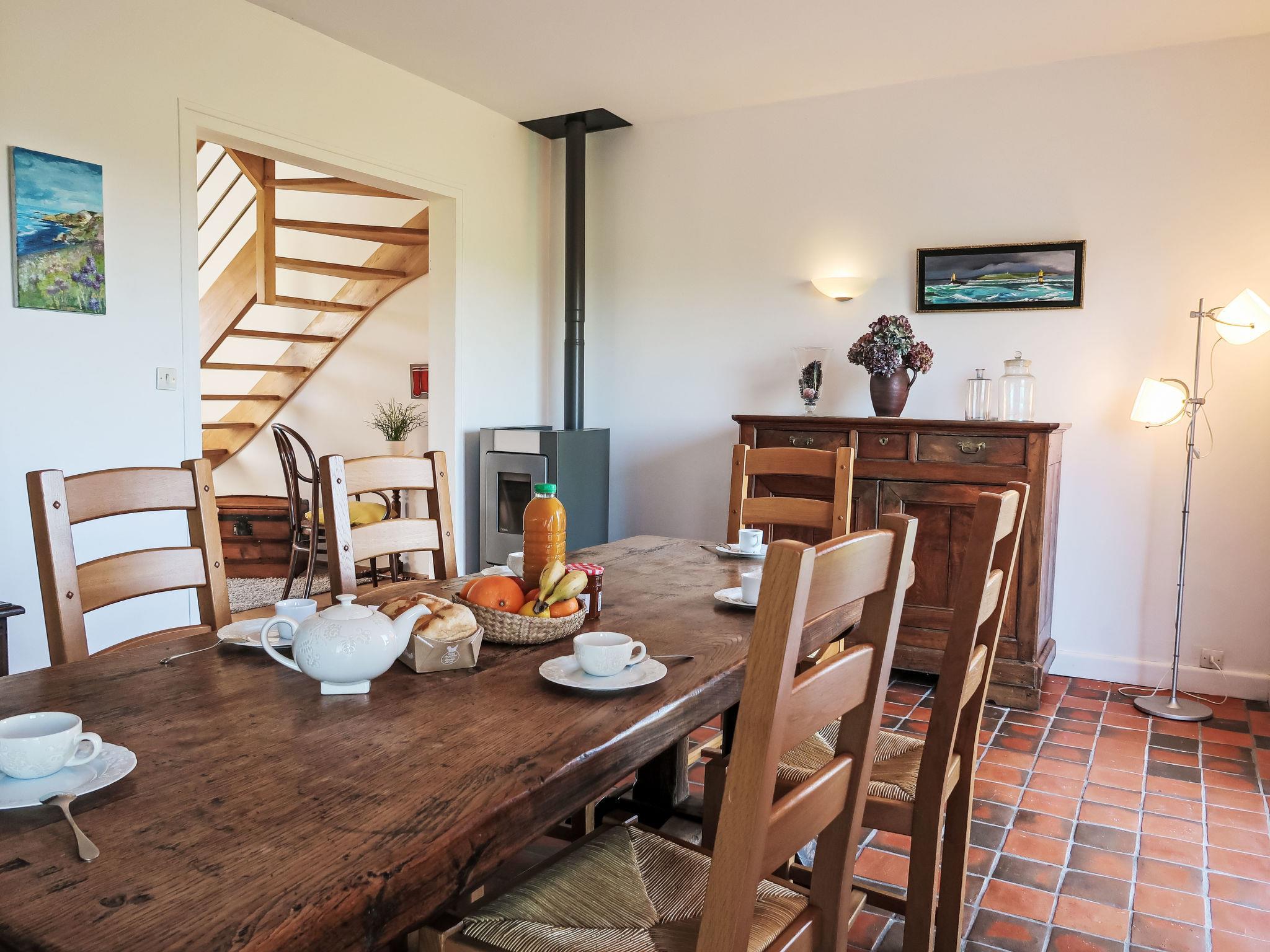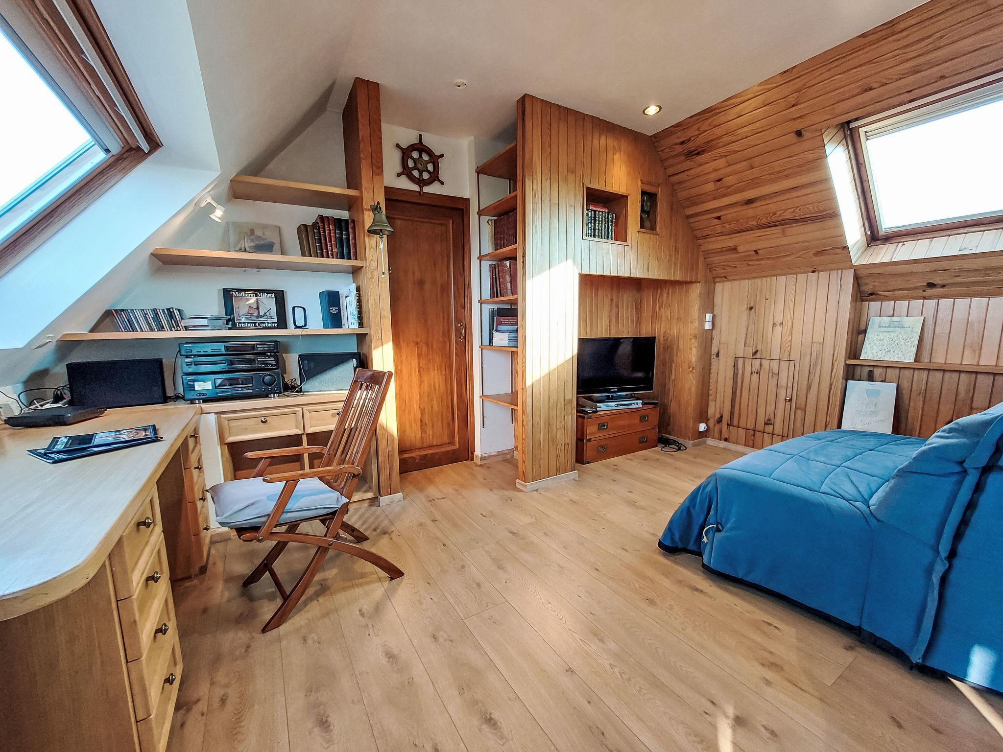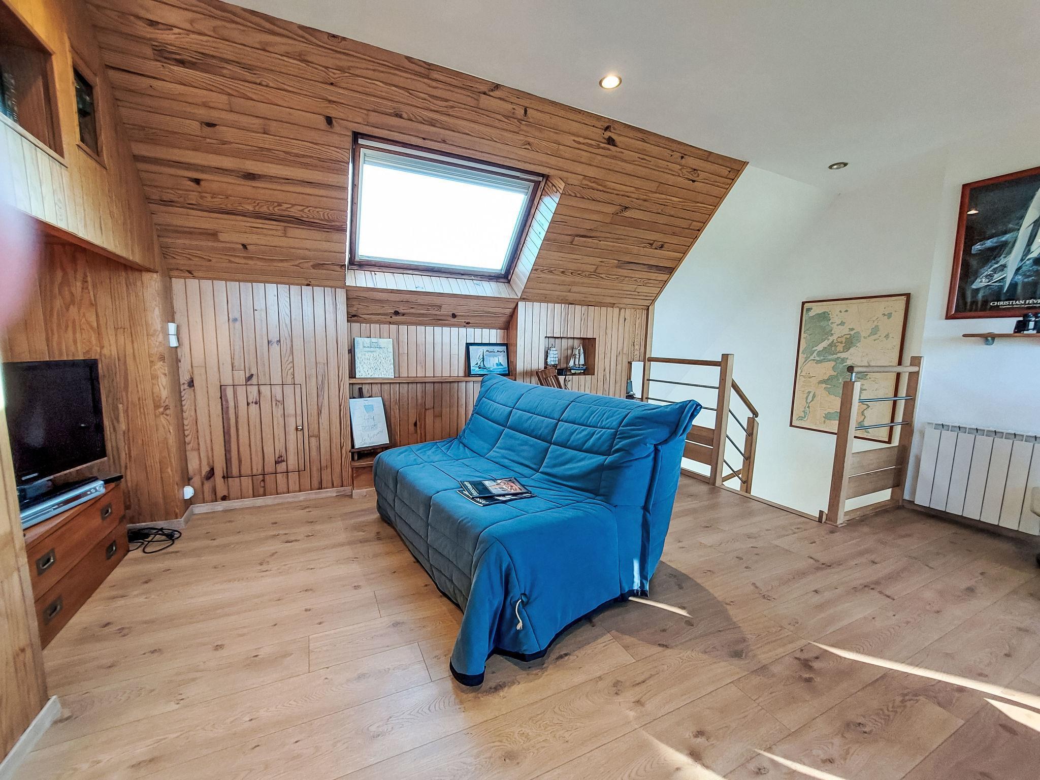 "Ti Loïk", 5-room house 100 m2 on 2 levels. Bright, beautiful and cosy furnishings: 1 room with 1 french bed (140 cm, length 190 cm). Dining room with dining table and wood-burning stove. Exit to the garden. Open kitchen (oven, dishwasher, 3 induction hot plates, toaster, kettle, microwave, freezer, electric coffee machine). Shower, sep. WC. Upper floor: living room with sloping ceilings with rooflight with 1 double sofabed (140 cm, length 190 cm), TV, radio, CD-player, hi-fi system and DVD. Walk-through room with 1 french bed (140 cm, length 190 cm). Interconnecting room with 2 beds (90 cm, length 190 cm). Sep. WC. Electric heating. Terrace furniture, barbecue (portable), deck chairs (4), box-room. Beautiful view of the sea. Facilities: washing machine, iron, children's high chair, baby cot. Internet (WiFi, free). Please note: non-smoking house. Smoke alarm.