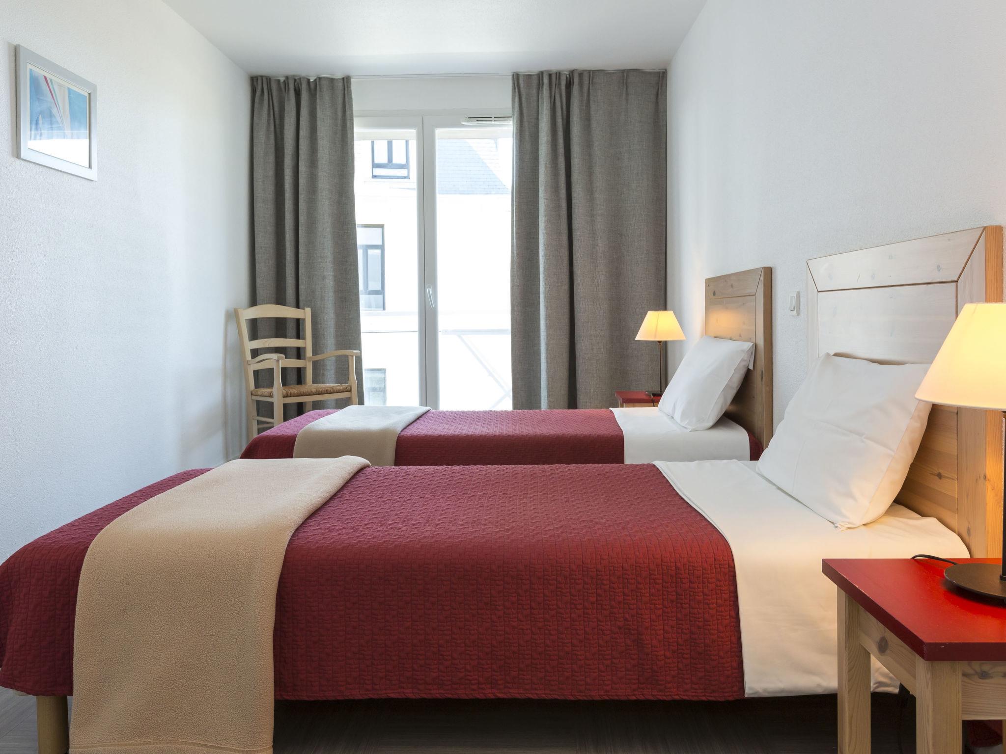 " Odalys Domaine des Roches Jaunes", 3-room apartment 44 to 49 m2. Bright, modern furnishings: living/sleeping room with 1 sofabed, 1 pull-out bed, dining table and TV can be hired (flat screen). Exit to the terrace. 2 rooms, each room with 2 sleeping facilities. Kitchenette (dishwasher, 4 ceramic glass hob hotplates, microwave, electric coffee machine). Bath/WC. Electric heating. Balcony or terrace. Terrace furniture. View of the countryside. Facilities: children's high chair, baby cot. Internet (WiFi, extra). Please note: non-smokers only. Maximum 2 pets/ dogs allowed. Smoke alarm.