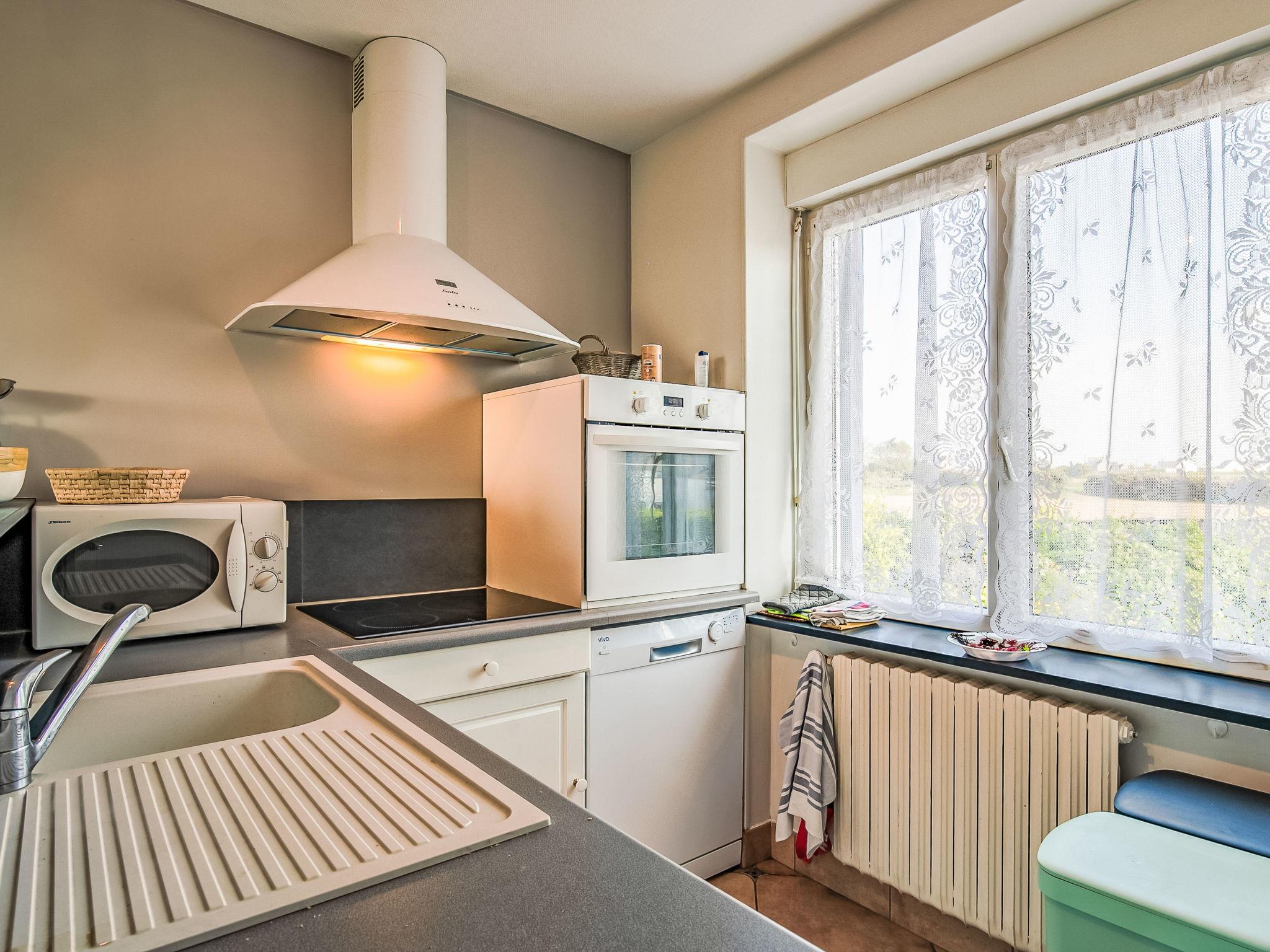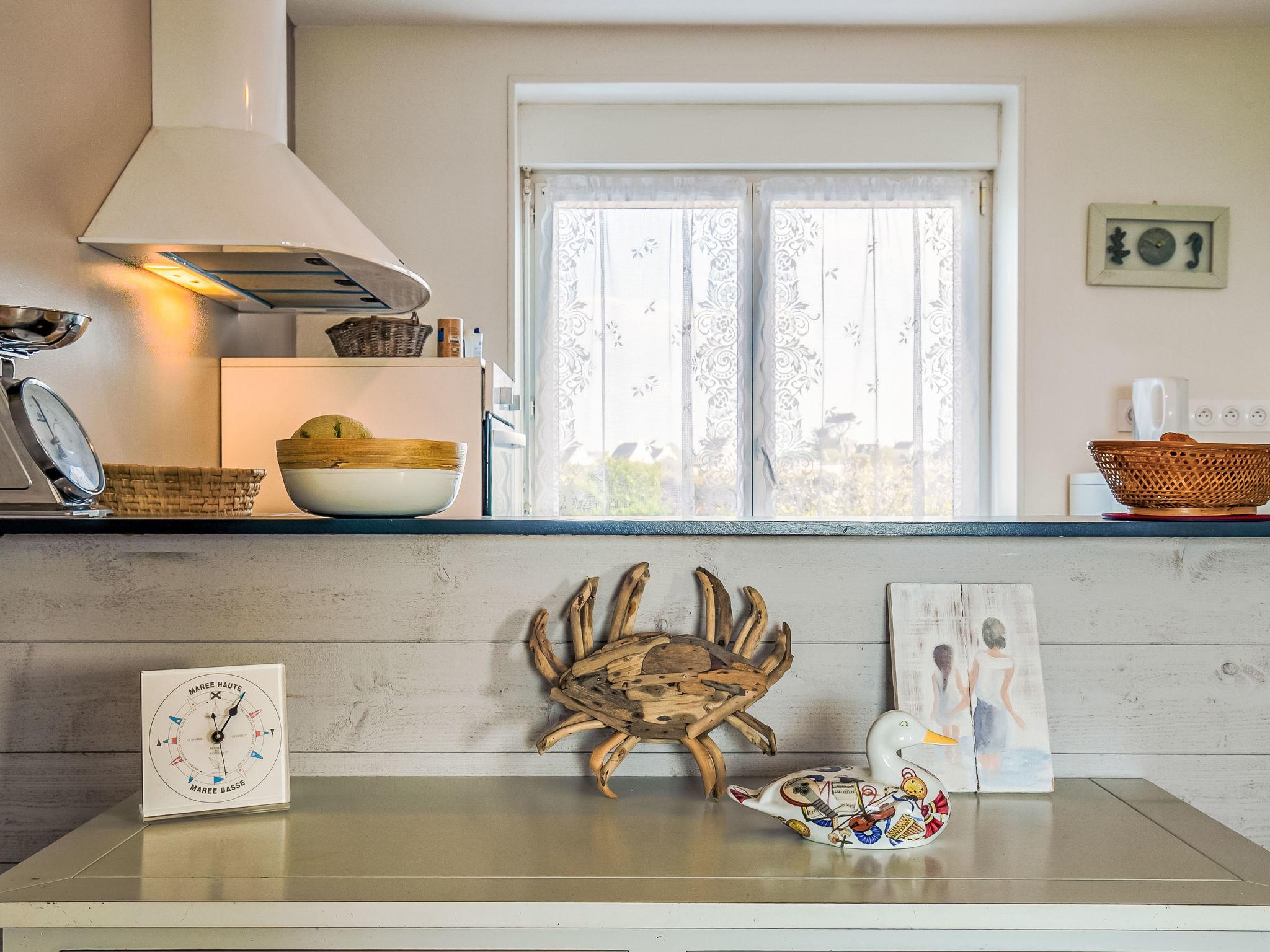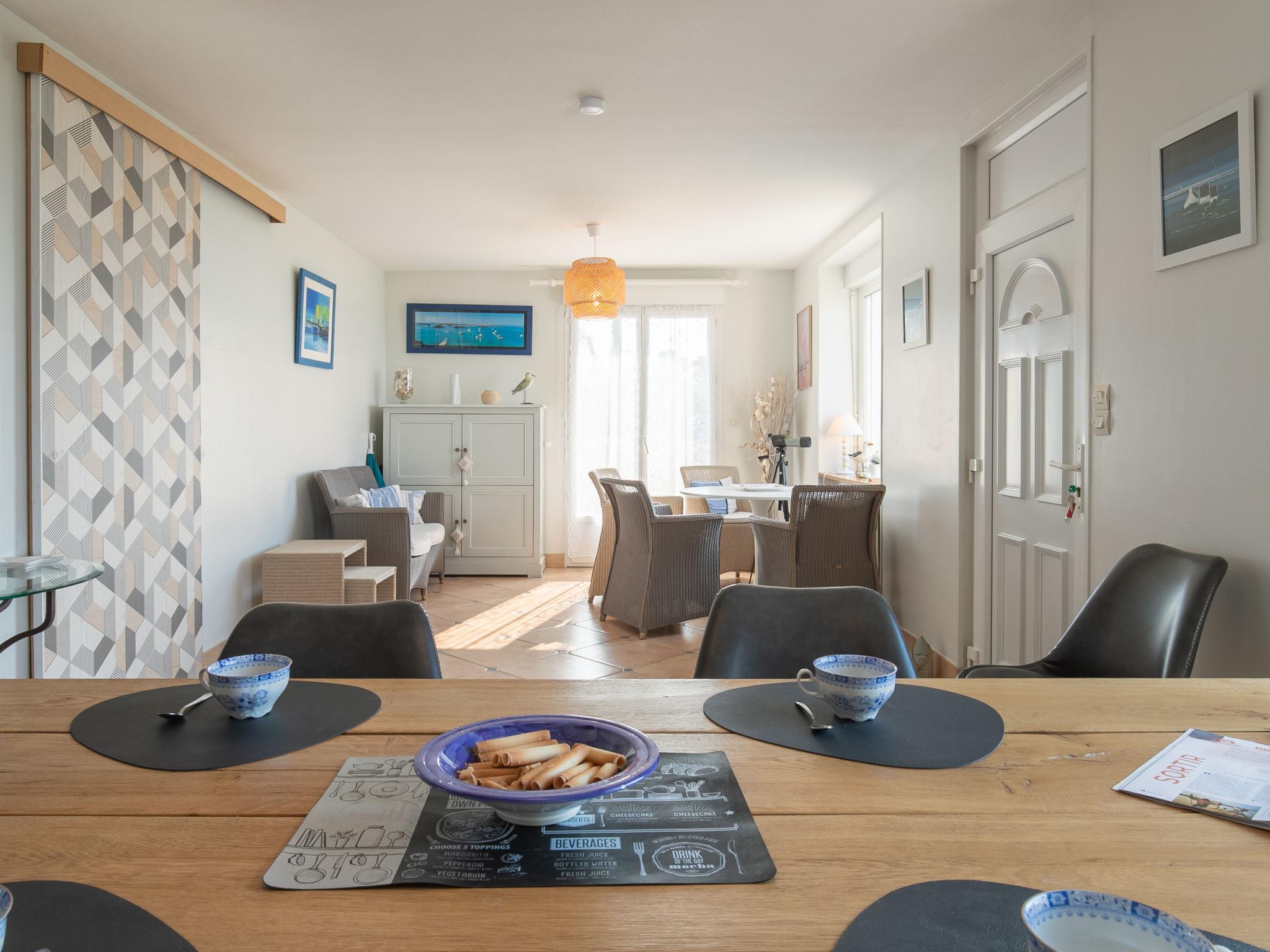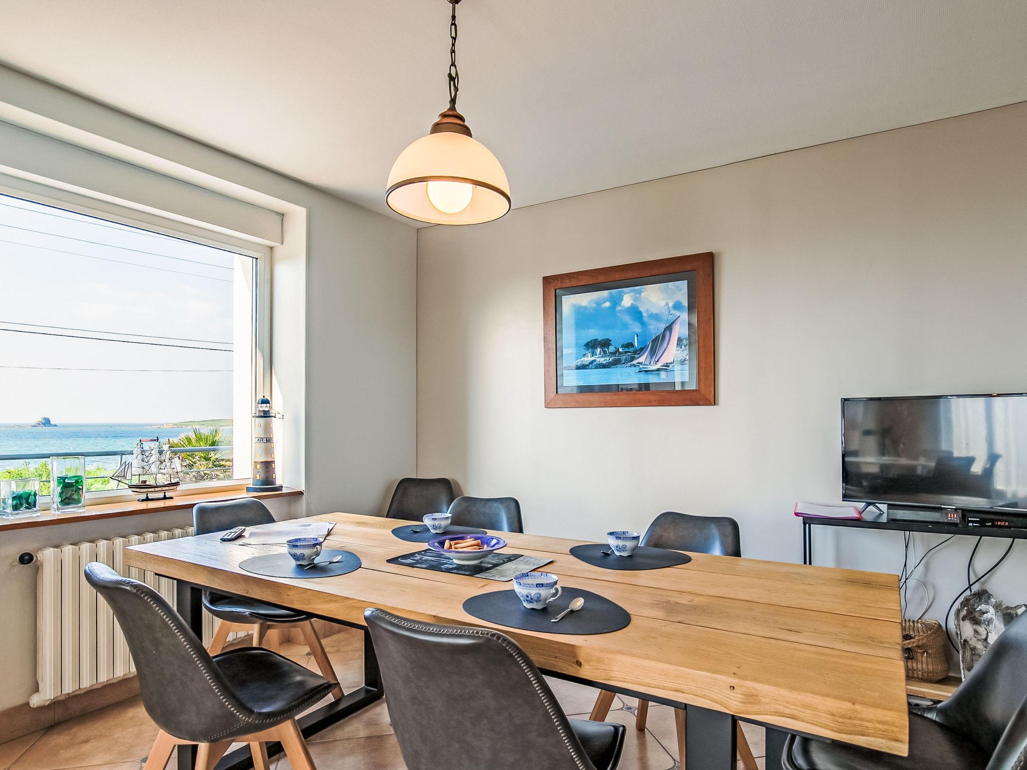 "L'Air du Large", 5-room house 110 m2 on 2 levels, on the upper ground floor, north-west facing position. Spacious and bright, beautiful and tasteful furnishings: large living/dining room with dining table, satellite TV, international TV channels, flat screen, radio and DVD. Exit to the garden, to the terrace. Small lounge. Small, open kitchen (dishwasher, 3 induction hot plates, toaster, kettle, microwave, freezer, electric coffee machine). Sep. WC. Oil heating. Upper floor: 1 room with Dressing room with 1 french bed (160 cm, length 190 cm). 2 rooms, each room with 1 french bed (140 cm, length 190 cm). Shower. Terrace 32 m2, north-west facing position and south-west facing position. Terrace furniture, barbecue (portable), deck chairs (4). Very beautiful panoramic view of the sea. Facilities: washing machine, iron, children's high chair, baby cot for up to 2 year olds. Internet (WiFi, free). Please note: suitable for families. Non-smoking house. Maximum 1 pet/ dog allowed. Smoke alarm.