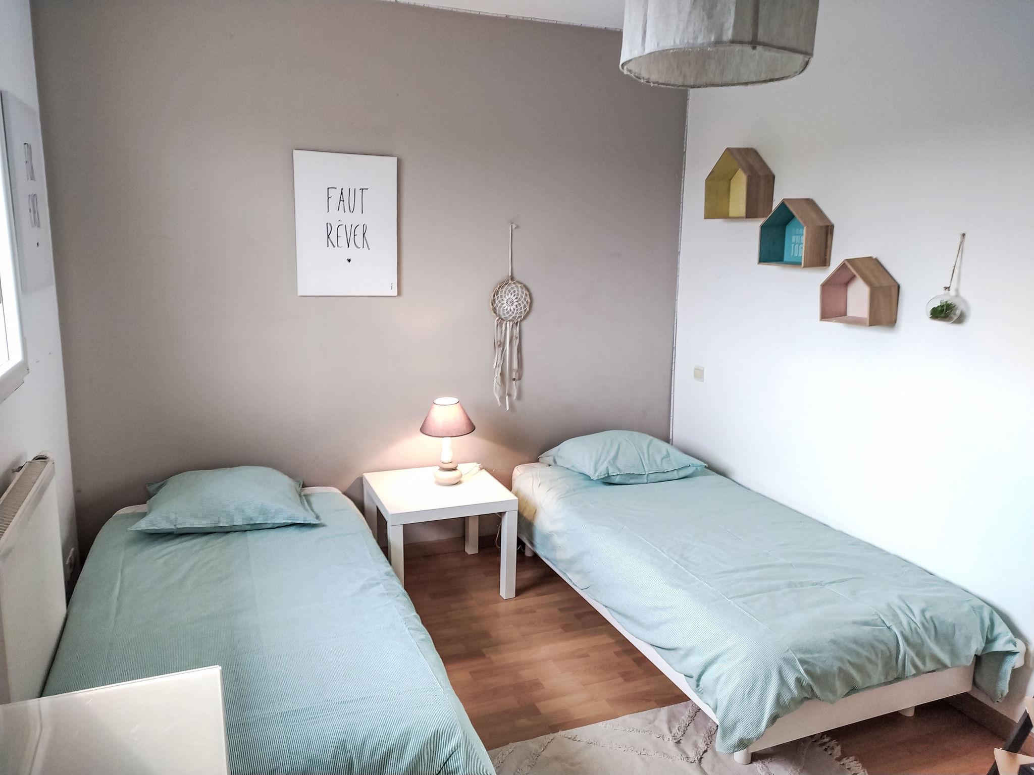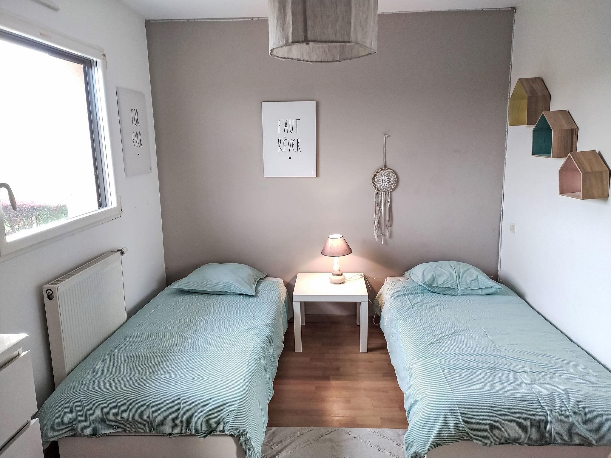 "Le Duc", 4-room house 120 m2 on 2 levels. Bright, beautiful and cosy furnishings: open large living/dining room 50 m2 with TV and flat screen. Exit to the garden, to the terrace. 1 room with 1 french bed (160 cm, length 200 cm). Open kitchen (oven, dishwasher, 4 ceramic glass hob hotplates, toaster, kettle, microwave, freezer, electric coffee machine) with bar. Shower, sep. WC. Upper floor: 2 rooms, each room with 2 beds (80 cm, length 190 cm). Shower/WC. Electric heating. Facilities: washing machine, hair dryer. Internet (WiFi, free). Please note: non-smoking house. Smoke alarm. Offer by a private individual according to Art. 155, IV of CGI.