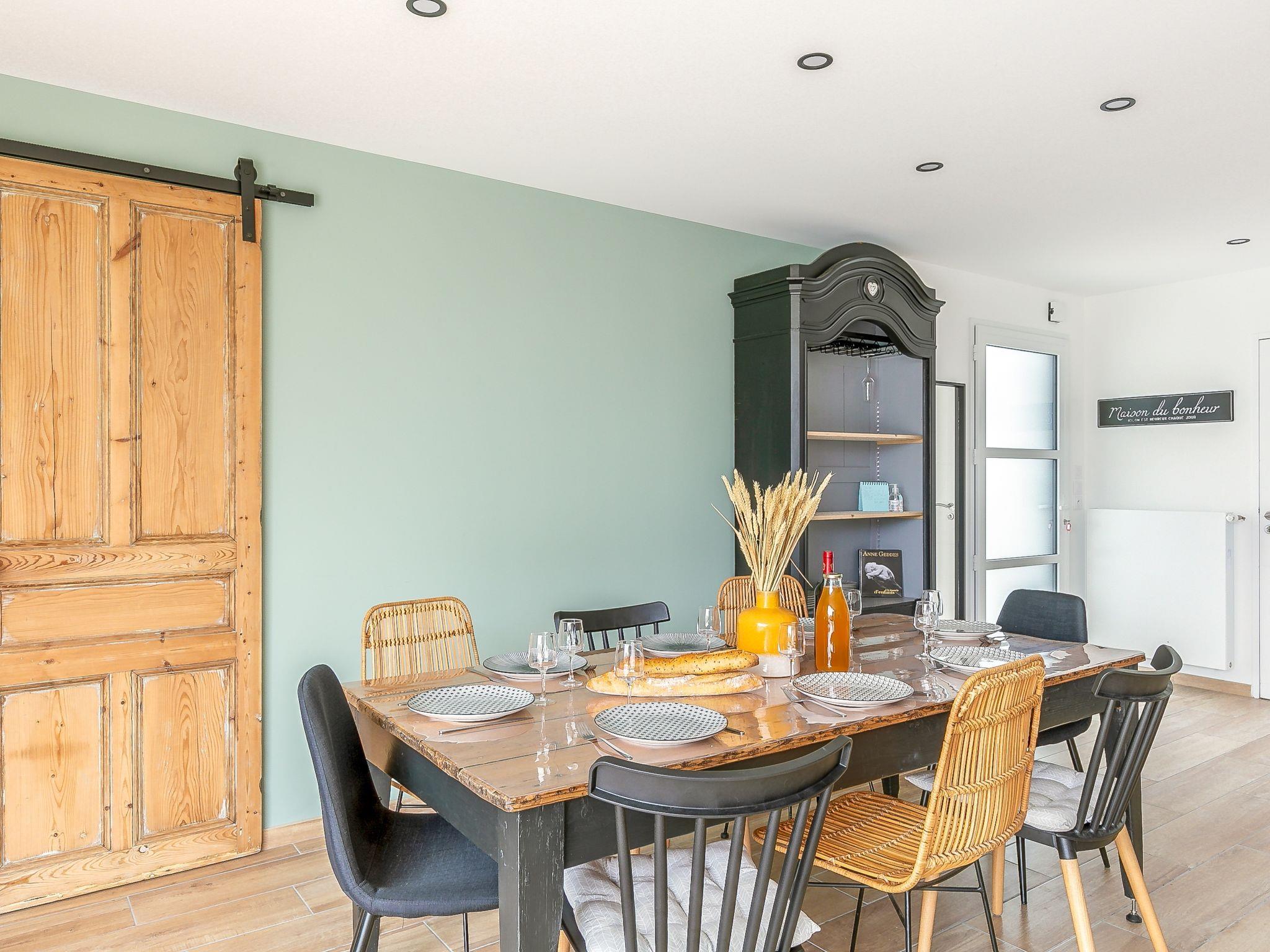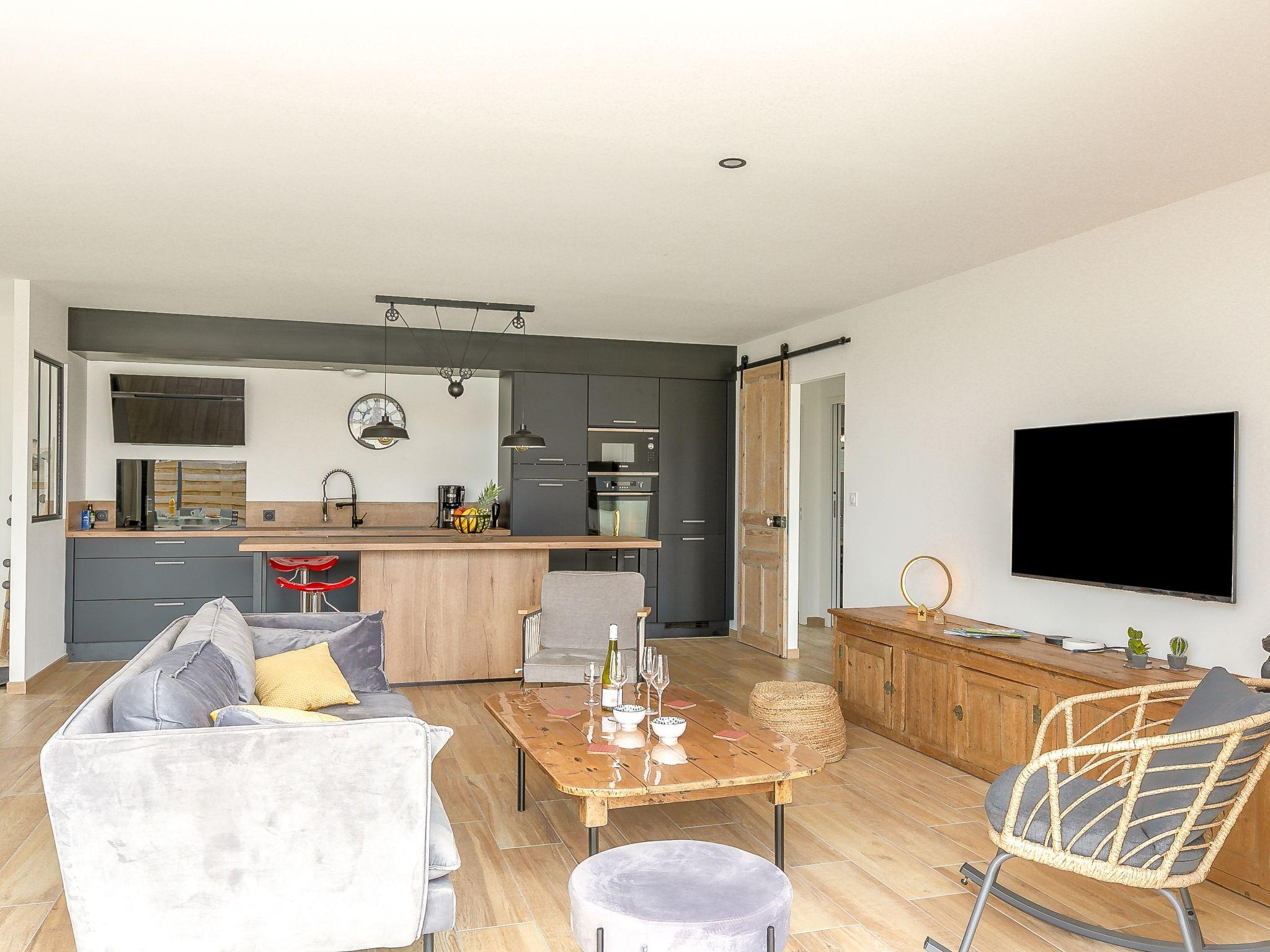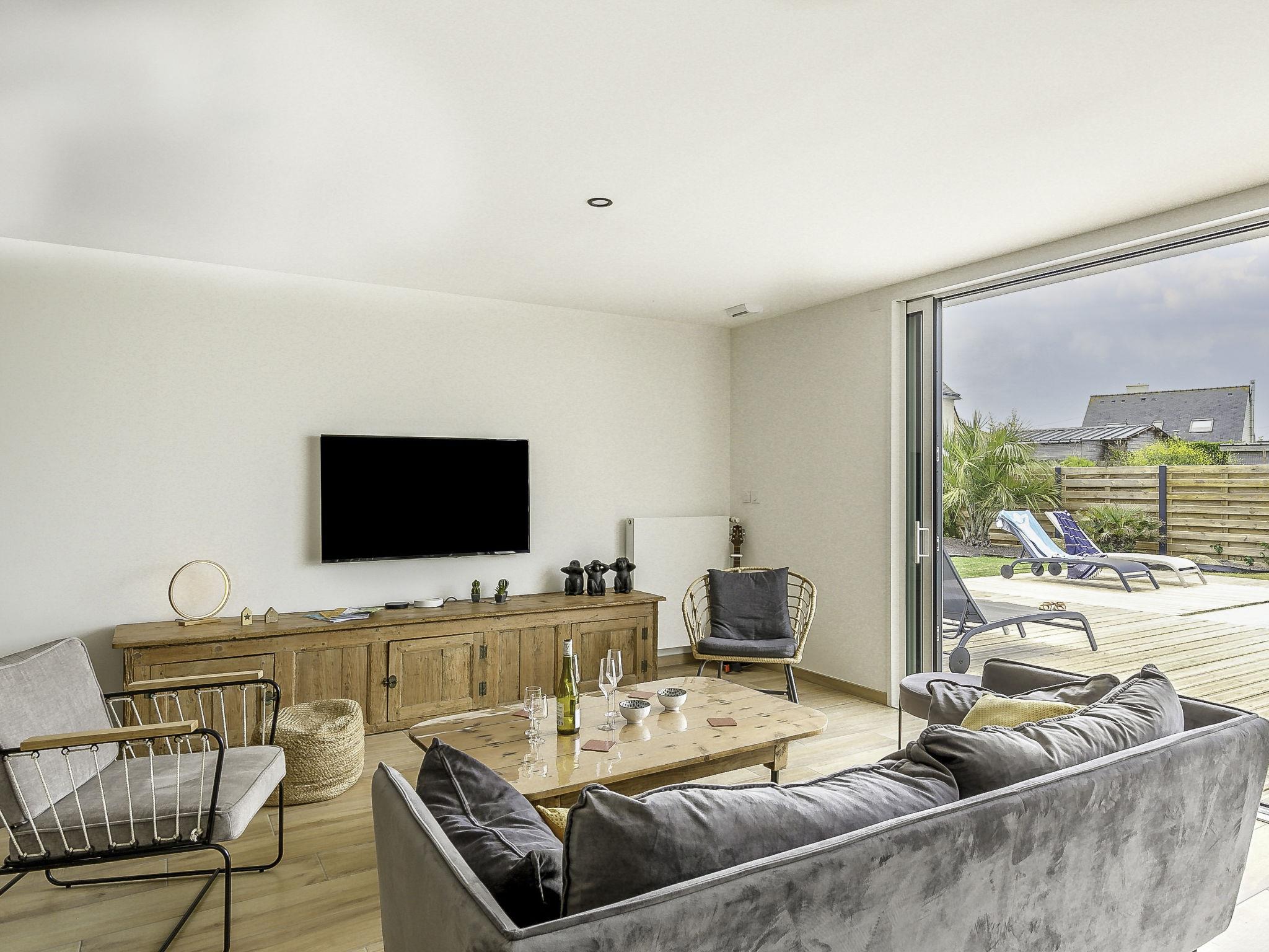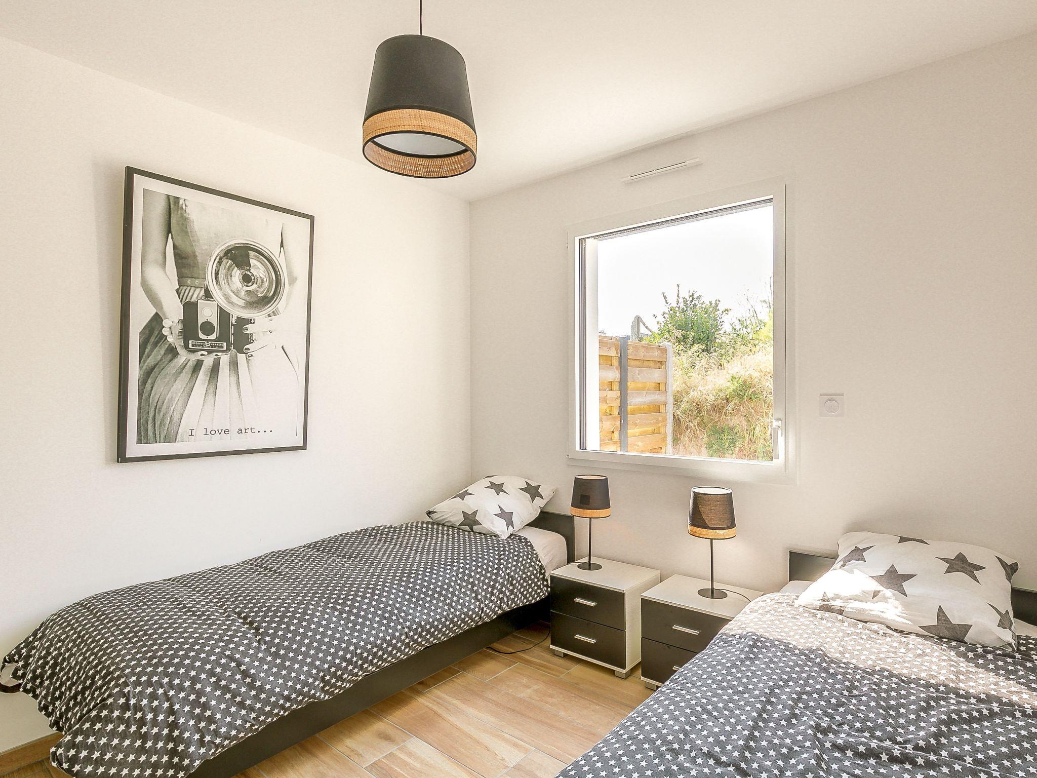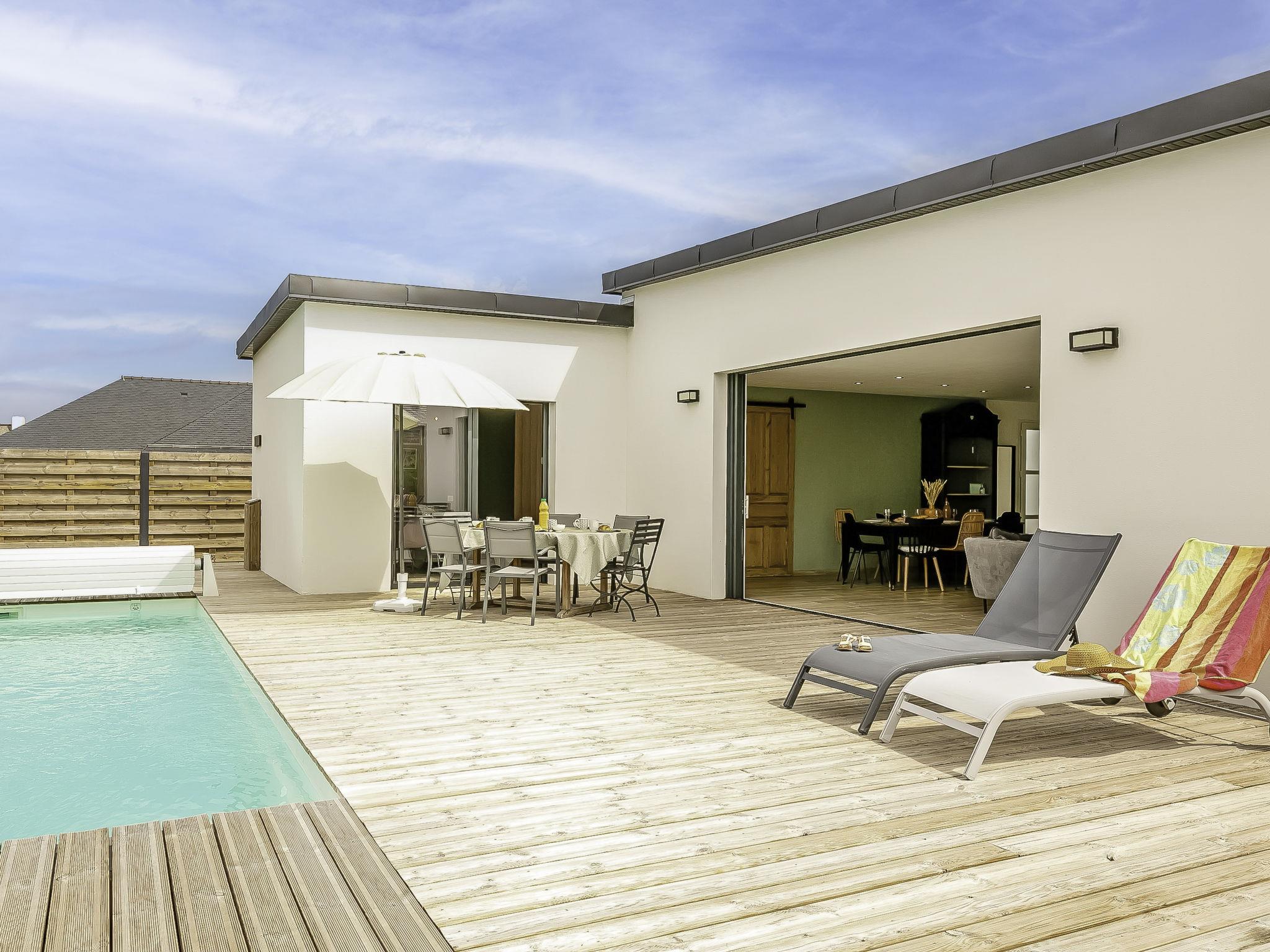 "Les Lagons du Lividic", 5-room house 117 m2. Modern and tasteful furnishings: large living/dining room 53 m2 with TV (flat screen). Exit to the terrace, to the swimming pool. 1 room with 1 french bed (160 cm, length 200 cm), electric shutters. Exit to the terrace. 1 room with 1 x 2 bunk beds (90 cm, length 200 cm), electric shutters with shower/WC and double hand-basin. 1 room with 1 french bed (140 cm, length 190 cm), electric shutters. Exit to the terrace. 1 room with 2 beds (80 cm, length 200 cm), electric shutters with separate WC, shower and double hand-basin. Large, open kitchen (oven, dishwasher, 3 induction hot plates, toaster, kettle, freezer, electric coffee machine). Gas heating. Large terrace 100 m2, south facing position, lawn. Terrace furniture, barbecue (portable), deck chairs (8). Facilities: washing machine, dryer, hair dryer. Internet (WiFi, free). Please note: non-smoking house. Smoke alarm, fire extinguisher. Please note: The bedroom with the 160x200 bed and the shower/WC in this part of the house are suitable for people with reduced mobility. FR2991.641.1