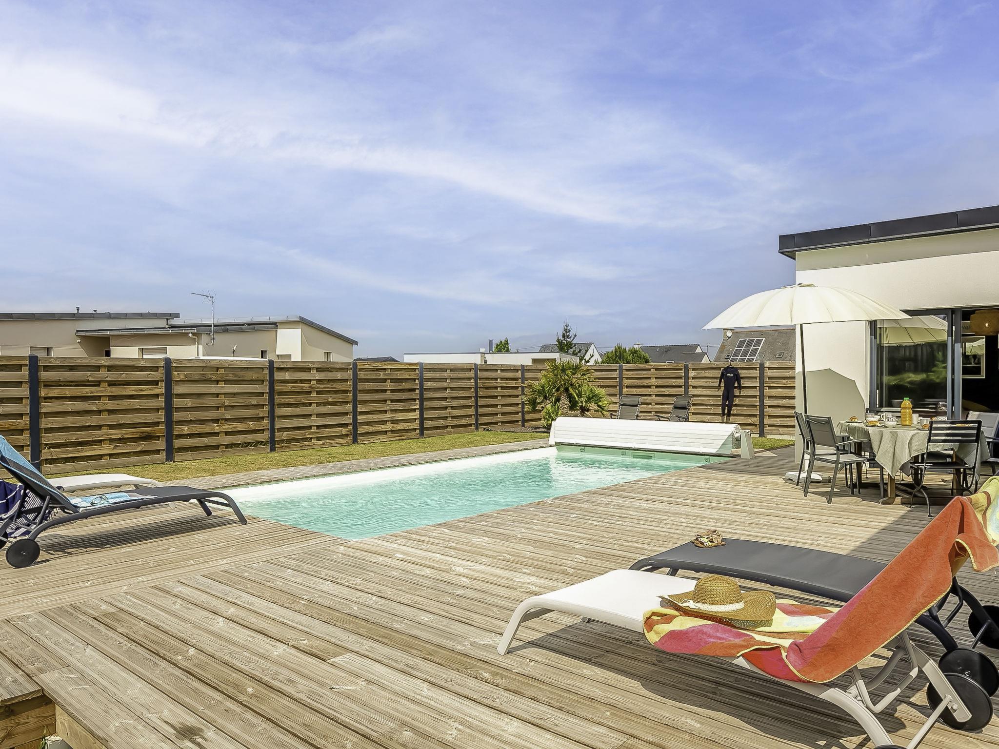 Modern, beautiful single-family house "Les Lagons du Lividic", built in 2021. In the district of Lividic 2 km from the centre of Plounéour-Trez, 12 km from the centre of Lesneven, in the residential district, 250 m from the sea, 250 m from the beach. Private: property 700 m2, well-kept garden 400 m2 (fenced) with lawn and wildlife garden, swimming pool angular, heated (8 x 3 m, 24 m2, depth 140 cm, seasonal availability: 30.Apr. - 29.Oct.) with shutter cover. Outdoor shower, parking (for 2 cars) on the premises, single garage. Grocery 2.1 km, supermarket 6.5 km, restaurant 2 km, bakery 2 km, café 1.8 km, bus stop 250 m, sandy beach "Plage du Lividic" 250 m. Golf course (18 hole) 35 km, surf school 4 km, sailing school 4 km, minigolf 15.5 km, walking paths from the house 200 m. Nearby attractions: Char à voile 25 km, Meneham 7 km, Réserve ornithologique, Dunes de Keremma 7.5 km, Château de Kerjean 27 km, Roscoff, Jardin exotique, Île de Batz 35 km, Océanopolis Brest 43 km. Hiking paths: GR34, sentier des douaniers 200 m. Please note: one bedroom and shower/WC as well as the living room and access to the terrace are suitable for people with reduced mobility.