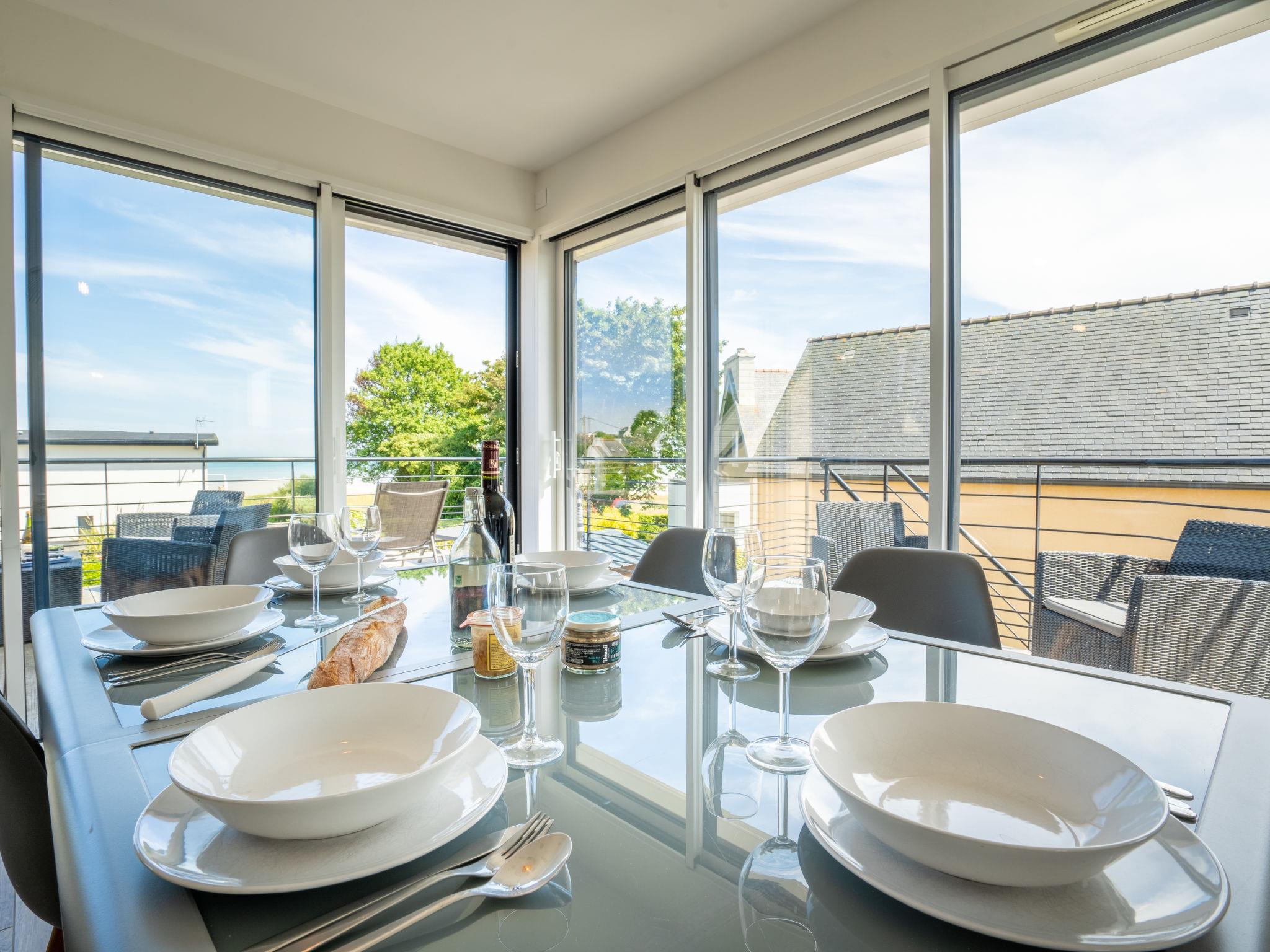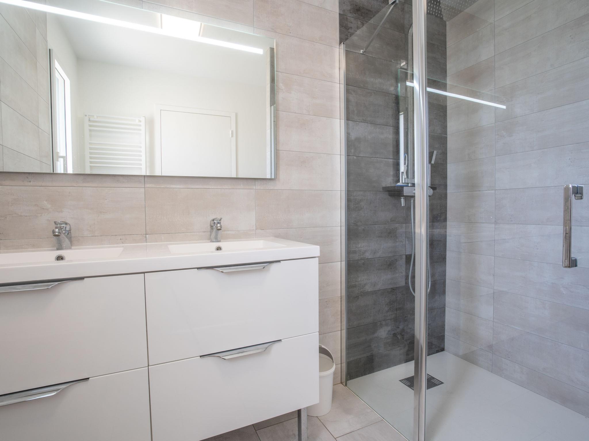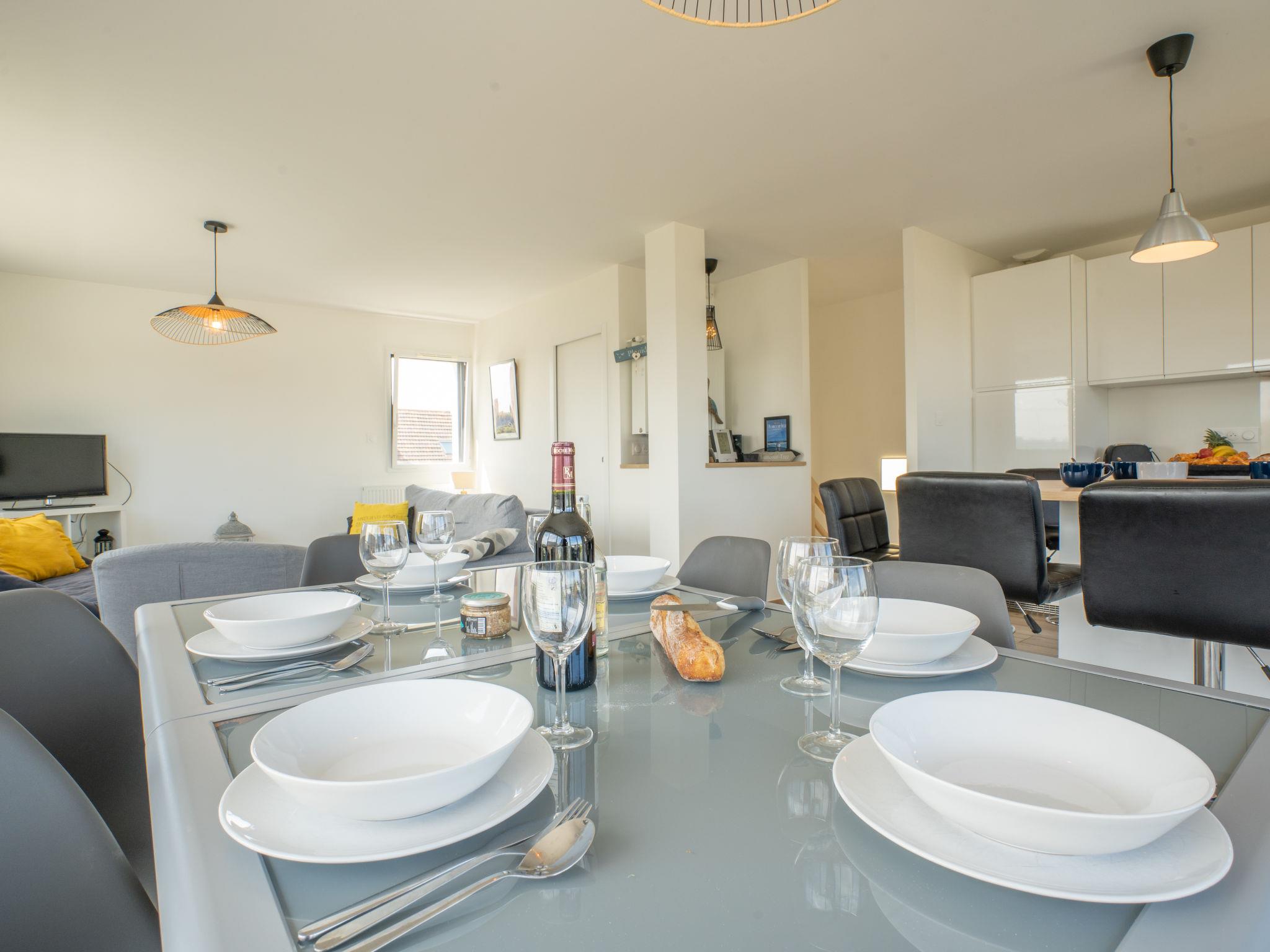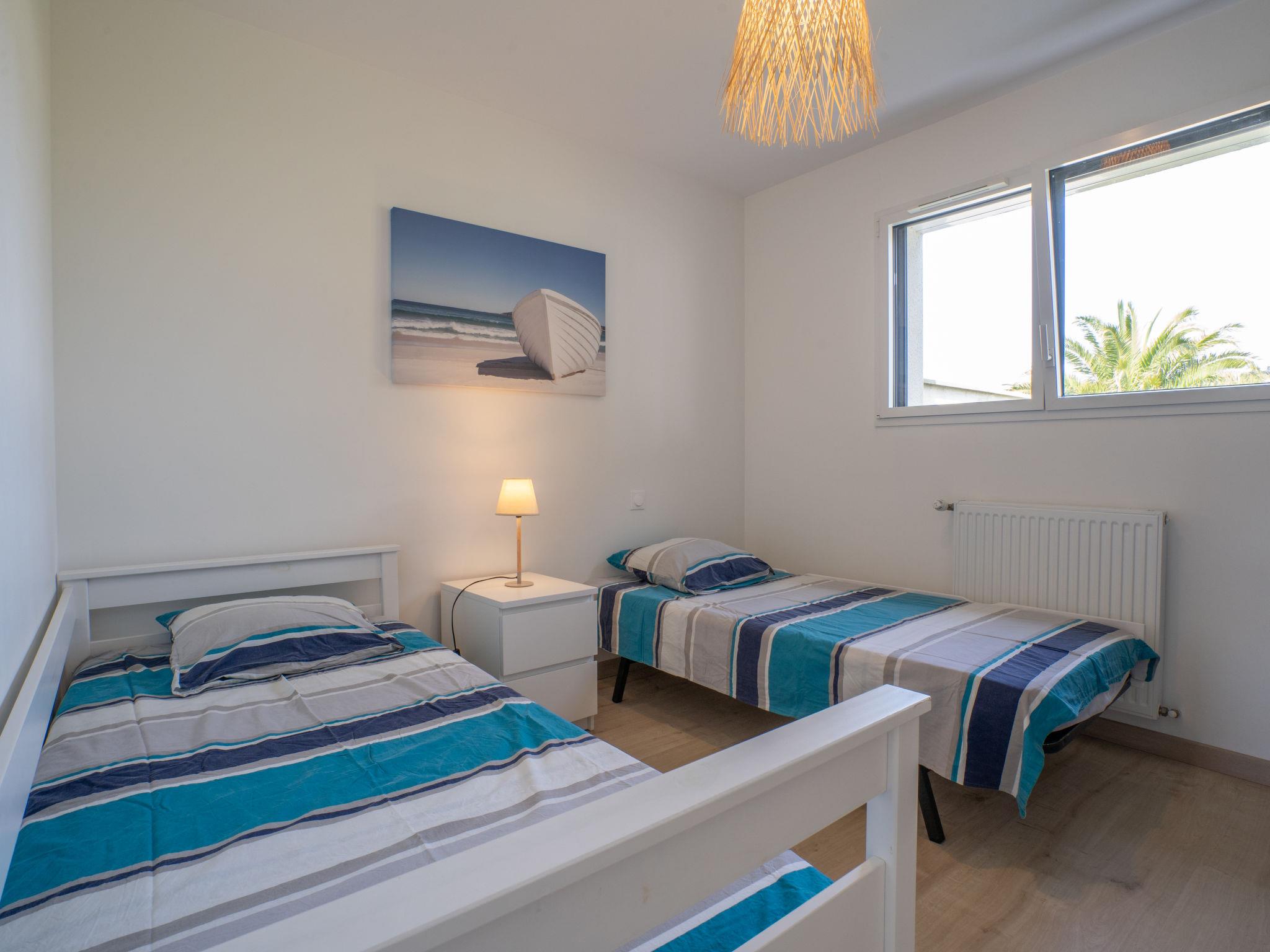 "Les Dunes", 4-room house 90 m2 on 2 levels. Bright, modern and tasteful furnishings: 2 rooms, each room with 1 french bed (140 cm, length 190 cm). Exit to the terrace. 1 room with 2 beds (90 cm, length 190 cm). Shower/WC, double hand-basin. Upper floor: living/dining room with dining table, bar, TV and flat screen. Exit to the balcony. Open kitchen (oven, dishwasher, 4 induction hot plates, toaster, kettle, microwave, freezer, electric coffee machine). Sep. WC. Electric heating. Large balcony 25 m2, south facing position and, east facing position, large terrace 70 m2. Terrace furniture, barbecue (portable), deck chairs (2), box-room. View of the sea. Facilities: washing machine, dryer, iron, children's high chair, baby cot. Internet (WiFi, free). Please note: non-smoking house. Smoke alarm.