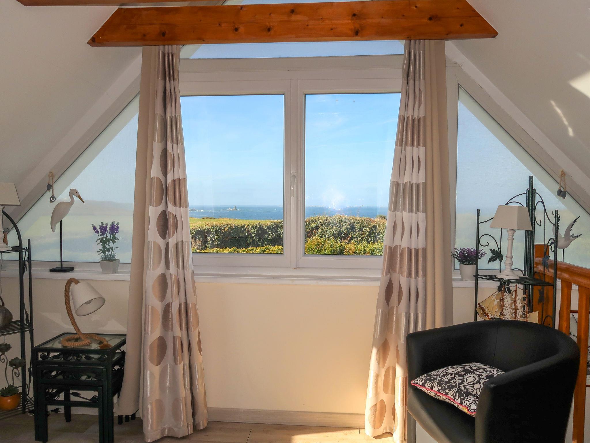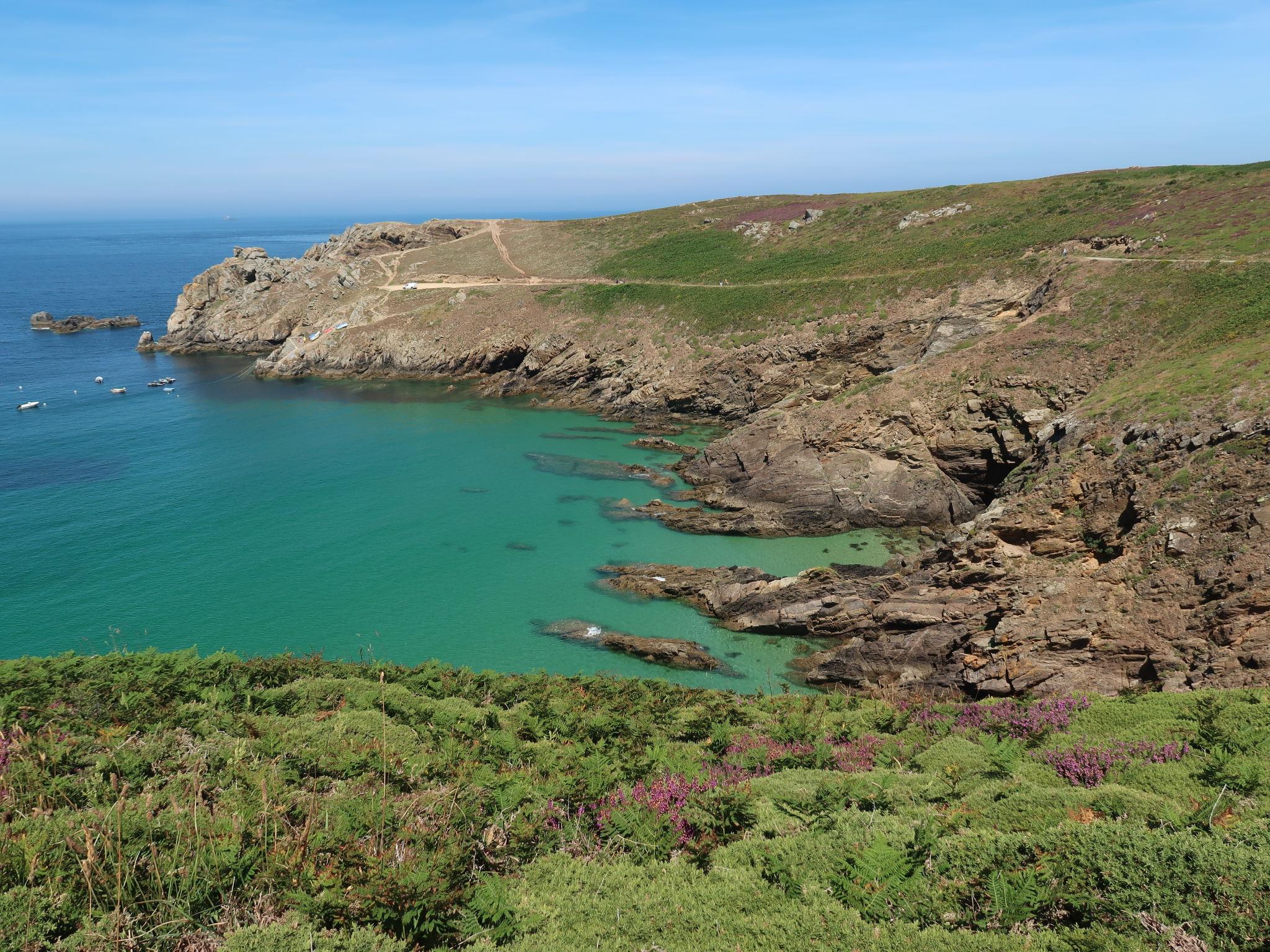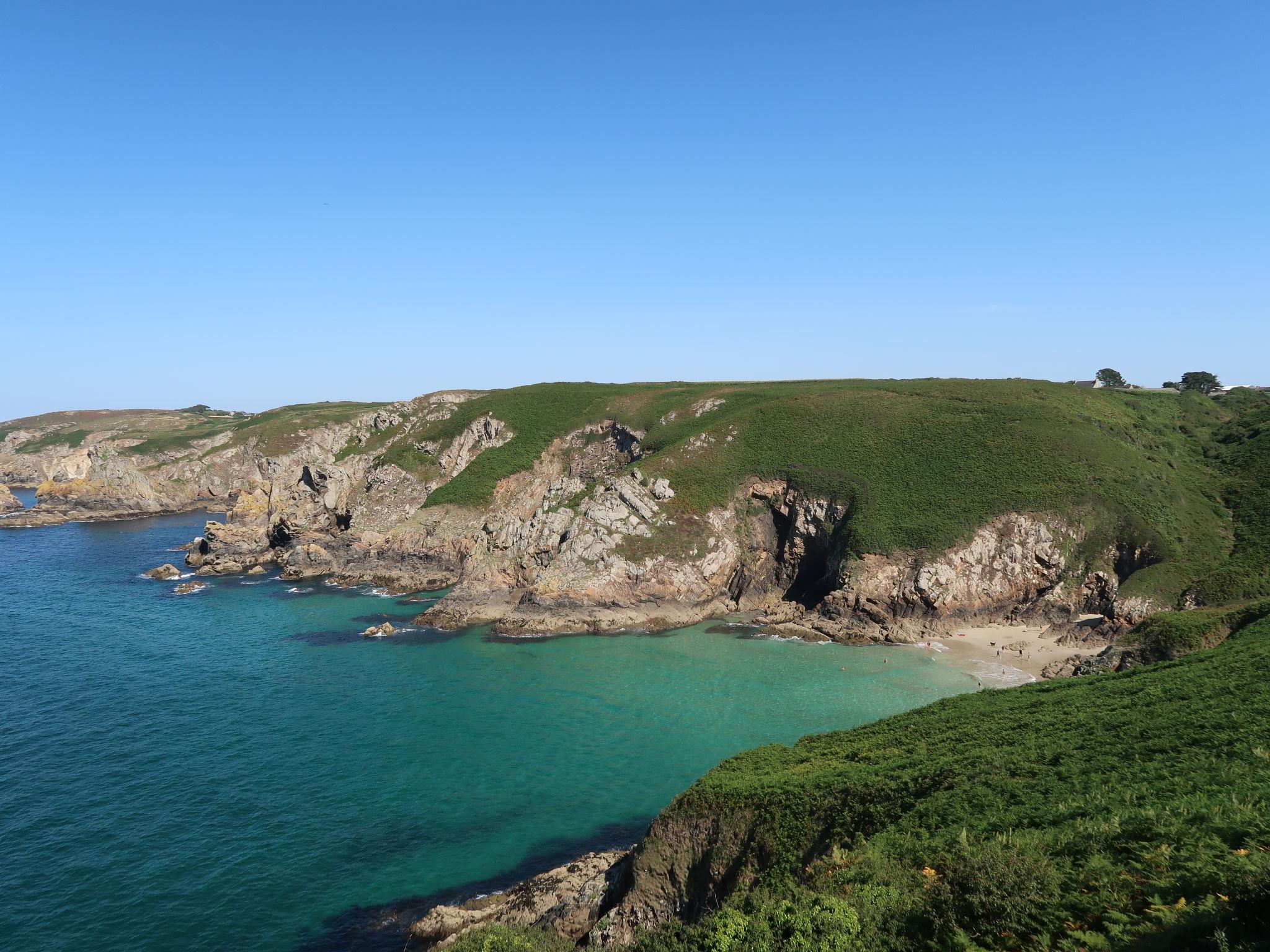 "Kerludu", 5-room house 130 m2 on 3 levels. Beautiful and rustic furnishings: large living/dining room with veranda with TV (flat screen). Open kitchen (oven, dishwasher, 4 induction hot plates, toaster, kettle, microwave, electric coffee machine) with dining table. Shower, sep. WC, double hand-basin. Upper floor: 1 room with sloping ceilings, ceiling height 173 - 175 cm with 1 bed (90 cm), 1 french bed (140 cm). 1 small room with sloping ceilings, ceiling height 173 - 175 cm with 1 double sofabed (1 x 140 cm, length 190 cm). Lounge with sloping ceilings. 2nd upper floor: (steep stair), 1 room with sloping ceilings, ceiling height 130 - 178 cm with 1 french bed (140 cm). Electric heating. Terrace furniture, barbecue, deck chairs (4). Beautiful panoramic view of the sea. Facilities: washing machine, dryer. Please note: non-smoking house. Smoke alarm. The room can only be accessed from outside, through an independant store room, with spare shower. Separate WC. The 2nd floor louneg has a panoramic view over the Pointe du Raz from a gallery. Small harbour "Le Vorlenn" 250 m away.