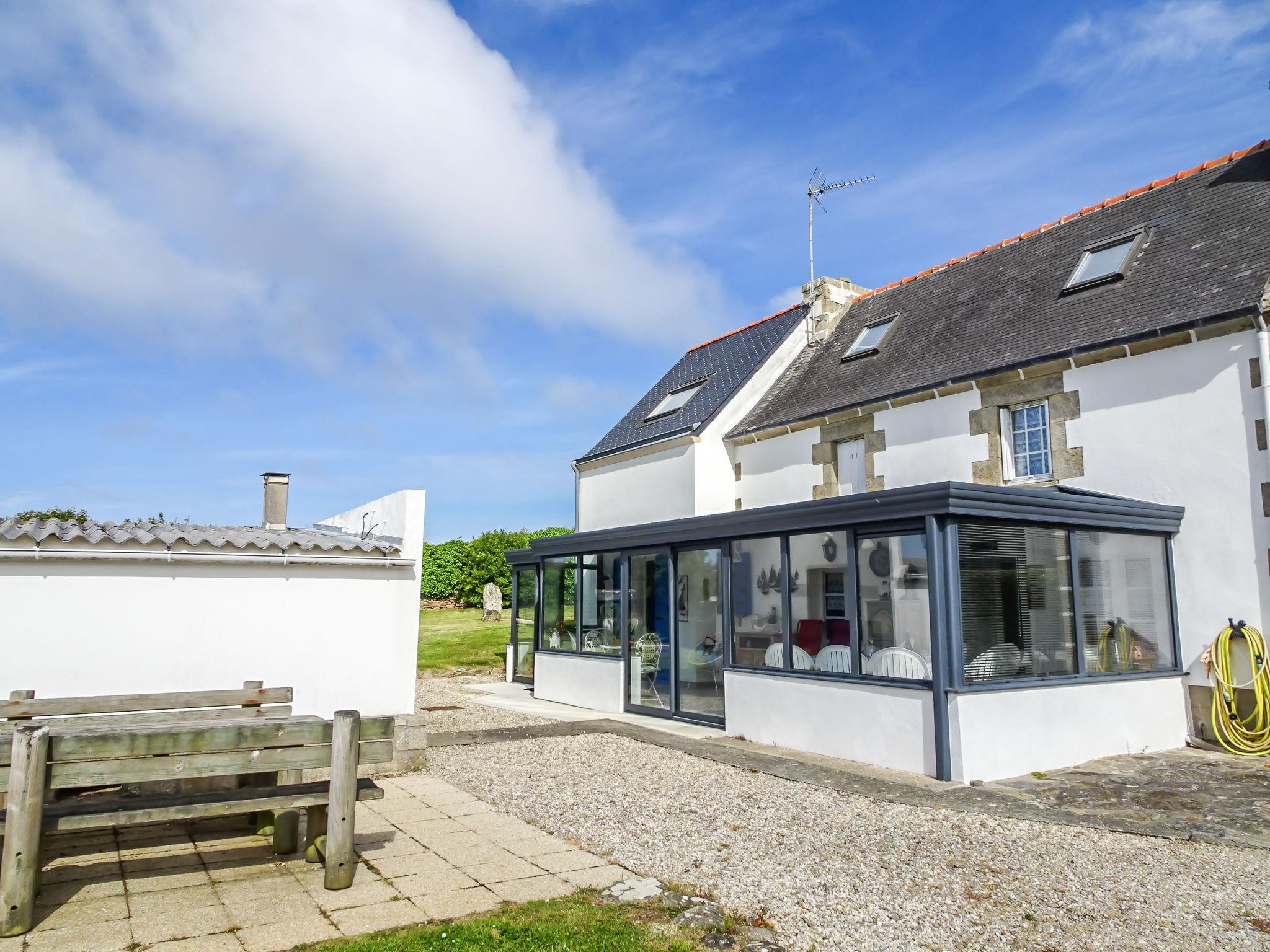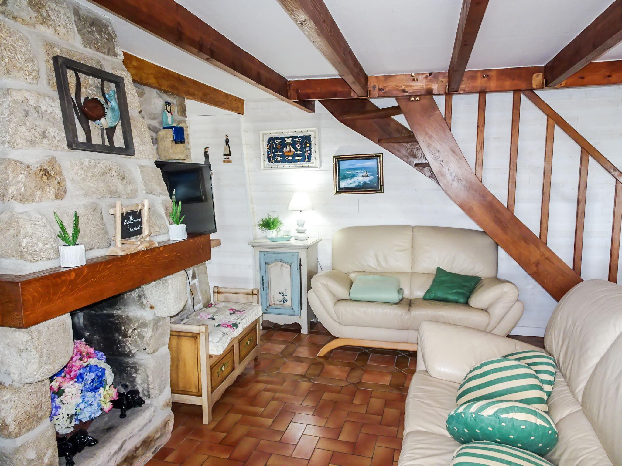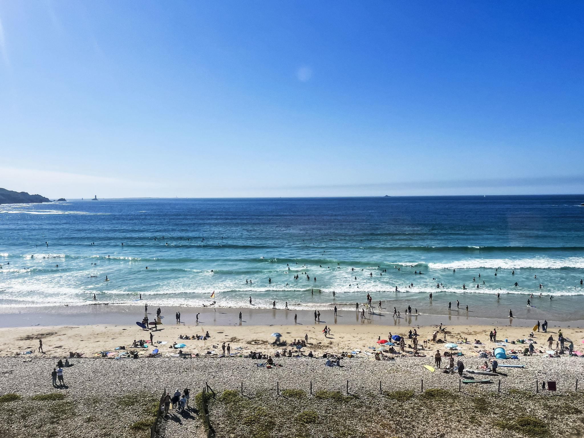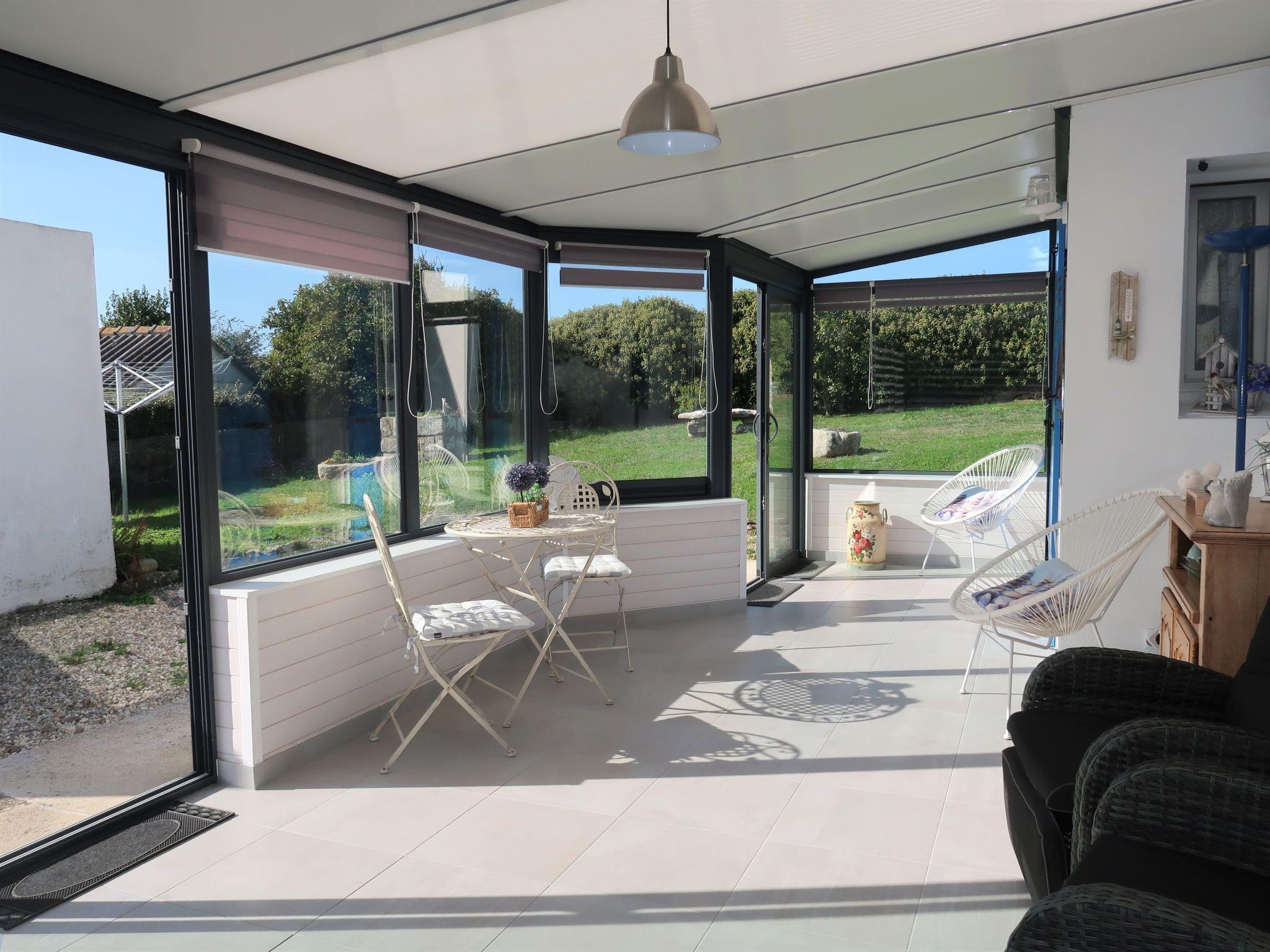 "Kerludu", 5-room house 130 m2 on 3 levels. Beautiful and rustic furnishings: large living/dining room with veranda with TV (flat screen). Open kitchen (oven, dishwasher, 4 induction hot plates, toaster, kettle, microwave, electric coffee machine) with dining table. Shower, sep. WC, double hand-basin. Upper floor: 1 room with sloping ceilings, ceiling height 173 - 175 cm with 1 bed (90 cm), 1 french bed (140 cm). 1 small room with sloping ceilings, ceiling height 173 - 175 cm with 1 double sofabed (1 x 140 cm, length 190 cm). Lounge with sloping ceilings. 2nd upper floor: (steep stair), 1 room with sloping ceilings, ceiling height 130 - 178 cm with 1 french bed (140 cm). Electric heating. Terrace furniture, barbecue, deck chairs (4). Beautiful panoramic view of the sea. Facilities: washing machine, dryer. Please note: non-smoking house. Smoke alarm. The room can only be accessed from outside, through an independant store room, with spare shower. Separate WC. The 2nd floor louneg has a panoramic view over the Pointe du Raz from a gallery. Small harbour "Le Vorlenn" 250 m away.
