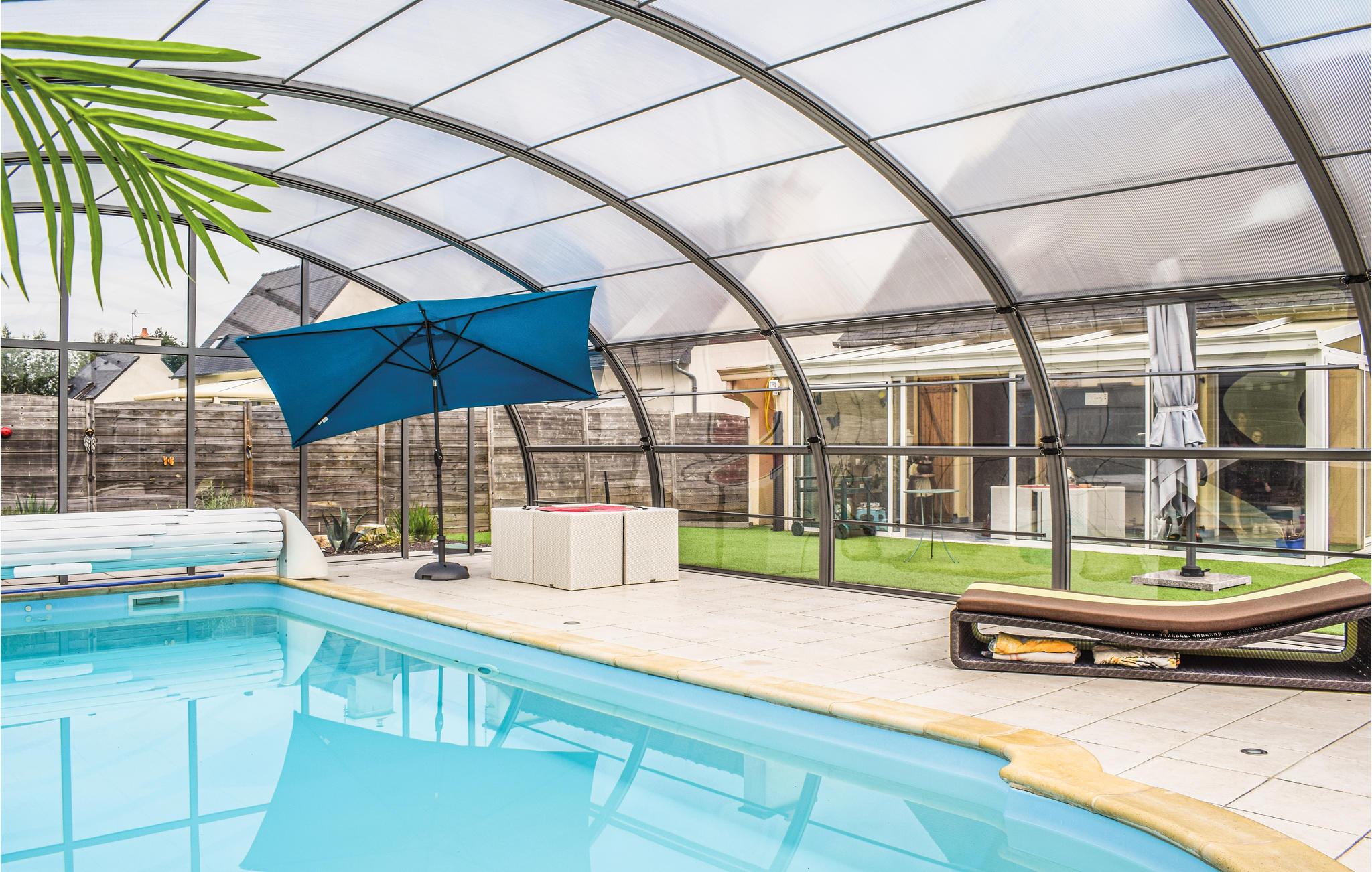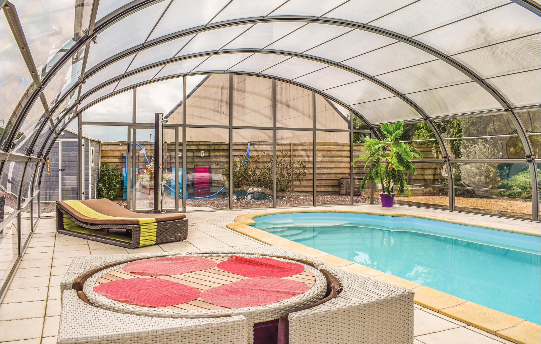 Vandhundene kan godt skynde sig at pakke badetøjet, for her er en dejlig pool, glasoverdækket og opvarmet, der ligger på den bageste del af den store grund, hvor I kan plaske og svømme uanset vejret. Desuden er her en skøn terrasse med havemøbler og en boulebane, så I kan få afgjort, hvem der har familiens bedste boldøje i dette klassiske, franske spil.
