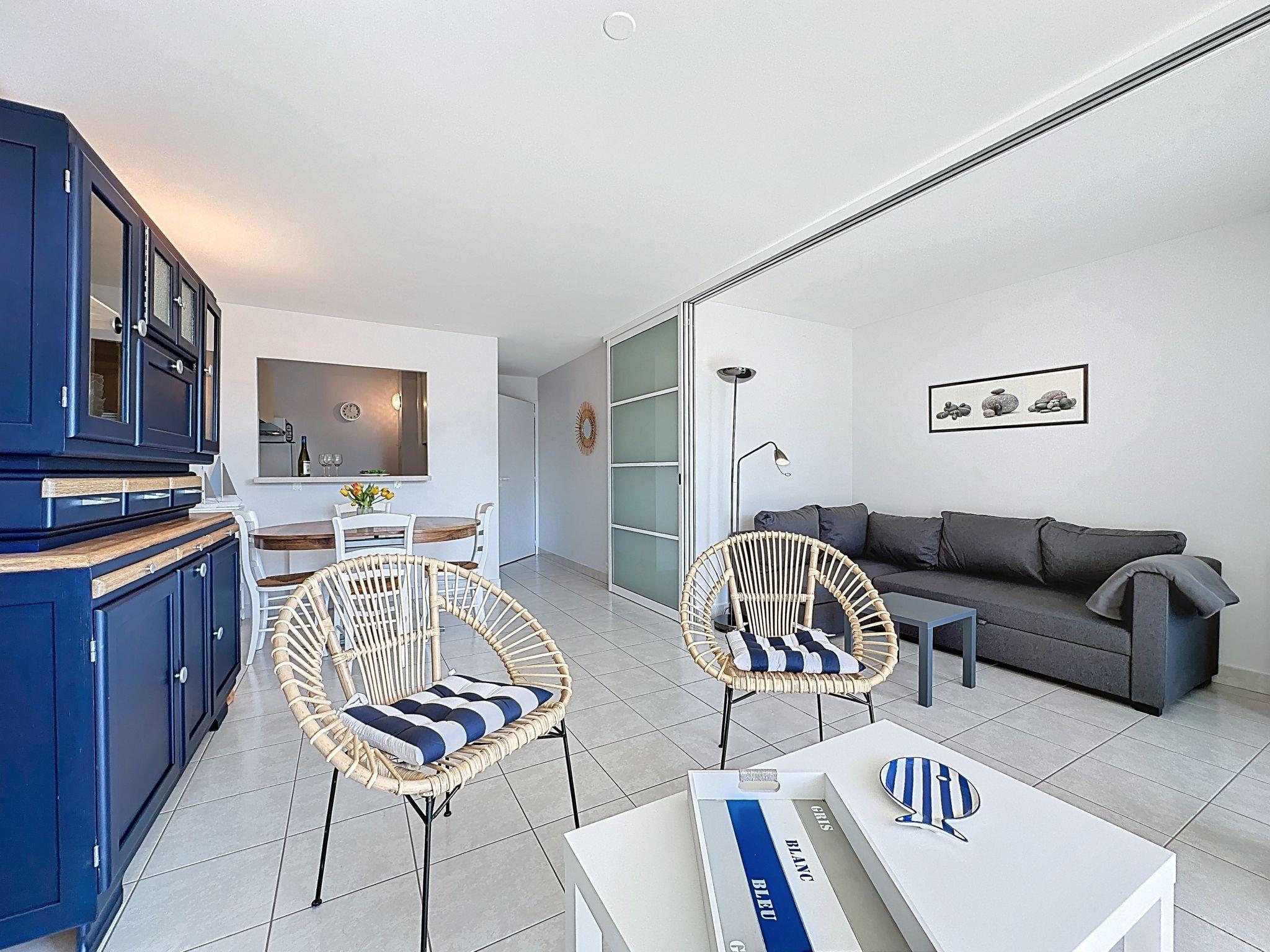 "Le Cabestan - Appt n°5", 3-room apartment 60 m2 on 1st floor. Beautiful and modern furnishings: living/dining room with TV (flat screen). 1 room with 1 french bed (1 x 160 cm, length 200 cm). 1 room with 2 beds (90 cm, length 190 cm). Kitchen (oven, dishwasher, 3 induction hot plates, toaster, kettle, microwave, electric coffee machine, Capsules for coffee machine (Nespresso) extra). Shower, sep. WC. Electric heating. Balcony 10 m2, south facing position. Balcony furniture, deck chairs (2). Facilities: washing machine, children's high chair, baby cot, hair dryer. Internet (WiFi, free). Parking space n 2 (fenced 1 car). Please note: non-smokers only. Smoke alarm. Offer by a private individual according to Art. 155, IV of CGI. 441310013819A