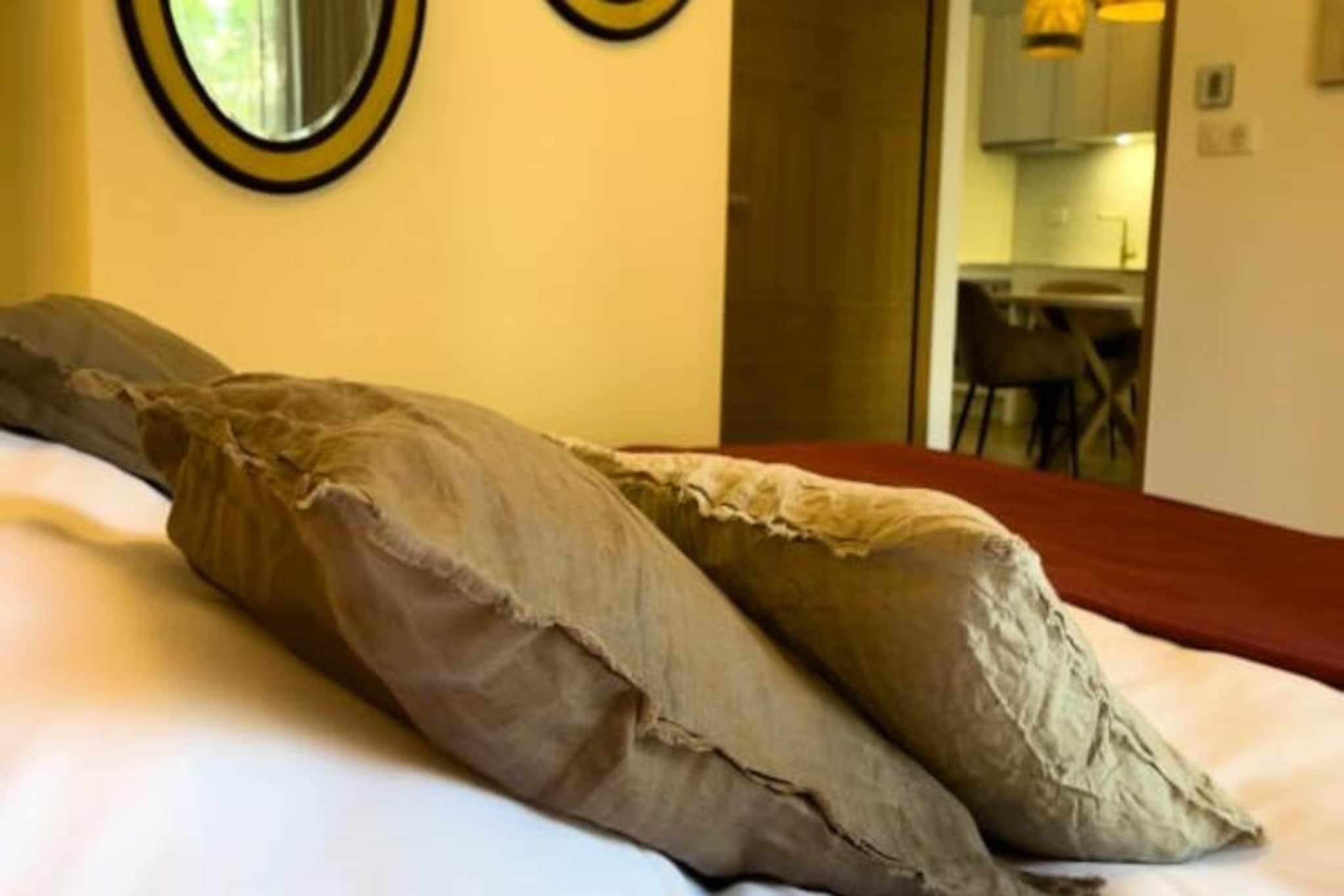 I hjertet af den charmerende kystby Pornichet tilbyder denne elegante lejlighed med et soveværelse et roligt tilflugtssted kun få skridt fra stranden. Omgivet af frodige fyrretræer og maleriske villaer kombinerer ejendommen moderne komfort med tidløs kystcharme. Uanset om du er her for en romantisk ferie eller en fredelig flugt, skaber den rolige atmosfære og den fantastiske udsigt de perfekte rammer for afslapning. Fra dine private balkoner kan du nyde skønheden i de omkringliggende haver og den ikoniske arkitektur i denne pulserende by. Denne lejlighed i stueetagen er omhyggeligt designet til at rumme op til fire gæster. Soveværelset har et eget brusebad og egen balkon, mens stuen tilbyder ekstra sovepladser. Det fuldt udstyrede køkken indeholder alt hvad du behøver for at tilberede måltider, fra ovn og mikrobølgeovn til opvaskemaskine og køkkenredskaber. Aircondition sikrer din komfort året rundt, og Wi-Fi er tilgængeligt overalt på ejendommen. Tilgængelighed er en prioritet med kørestolsvenlige faciliteter og adgang i stueetagen. Yderligere faciliteter såsom vaskemaskine/tørretumbler og valgfrie tjenester som parkering, spa-adgang og massage forbedrer dit ophold. Lejligheden ligger kun to minutters gang fra stranden og er perfekt placeret til at udforske Pornichets livlige marina, kasino og ikoniske vartegn som