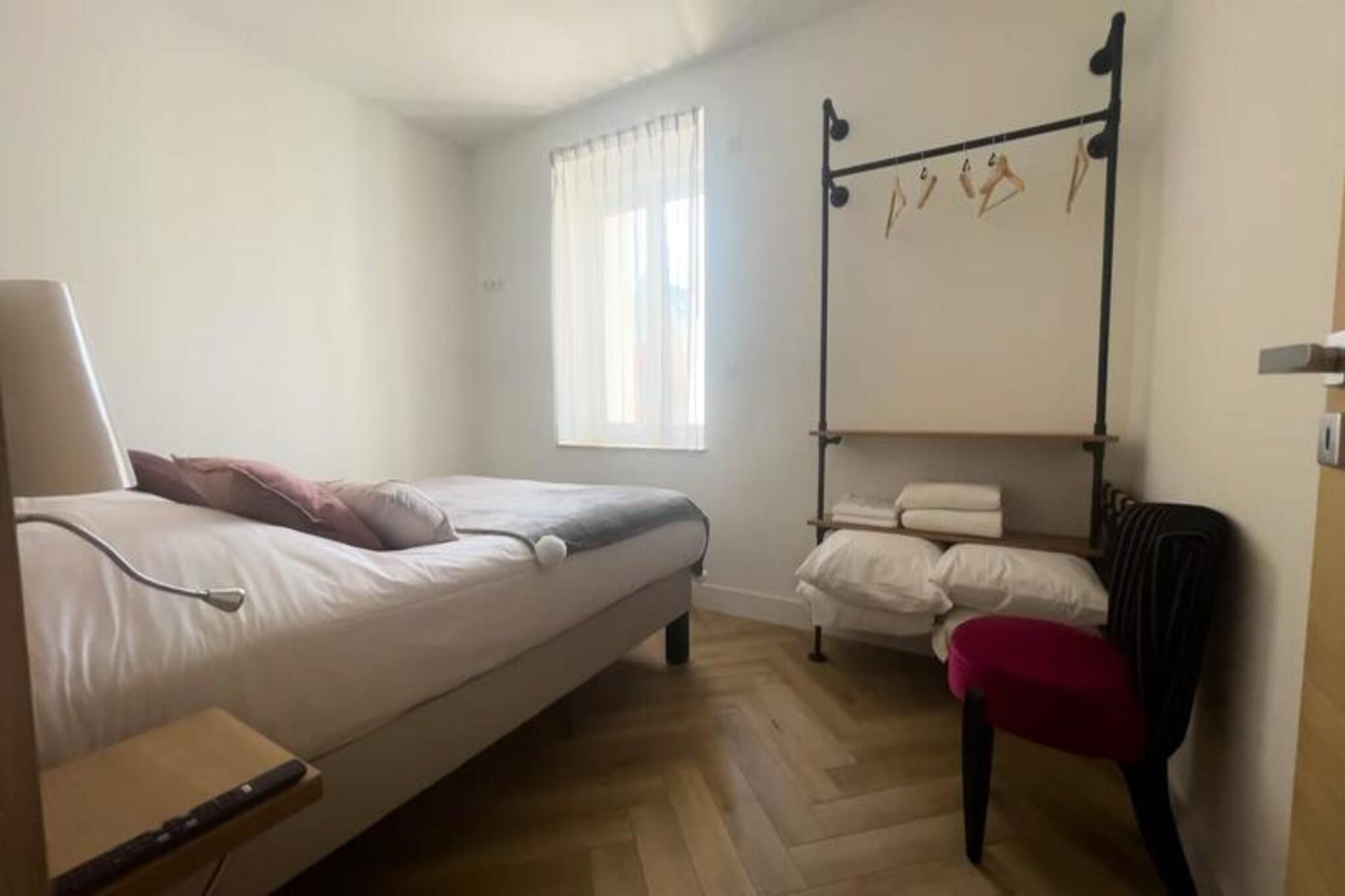 Denne T3 lejlighed, beliggende i en ?rhundrede gammel bygning, tilbyder hotelservice for et behageligt ophold. Det har to sovev?relser med udsigt over fyrretr?er og villaer ved havet, et badev?relse med bruser og eget toilet samt en stue med en sovesofa til to ekstra g?ster. Lejligheden har aircondition, Wi-Fi, kvalitetslinned og en vaskemaskine-t?rretumbler. En privat udvendig terrasse tilf?jer charmen. K?ledyr er ikke tilladt. Lejligheden er ideelt beliggende i Pornichet, en pulserende badeby. G?sterne kan nemt f? adgang til stranden, caf?er, restauranter og butikker. Udforsk n?rliggende attraktioner s?som kasinoet, marinaen og livlige kvarterer. Omr?det er rigt p? historie med Gu?rande, strandenge, Bri?re regionalpark og Saint-Nazaire, kendt for skibsbygning. Morbihan-bugten ligger ogs? kun en kort k?retur derfra. Lejligheden har et fuldt udstyret k?kken med ovn, mikroovn, opvaskemaskine, k?leskab og fryser, med plads til op til 5 personer. Yderligere tjenester til r?dighed mod et gebyr omfatter parkering, adgang til et spa-hammam og massage. Den f?lles terrasse byder p? natursk?n udsigt over stranden og fyrretr?er, hvilket er et perfekt sted at slappe af.
