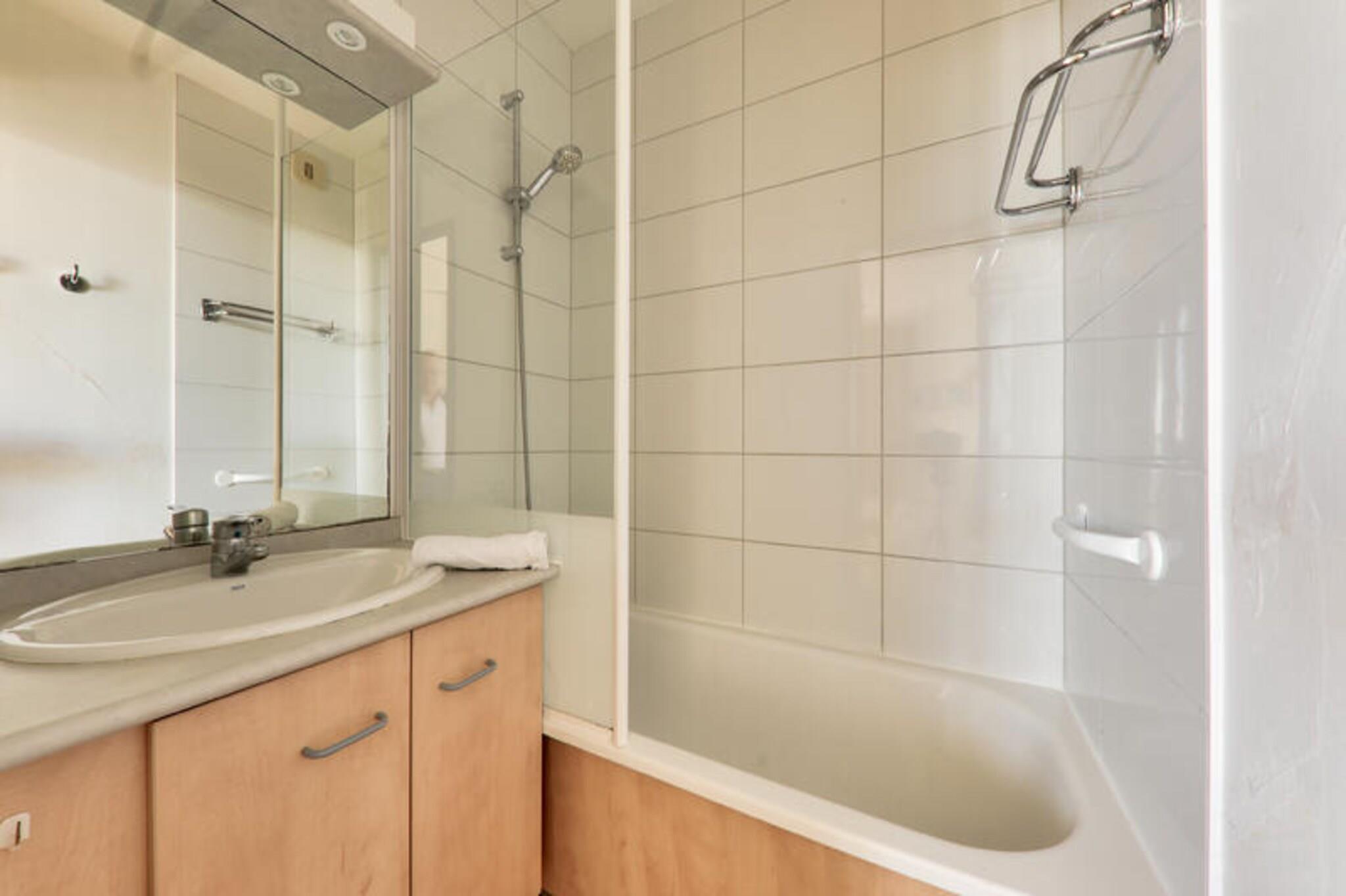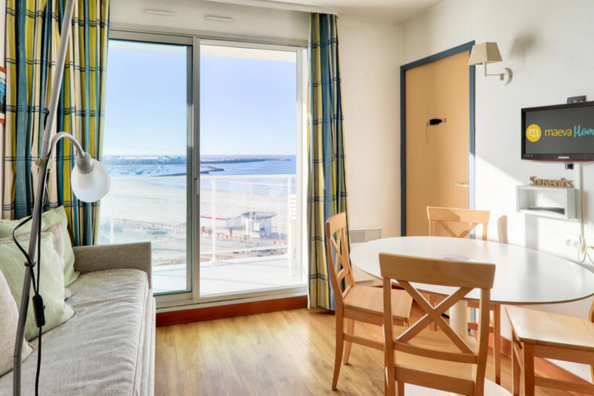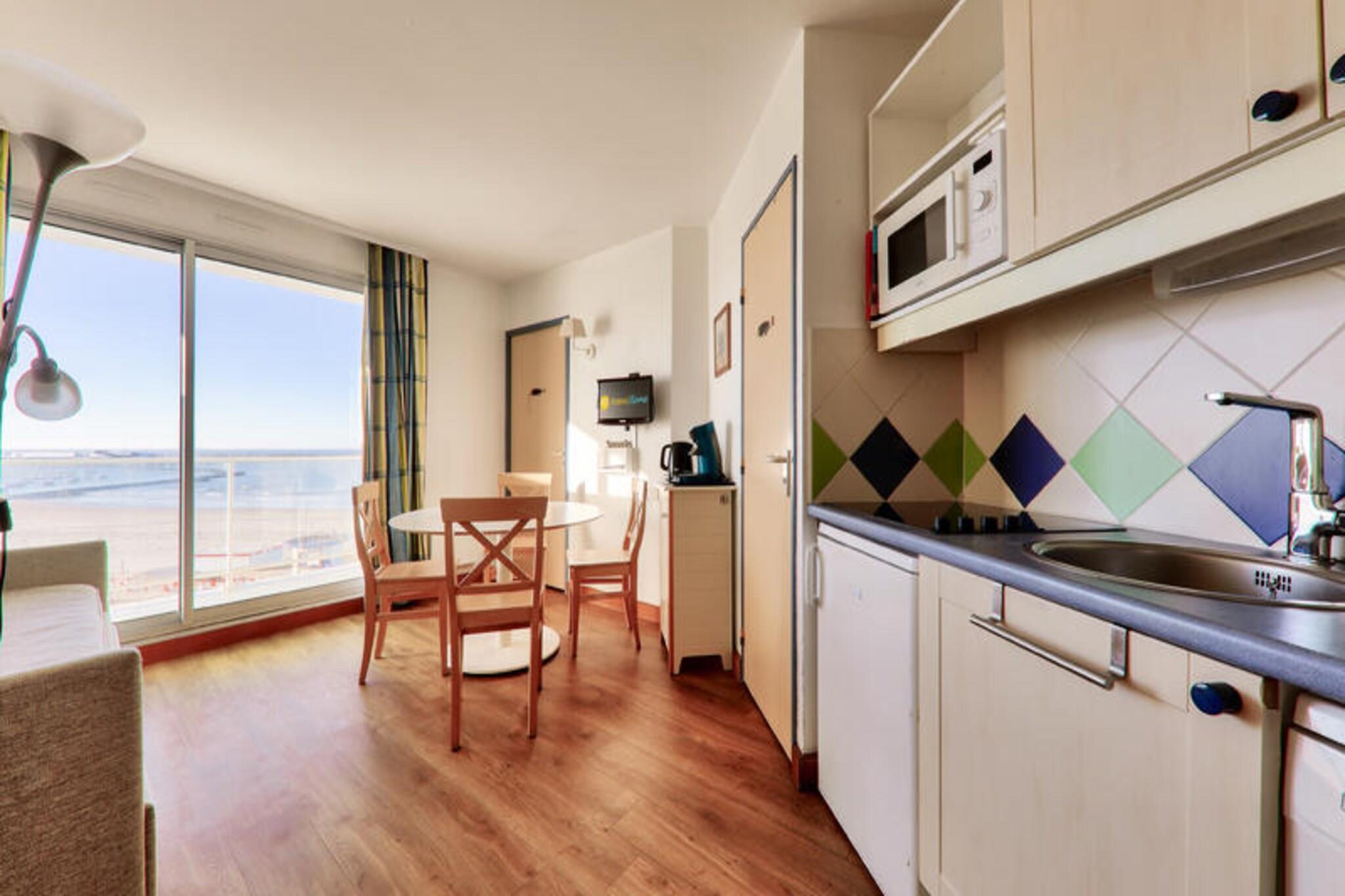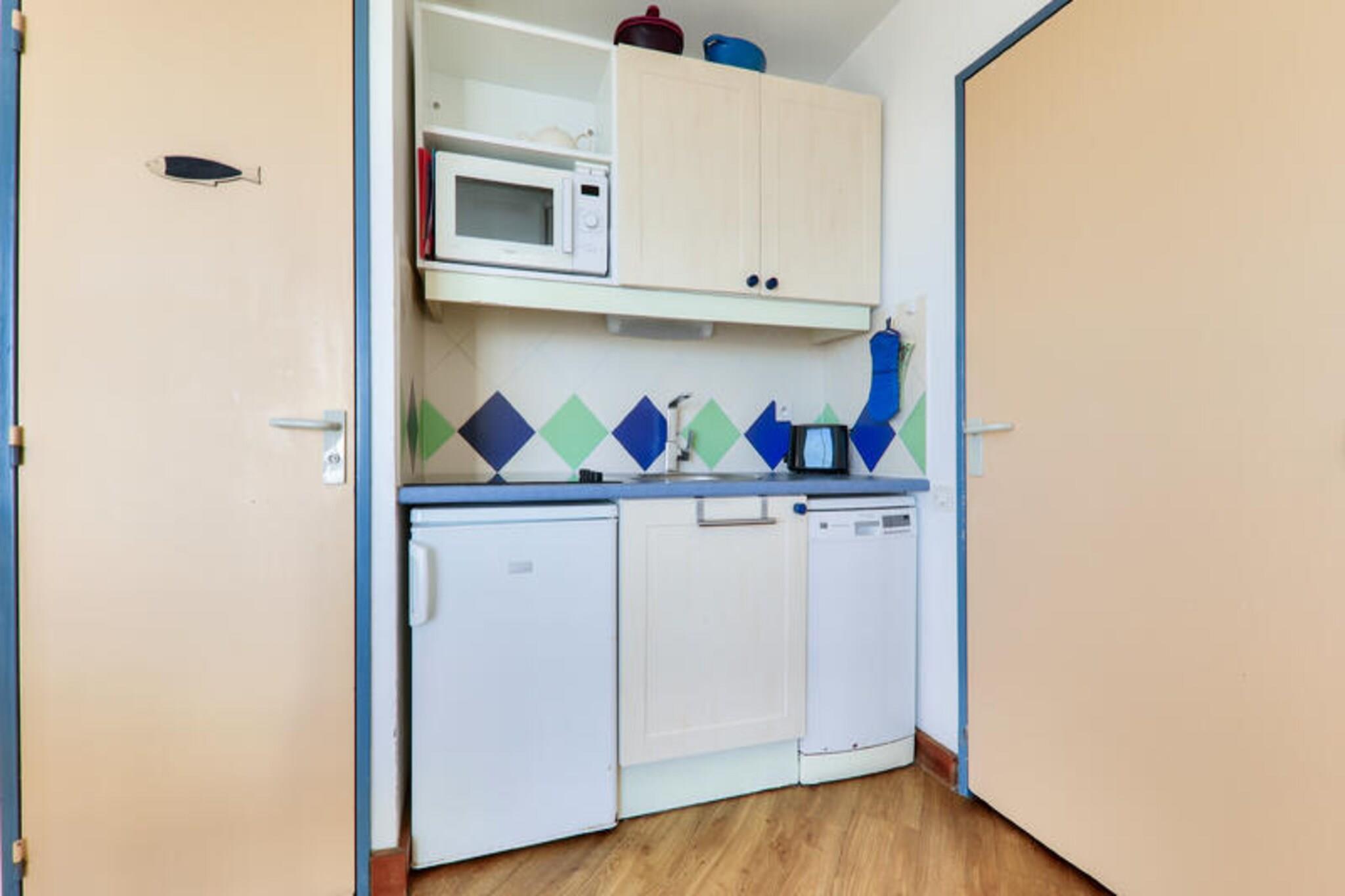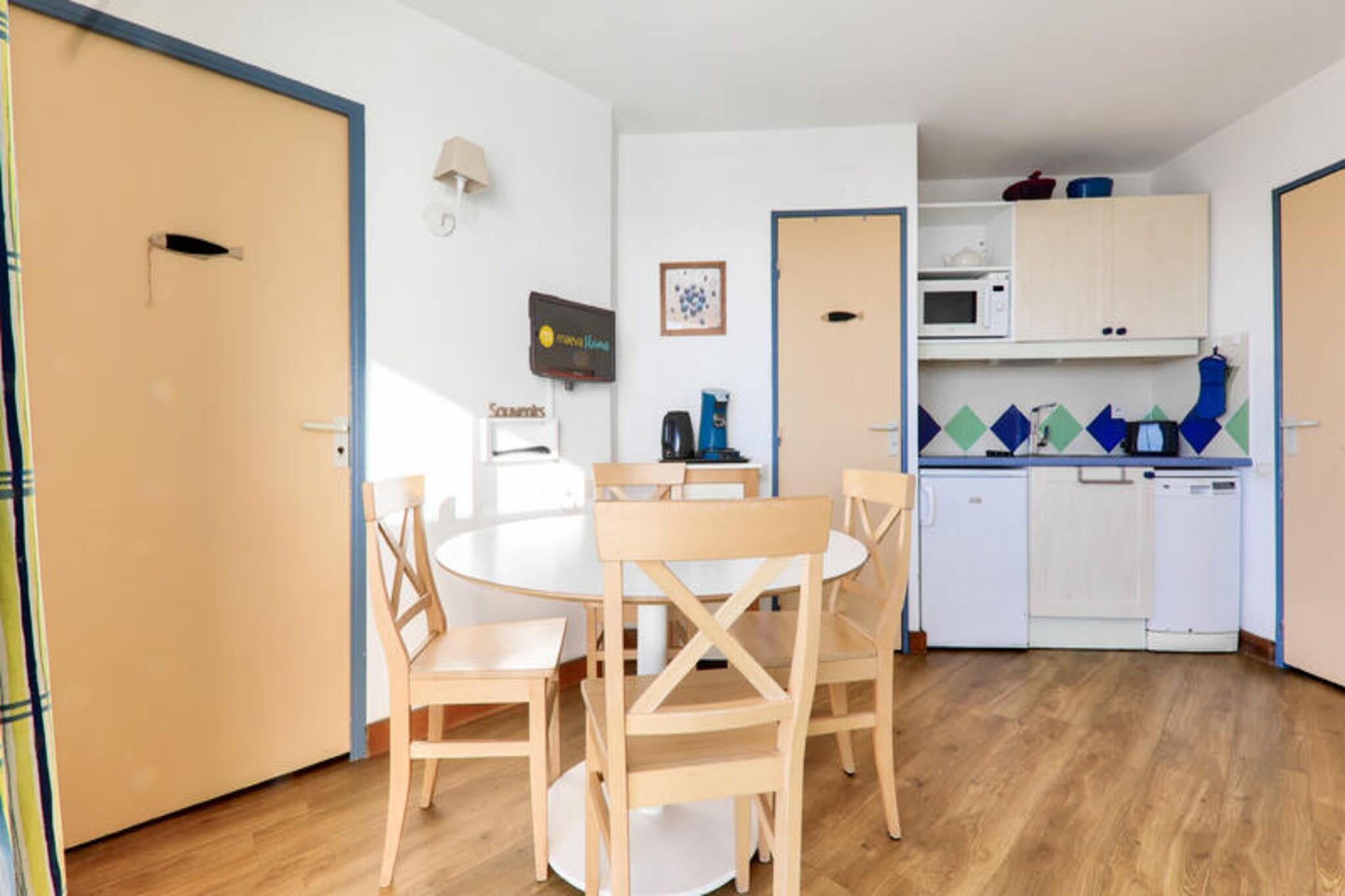Denne veludstyrede lejlighed er ideel til familier eller små grupper, og tilbyder komfortabel indkvartering for op til 6 personer. Det har en stue med en sovesofa og en udtræksseng, et separat soveværelse med en dobbeltseng og et kabineområde med køjesenge. Lejligheden er kæledyrsvenlig (mod tillægsgebyr), og tjenester såsom WiFi, sengelinned og håndklæder er tilgængelige mod et ekstra gebyr. Slutrengøring er obligatorisk og kan betales ved ankomsten. Perfekt beliggende kun 20 meter fra stranden giver denne lejlighed direkte adgang til vandet. Thalassoterapicentret og de lokale butikker ligger kun 600 meter væk, så gæsterne kan nyde forskellige wellness-behandlinger og butikker. Ud over stranden omfatter nærliggende aktiviteter vandsport, golf, tennis og besøg på kasinoet. Boligen tilbyder også fordelagtige priser på thalassoterapicentret for behandlinger og adgang til Marin-spaen. Indvendigt har lejligheden et halvåbent køkken udstyret med alt det nødvendige. Badeværelset har badekar, og der er separat toilet for ekstra bekvemmelighed. En altan byder på en dejlig udendørs plads til at slappe af. Yderligere faciliteter omfatter cykelopbevaring, elevator og mulighed for overdækket parkering, afhængigt af tilgængelighed.