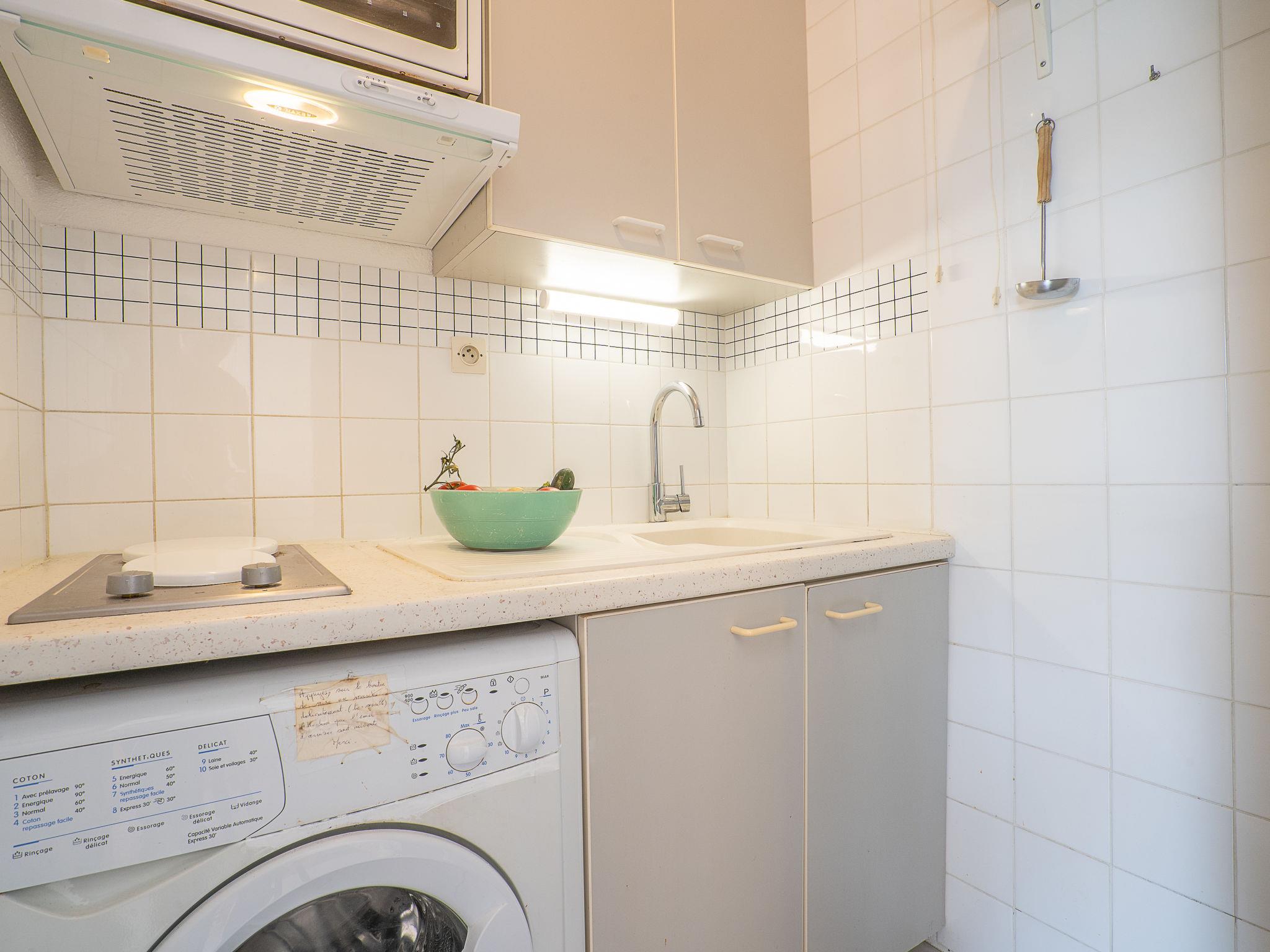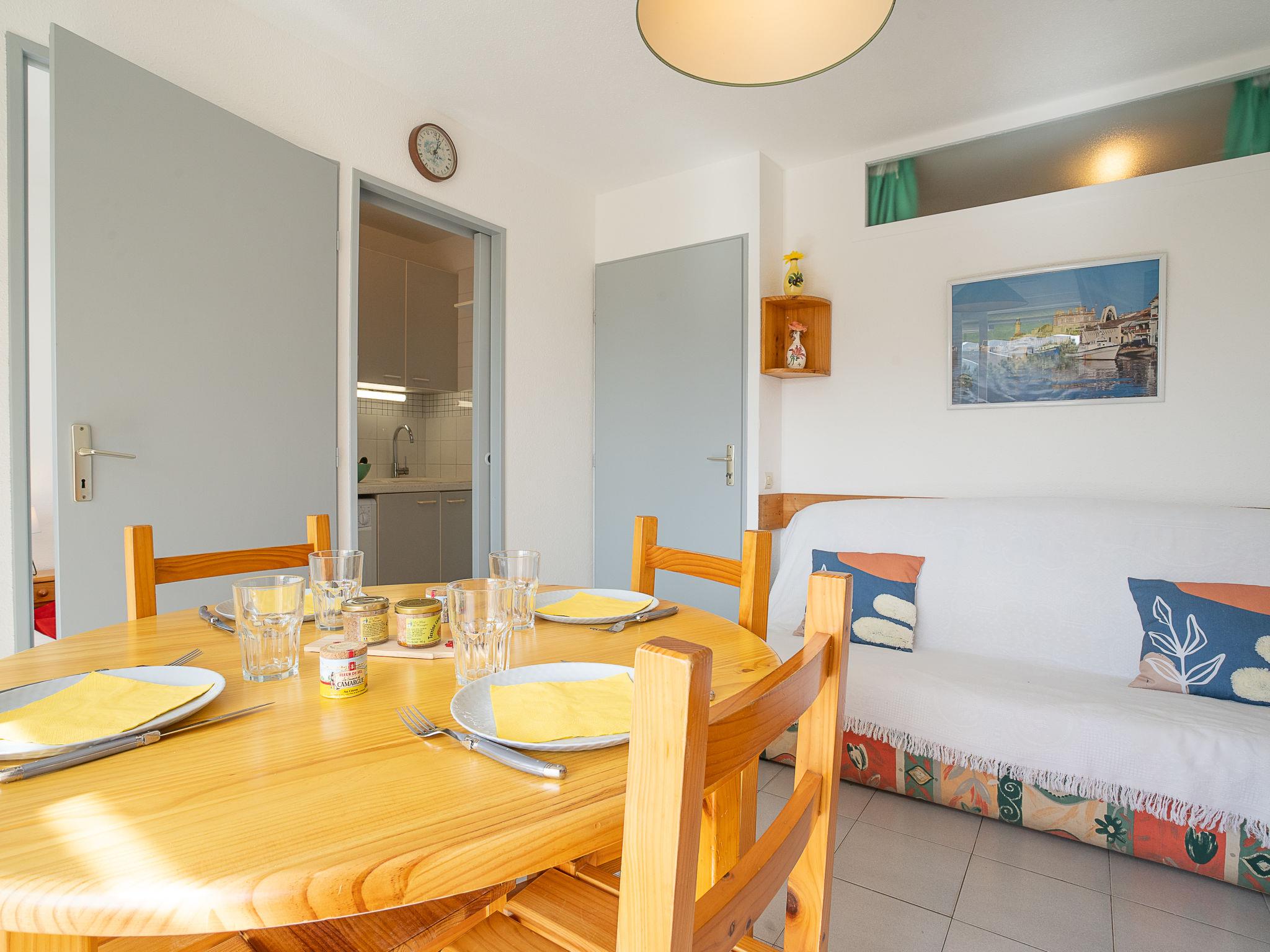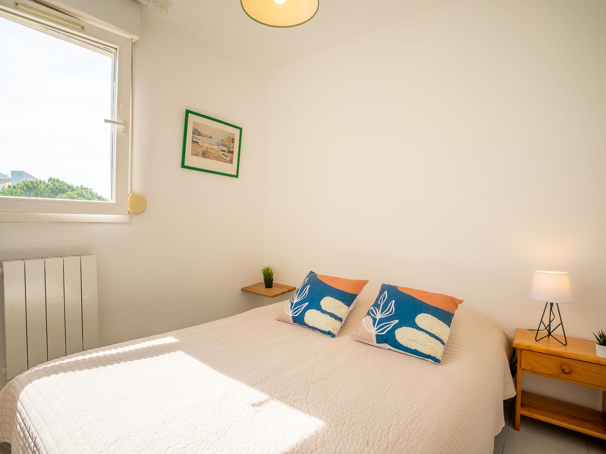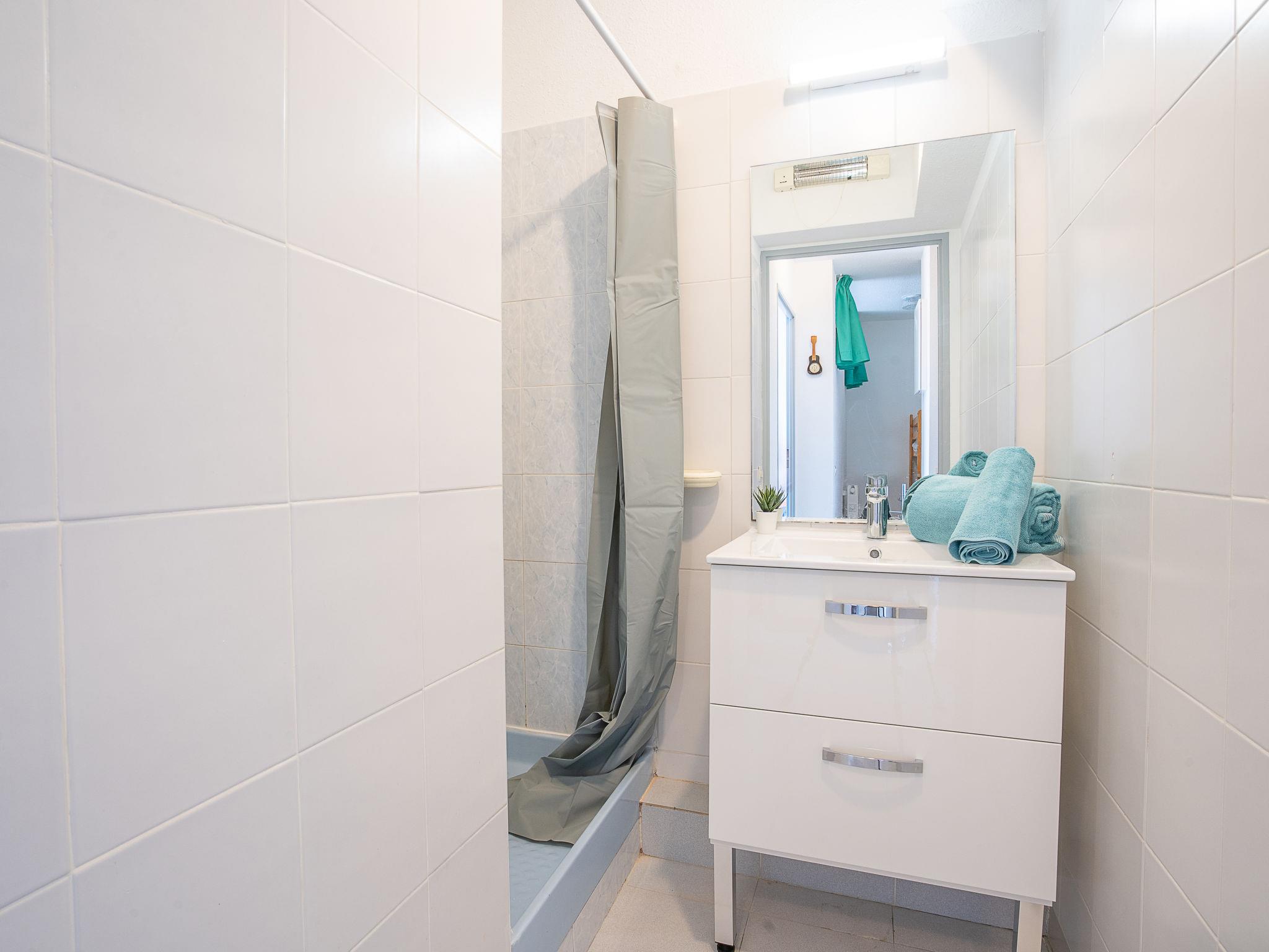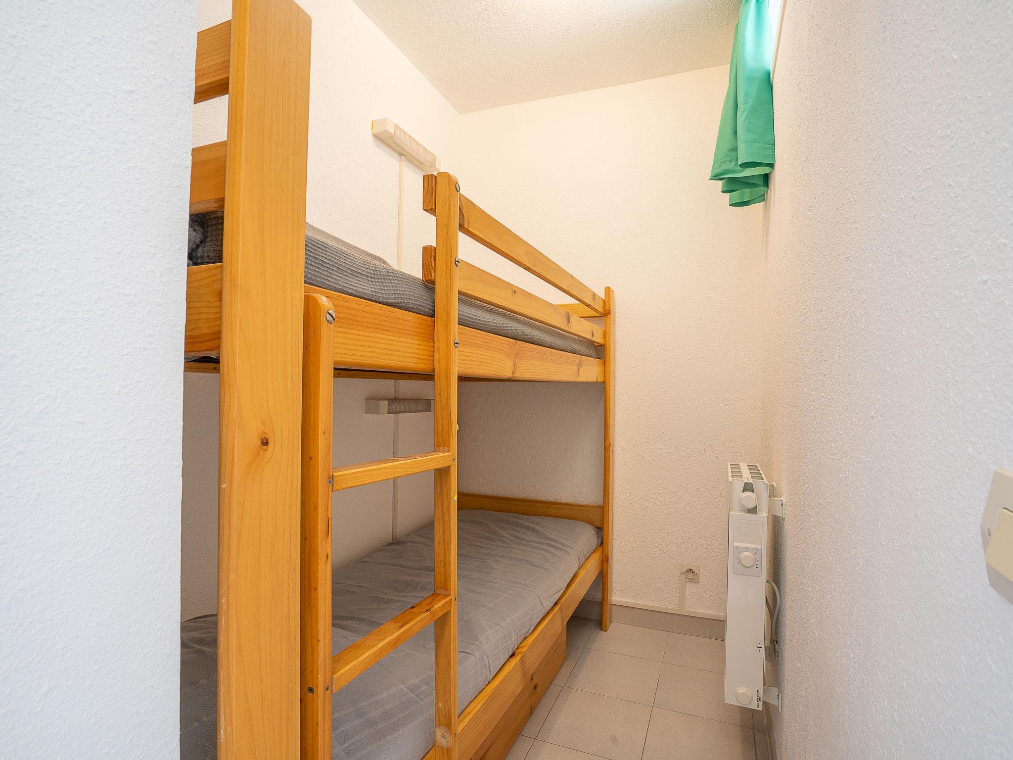 2-room apartment 27 m2 on 3rd floor. Living/dining room with TV. 1 room with 1 french bed (140 cm, length 190 cm). Sleeping alcove with 1 x 2 bunk beds (80 cm, length 190 cm). Kitchenette (2 hot plates, mini-oven, microwave, freezer). Shower, sep. WC. Electric heating. Terrace 7 m2, north-west facing position. Terrace furniture. View of the swimming pool. Facilities: washing machine. Internet (WiFi, extra). Parking. Please note: maximum 1 pet/ dog allowed. Smoke alarm. Instead of an enclosed bedroom, some sleeping areas are located in an open-plan area (gallery, alcove, etc.).