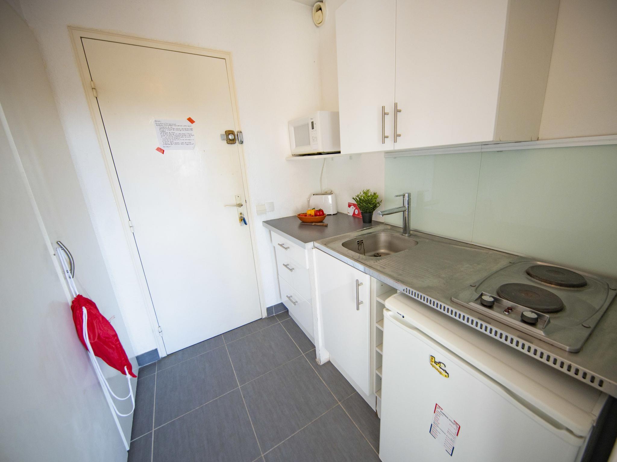 1-room studio 25 m2 on 3rd floor. Living/sleeping room with 1 double sofabed (1 x 140 cm, length 190 cm), dining table and TV (flat screen). Exit to the terrace. Small kitchen in the entrance (2 hot plates, toaster, kettle, microwave, freezer, electric coffee machine). Bath/WC. Electric heating. Terrace 12 m2, north facing position and west facing position. Terrace furniture, electric barbecue. Panoramic view of the swimming pool, the canal and the port. Facilities: washing machine. Internet (WiFi, free). Parking (1 car). Please note: non-smokers only. Maximum 1 pet/ dog allowed. Smoke alarm, no lift. Offer by a private individual according to Art. 155, IV of CGI. 30133000975QZ