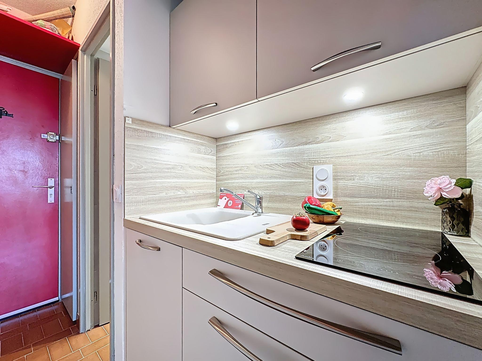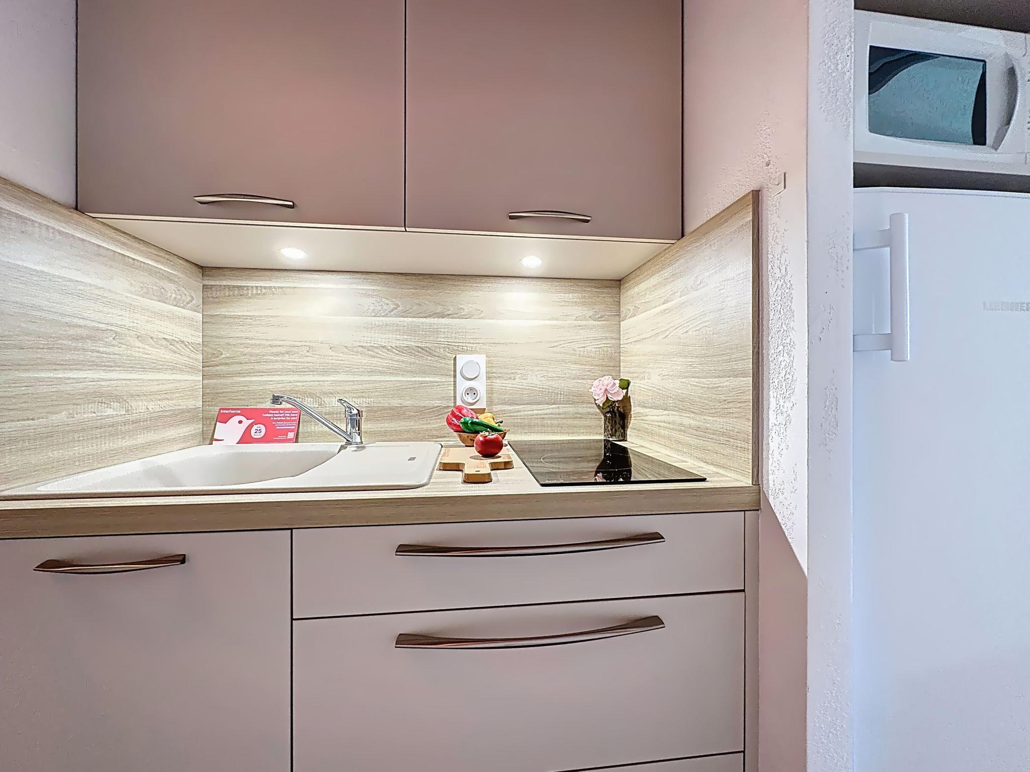 1-room apartment 26 m2 on 1st floor. Studio with 1 double sofabed (140 cm, length 190 cm), 1 double wall-trunk bed (2 x 80 cm, length 200 cm), kitchen corner, TV and flat screen. Exit to the loggia, south facing position and east facing position. Small kitchen in the entrance (2 induction hot plates, toaster, kettle, freezer, electric coffee machine, combination microwave). Shower/WC. Electric heating. Balcony furniture, covered balcony. Facilities: washing machine. Internet (WiFi, free). Parking (1 car). Please note: non-smokers only. Maximum 1 small pet/ dog allowed. Smoke alarm, no lift. Offer by a private individual according to Art. 155, IV of CGI. 30133000994BN
