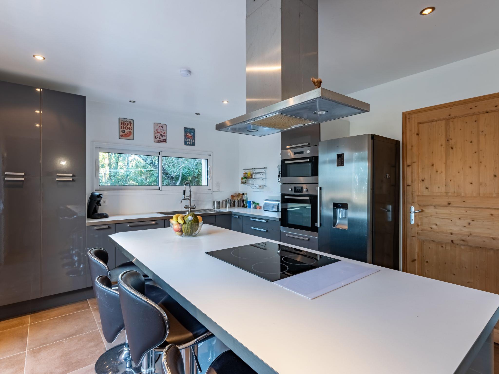 4-room house 130 m2 on 2 levels. Spacious: large living/dining room with 1 double sofabed (160 cm, length 190 cm), open-hearth fireplace (only for decoration), TV (flat screen), air conditioning. Exit to the terrace. 1 room with 1 french bed (160 cm, length 190 cm), shower/WC and TV (flat screen), air conditioning. Open kitchen (oven, dishwasher, 4 induction hot plates, kettle, microwave, freezer, electric coffee machine). Exit to the terrace. Sep. WC. Electric heating. On the lower ground floor: 2 rooms with panoramic window, each room with 1 french bed (140 cm, length 190 cm), shower/WC and TV. Small balcony, terrace 13 m2, south facing position. Terrace furniture, deck chairs (2). Partial view of the sea. Facilities: washing machine, iron, hair dryer. Internet (WiFi, free). Please note: non-smokers only. Maximum 1 small pet/ dog allowed. Smoke alarm. 2A247001315FA