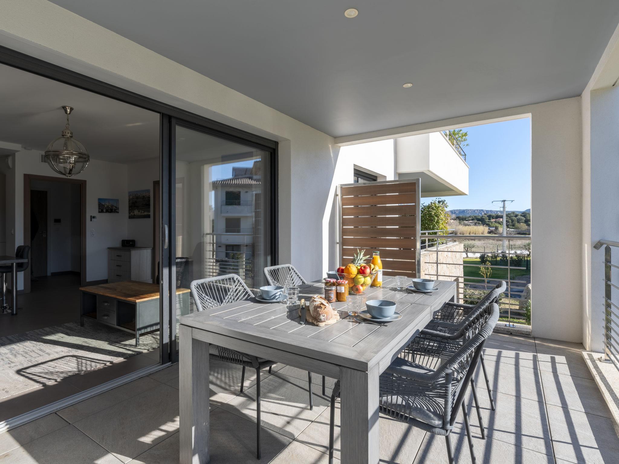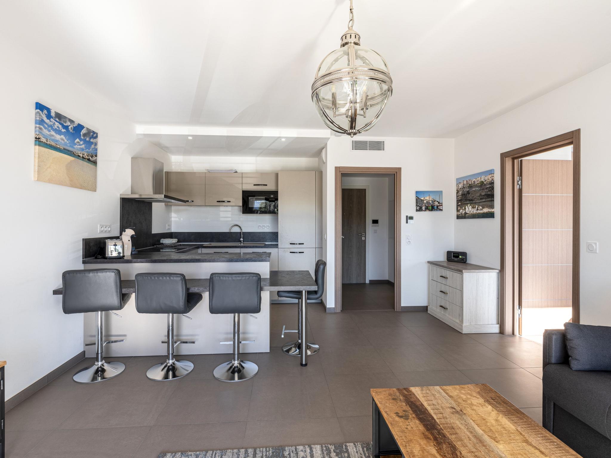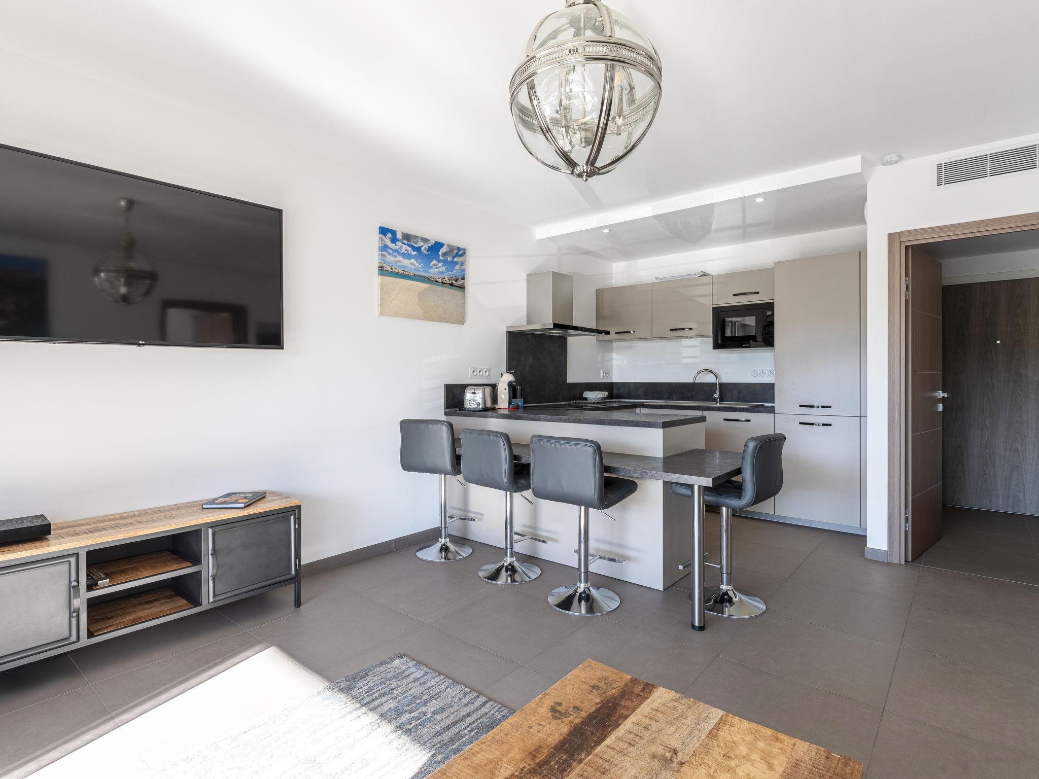 "Domaine d'Arca G7", 2-room apartment 50 m2 on 2nd floor. Modern furnishings: living/dining room with panoramic window with 1 double sofabed (140 cm, length 190 cm), TV (flat screen). Exit to the balcony, to the terrace. 1 room with 1 french bed (160 cm, length 200 cm). Exit to the terrace. Open kitchen (oven, dishwasher, 1 induction hot plates, 4 gas rings, kettle, microwave, electric coffee machine). Bath/WC. Electric heating, air-conditioning. Terrace 20 m2. Terrace furniture. Facilities: washing machine. Internet (WiFi, free). Parking. Please note: non-smokers only. Smoke alarm. 2A247000121E8