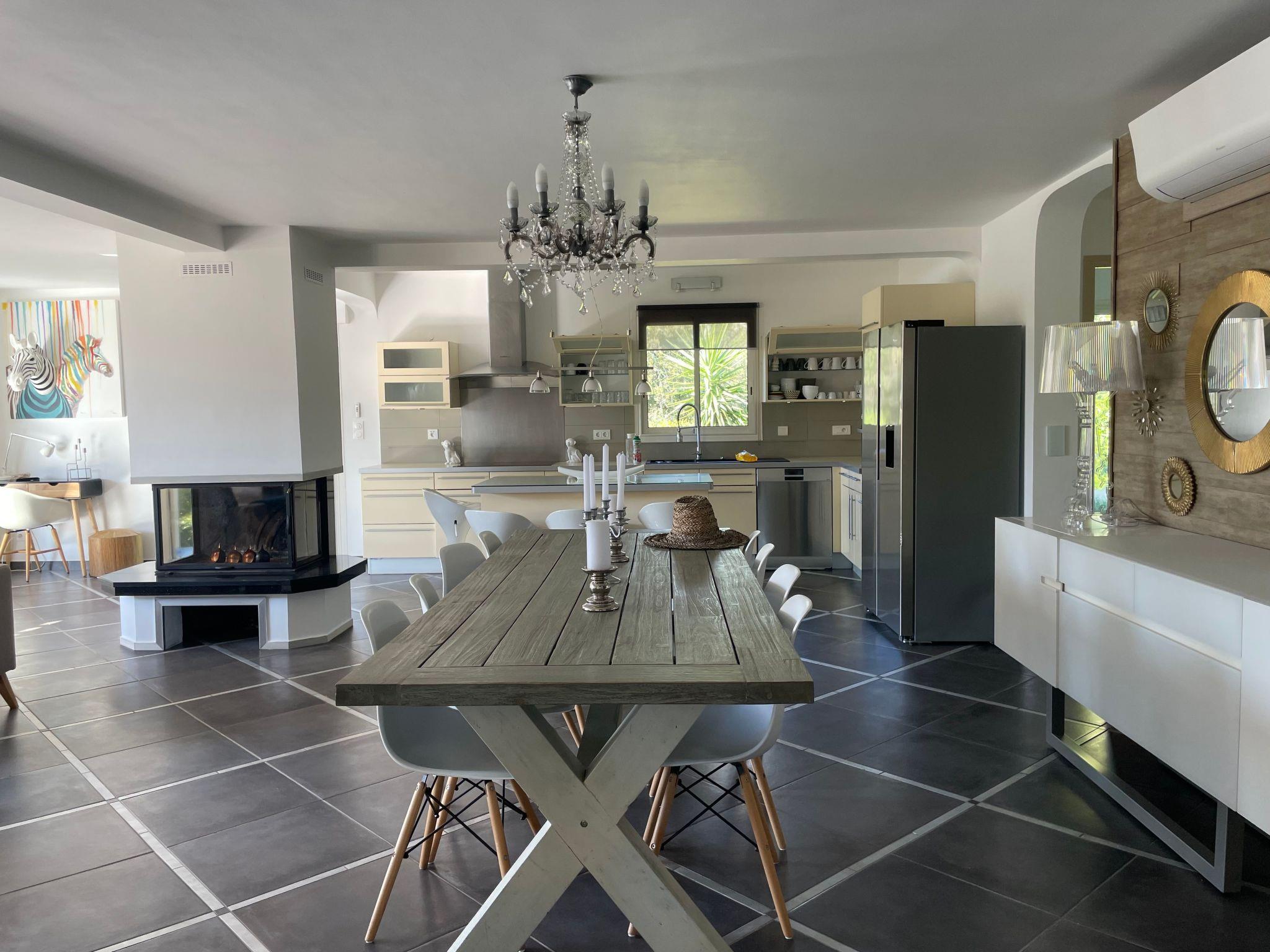 Private grounds and terrace fully equipped with furniture: deckchairs, tables, chairs, outdoor lounge and pergola, as well as a fully equipped pool house with TV and outdoor kitchen.