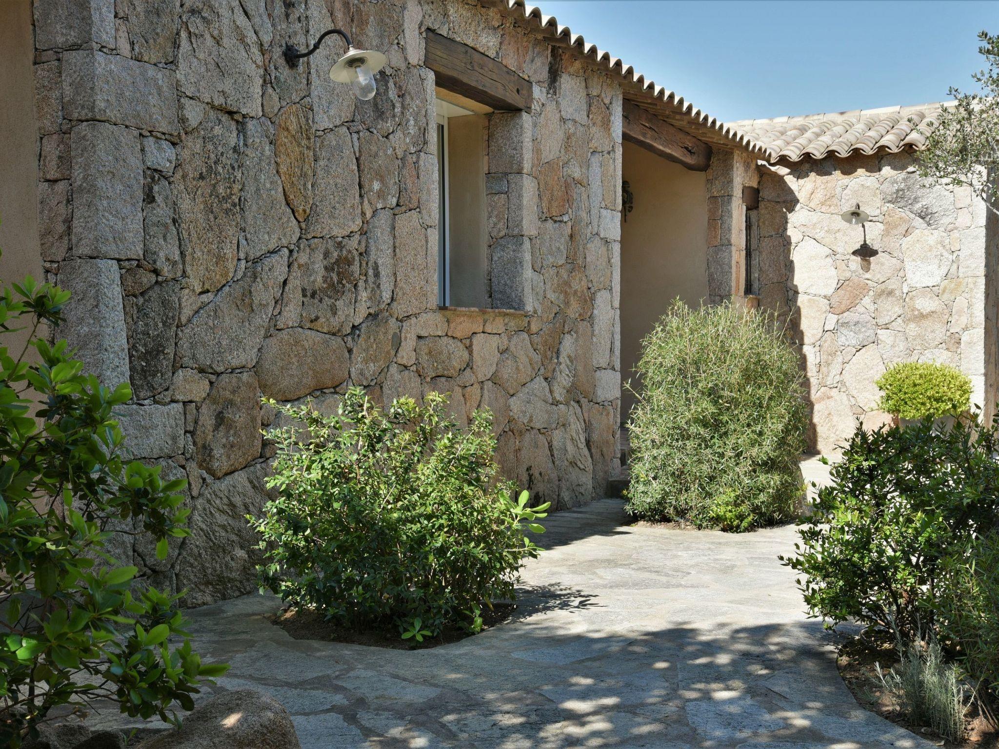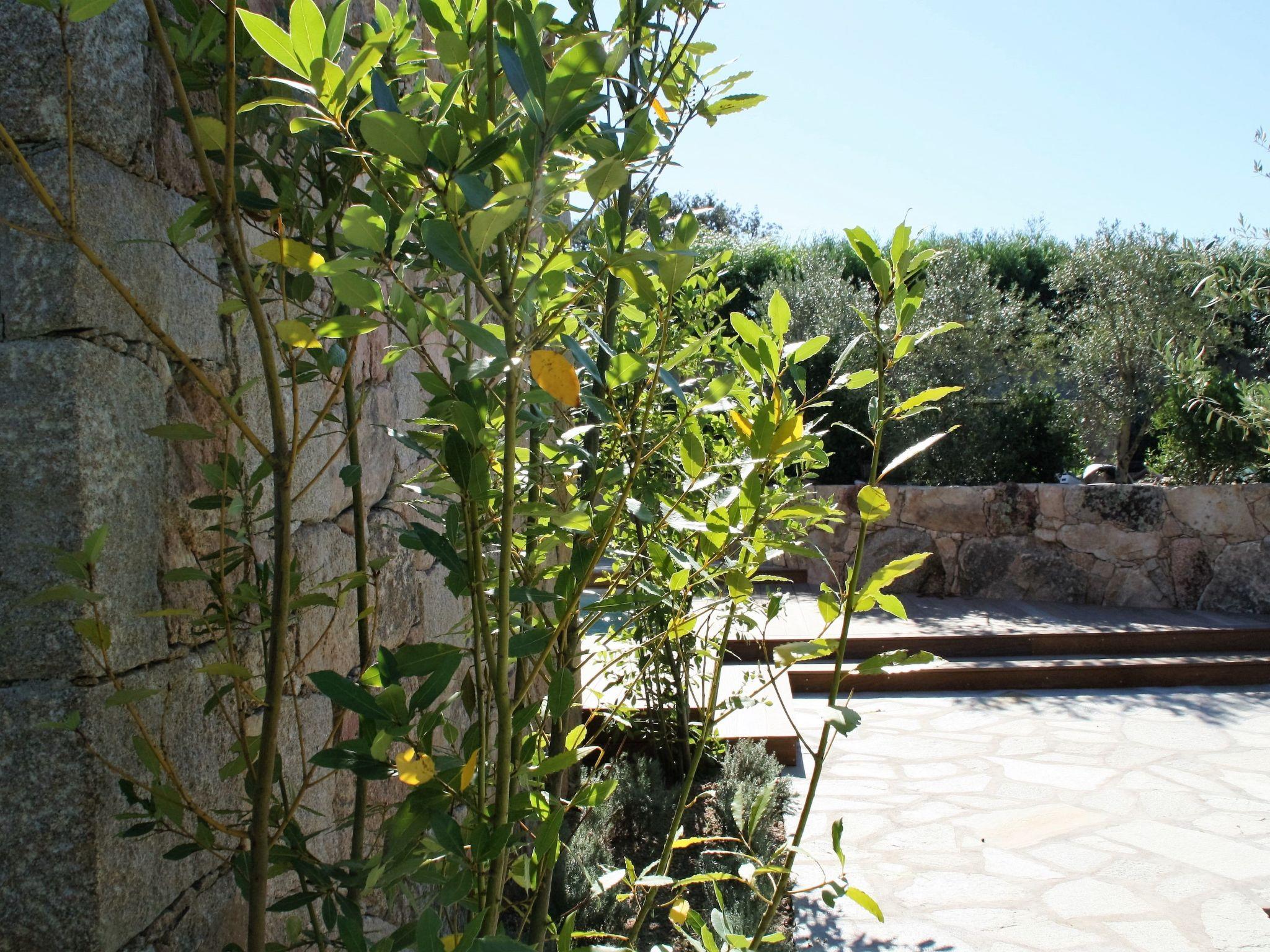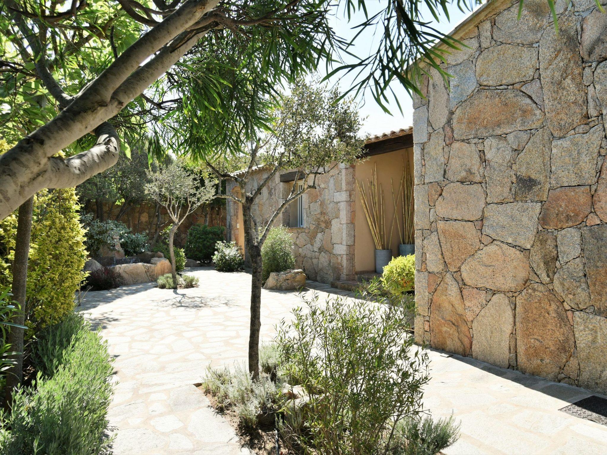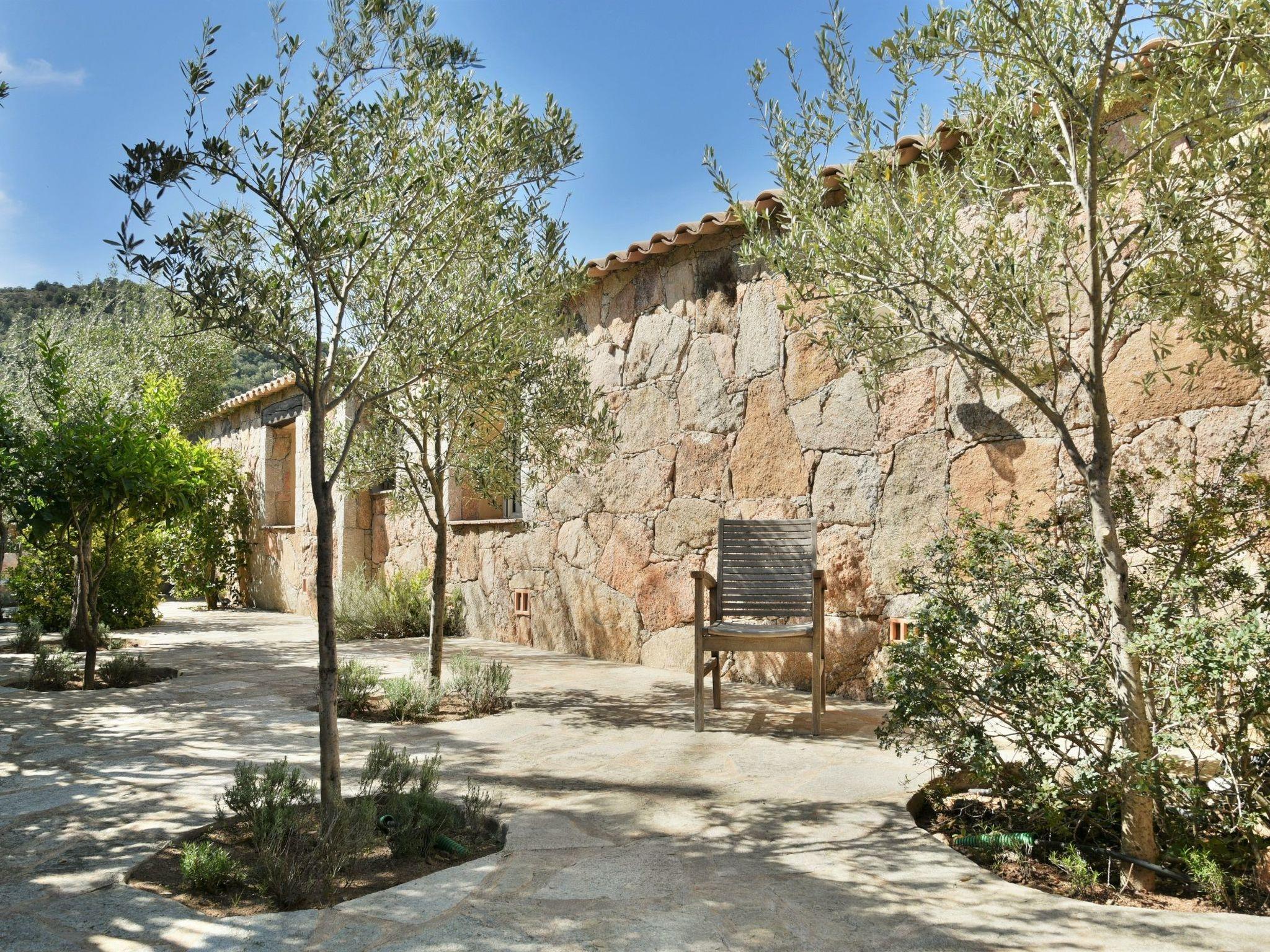 A paved garden and walkway surrounded by Mediterranean plants and trees with Corsican essences and scents.
