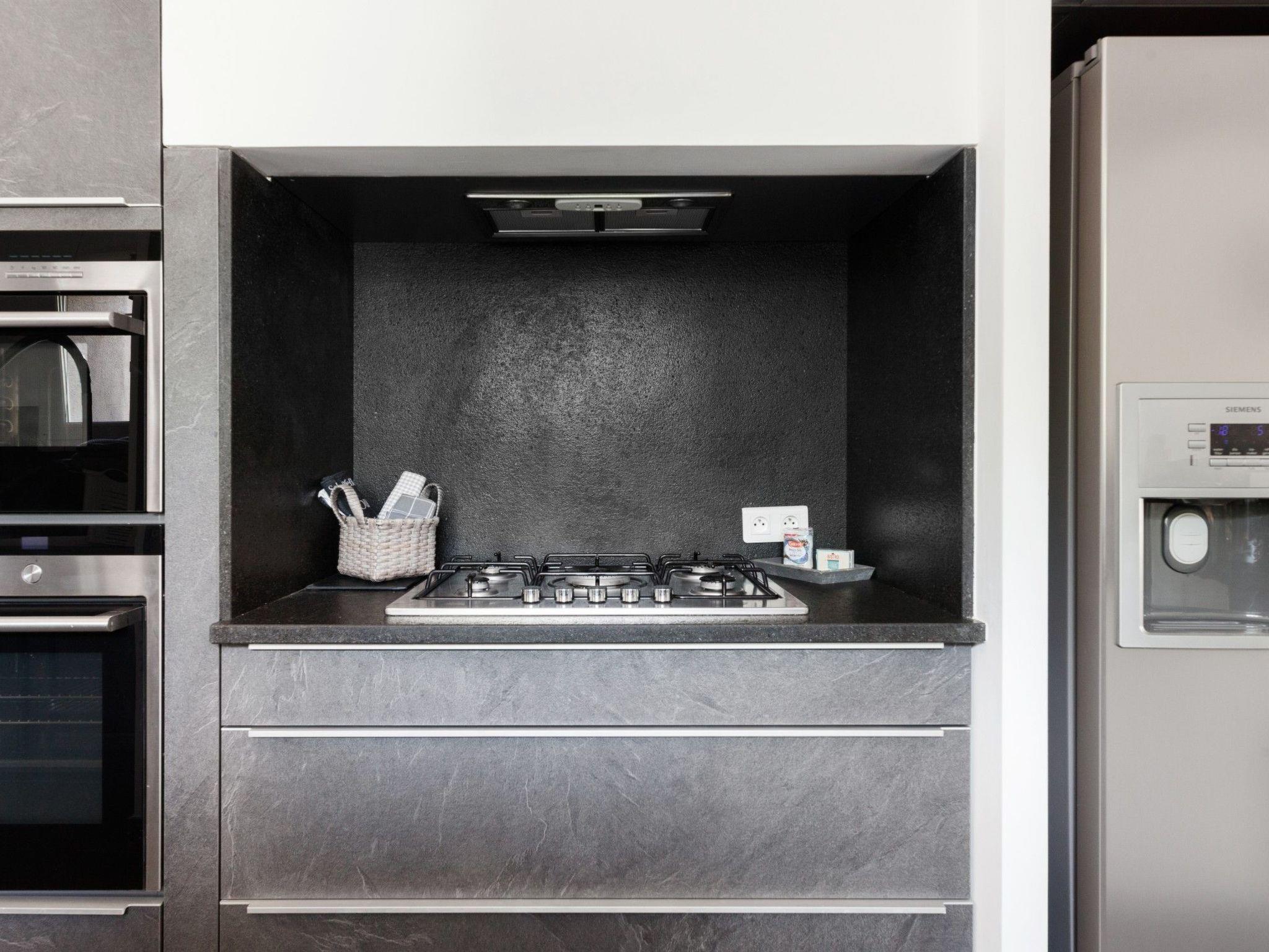 Modern kitchen with black granite worktop, top-of-the-range appliances, American fridge, Nespresso, blender, 5-burner hob, utility room with cupboard, washing machine, tumble dryer and sink.