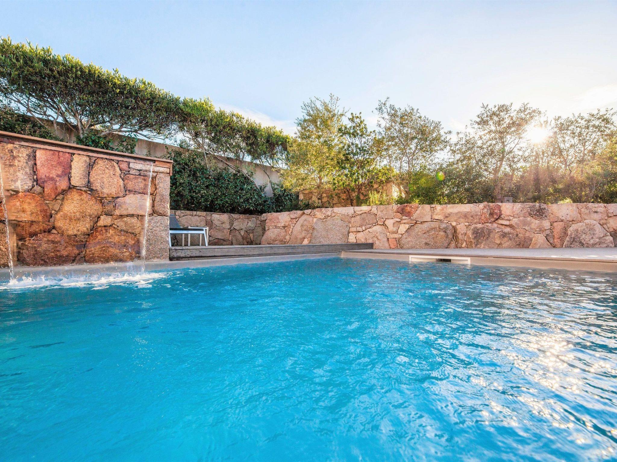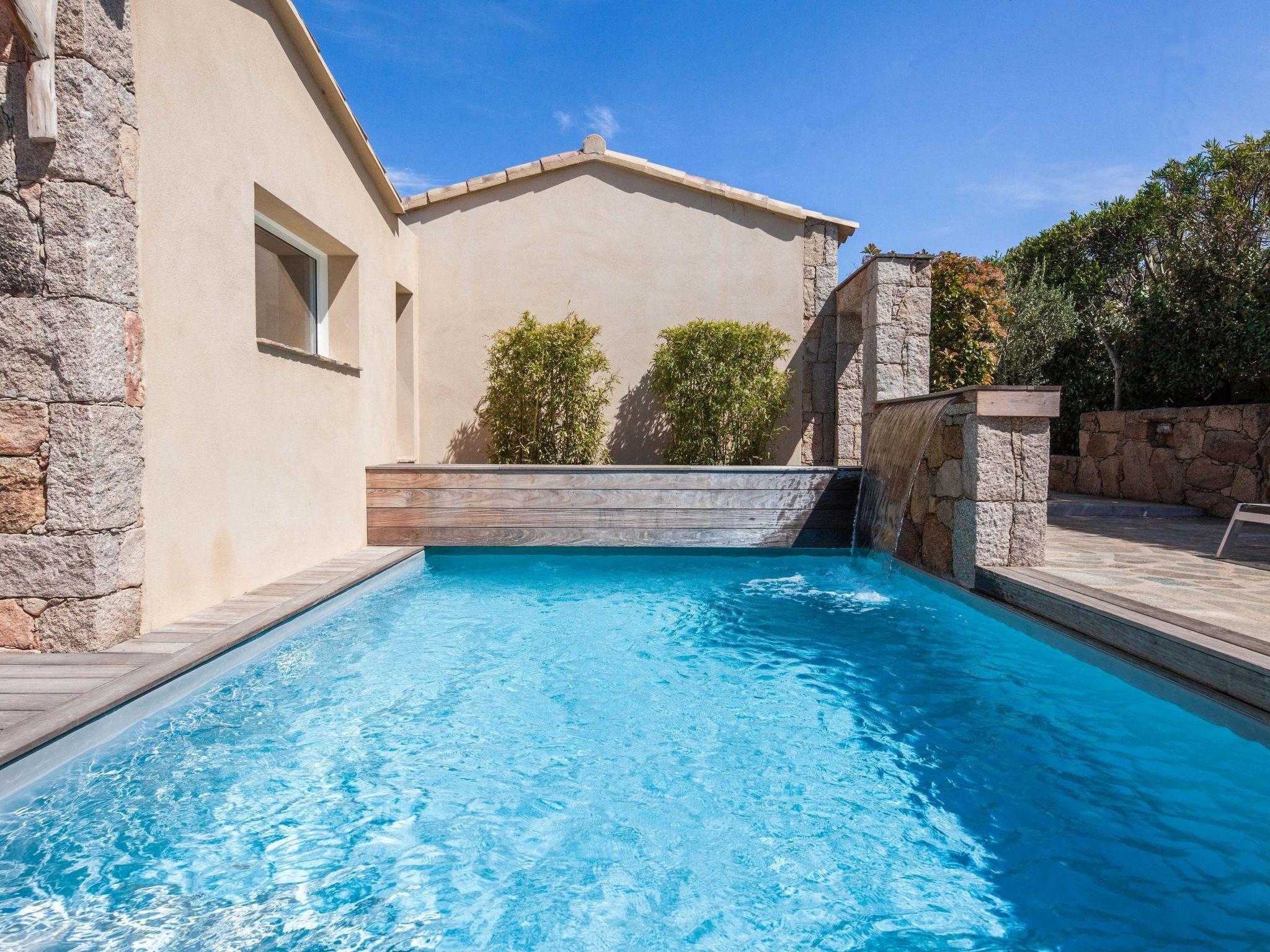 A swimming pool with cascading waterfall, south-facing, private, heated outside the summer period, secured by an electric curtain.
