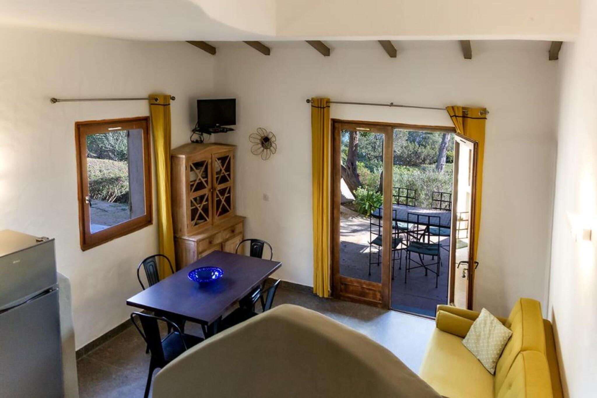 Morgenerne begynder med blødt korsikansk lys, der filtrerer gennem træerne, de fjerne bølger og duften af varm fyr i luften. Denne villa, der ligger på kystnære U Paviddonus grund, tilbyder en blanding af natur, komfort og ubekymret middelhavsliv - ideel til par, venner eller familier, der rejser sammen. Hjemmet har plads til op til 4 gæster og har en komfortabel opholdsstue med sofa, tv og spisebord samt et fuldt udstyret køkken til fælles måltider. To soveværelser med en dobbeltseng i hvert værelse tilbyder rolige hvileområder, mens et fælles badeværelse holder tingene praktiske, plus et toilet. Gennemtænkte detaljer som aircondition, Wi-Fi, lyse vinduer og parkering på stedet sikrer et problemfrit og behageligt ophold. Selve ejendommen indbyder til rolige dage med en fælles swimmingpool, en enorm træterrasse med liggestole, en restaurant og bar ved vandet og en privat anløbsbro, hvor du kan glide direkte ud i havet. Uanset om du foretrækker lange svømmeture, solbadning, cocktails ved solnedgang eller blot at vandre på stierne i skyggen af palmer, er omgivelserne ubesværet afslappende. Til udflugter er du tæt på Korsikas legendariske strande - Palombaggia, Santa Giulia og Rondinara, samt Porto-Vecchios gamle bydel, lystbådehavn og aftenpromenader. Vandsport, bådture og naturskønne kystture byder på masser at fylde dine dage med. Vend hjem, mens himlen bliver gylden, tænd op i en grill, del et måltid udendørs og nyd enkelheden ved en veltilbragt dag. Denne villa giver dig ikke bare et sted at bo - den giver dig et hjørne af Korsika, der føles som dit eget.