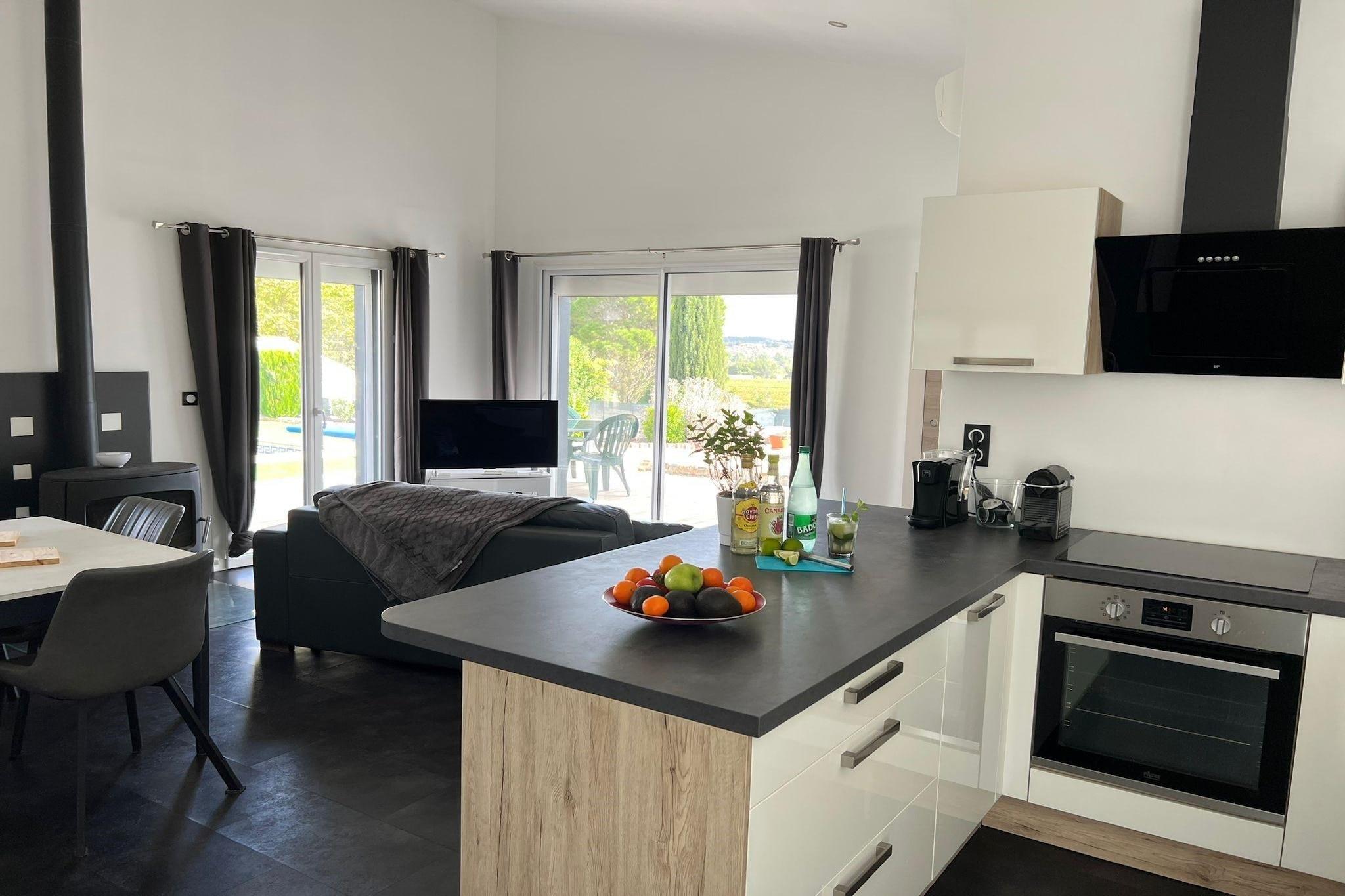 Bygget i 2022, denne elegante 2-værelses villa i Soleil d'Oc-Pouzols tilbyder en fredfyldt flugt med stilfulde møbler, en privat swimmingpool og en master suite med et luksuriøst boblebad til to. Den åbne planløsning og spisestue flyder ind i et fuldt udstyret køkken, perfekt til at tilberede måltider med lokale råvarer fra det nærliggende marked i Olonzac. Beliggende på en rummelig grund på 3500 m² sikrer boligen privatliv og panoramaudsigt over Minervois-dalen og de omkringliggende vinmarker. Placeringen er ideel for både kultur- og naturelskere. Udforsk den middelalderlige charme ved Minerve, en af Frankrigs smukkeste landsbyer, eller tag en naturskøn køretur til Gruissan for at se flamingoer og slentre gennem dens saltværk og gamle bydel. Narbonnes havn er perfekt til at hente frisk fisk, mens Carcassonne, kun 41 km væk, byder på en eventyrlignende oplevelse med sine befæstede mure og tårne. For et unikt eventyr, krydstogt Canal du Midi i en traditionel træ "Gabarre" fra Saint-Nazaire-d'Aude. Når du er klar til at spise ude, kan du nyde et hyggeligt måltid på Pizza Loreggia i Pouzols-Minervois eller forkæle dig med raffineret fransk køkken på Restaurant Bastide de Cabezac i Bize-Minervois. For en fredelig eftermiddag kan du slappe af i haven ved L'Olivier, et nærliggende hytte-tilflugtssted, eller tage børnene med til den naturskønne Como Park Zoo & Conservatory for en blanding af natur og sjov. Denne villa er en perfekt blanding af moderne luksus og autentisk sydfransk charme.